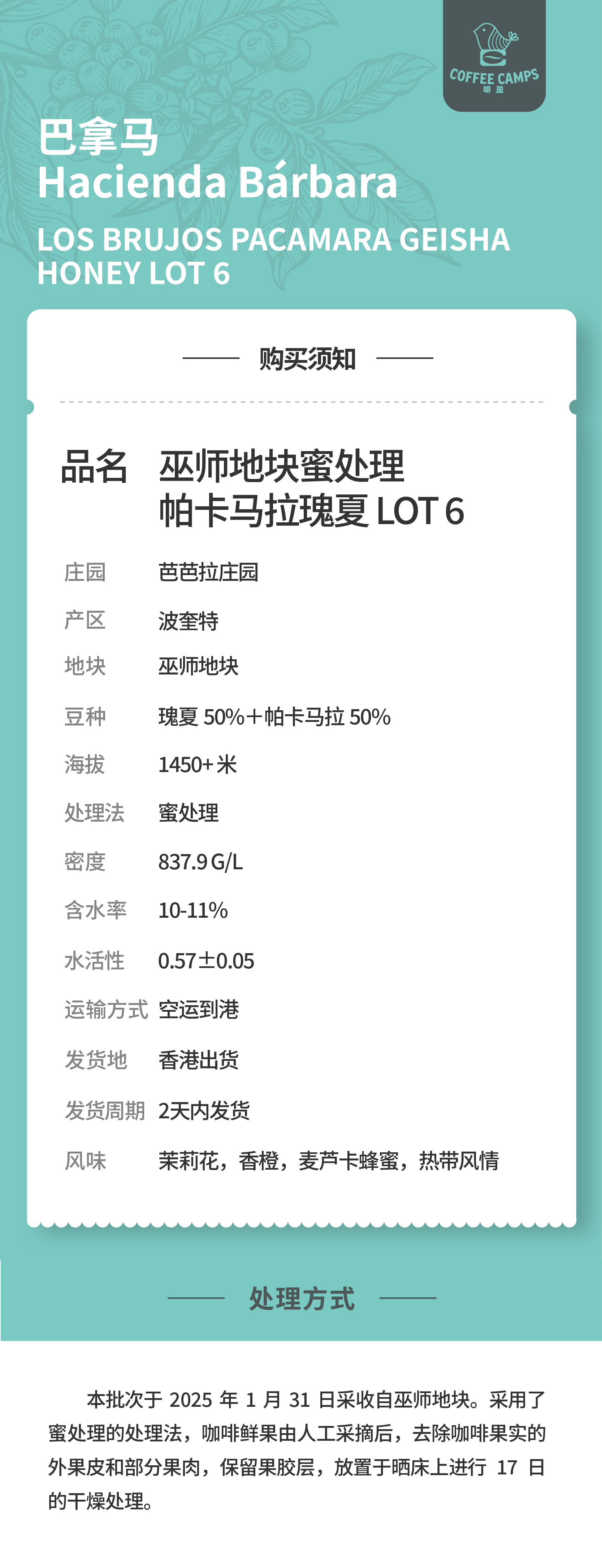 25产季 巴拿马 芭芭拉庄园 Hacienda Bárbara 巫师地块 Los Brujos LOT 6 帕卡马拉瑰夏 蜜处理(生豆)空运批次