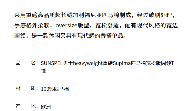 SUNSPEL男士经典款Supima匹马棉圆领经典T恤heavyweight 春夏休闲