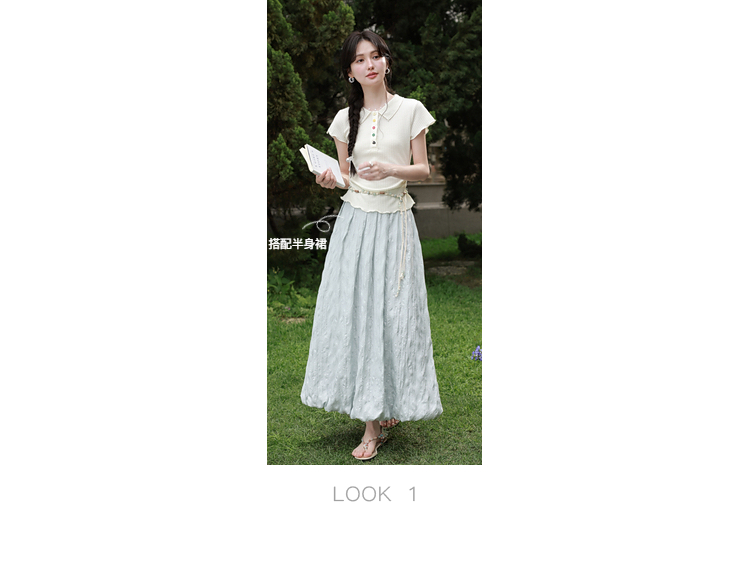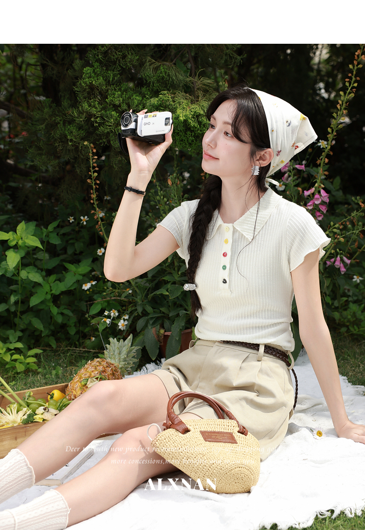 鹿向南「漫夏云茉」杏色POLO领正肩短袖T恤女夏季甜美木耳边上衣