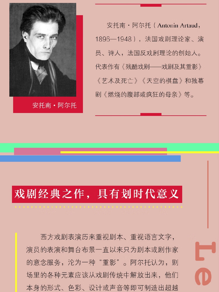 安托南·阿尔托(Antonin Artaud,1896—1948),法国戏剧理论家、演员、诗人,法国反戏剧理论的创始人。代表作有《残酷戏剧——戏剧及其重影》《艺术及死亡》《天空的棋盘》和独幕剧《燃烧的腹部或疯狂的母亲》等。