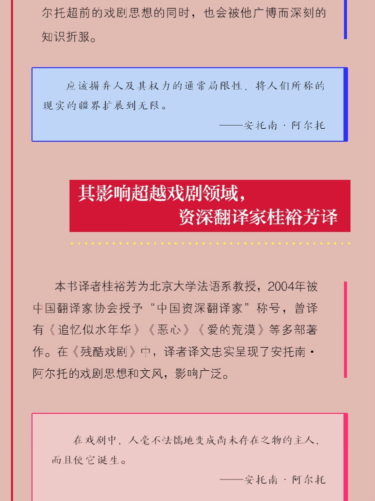 应该相信戏剧能给生活注入某种新的含义。在戏剧中,人毫不怯弱地变成尚未存在之物的主人,而且使它诞生。只要我们不满足于当简单的记录工具,那么尚未诞生的一切还会诞生。