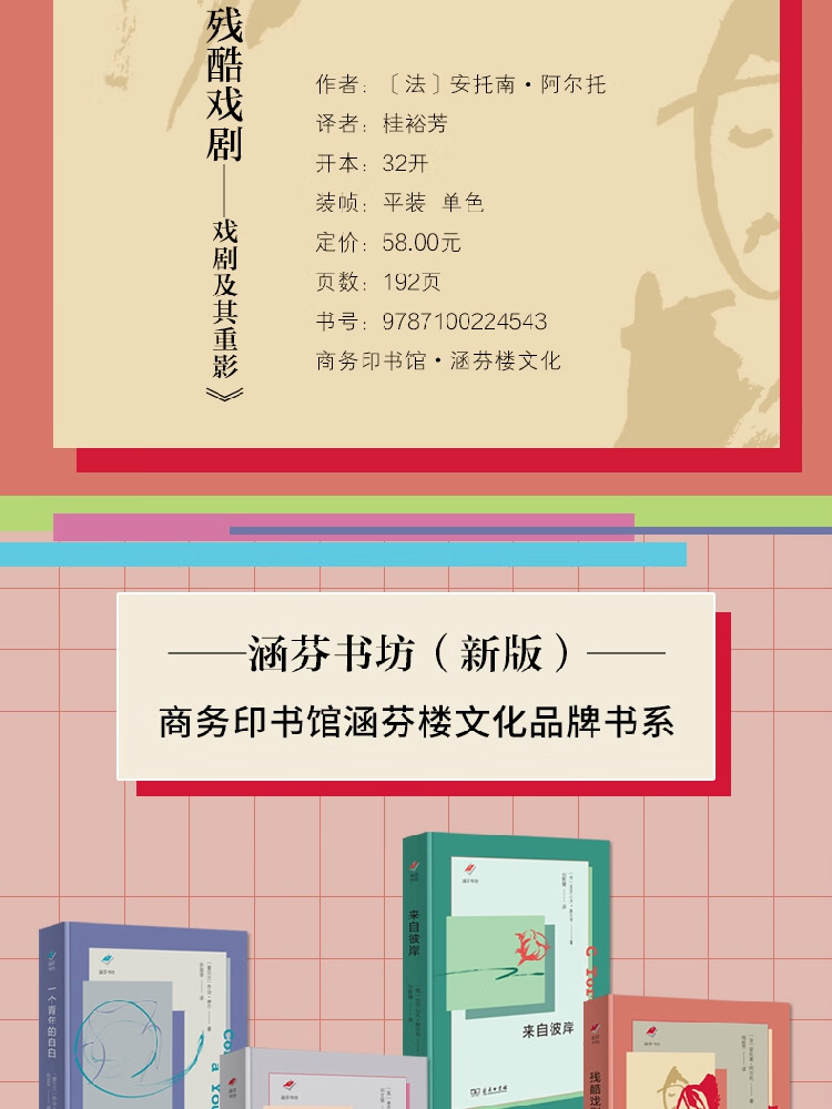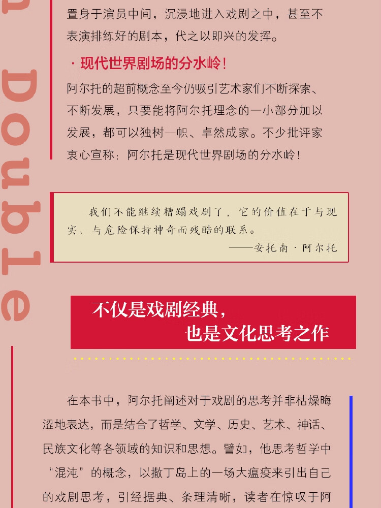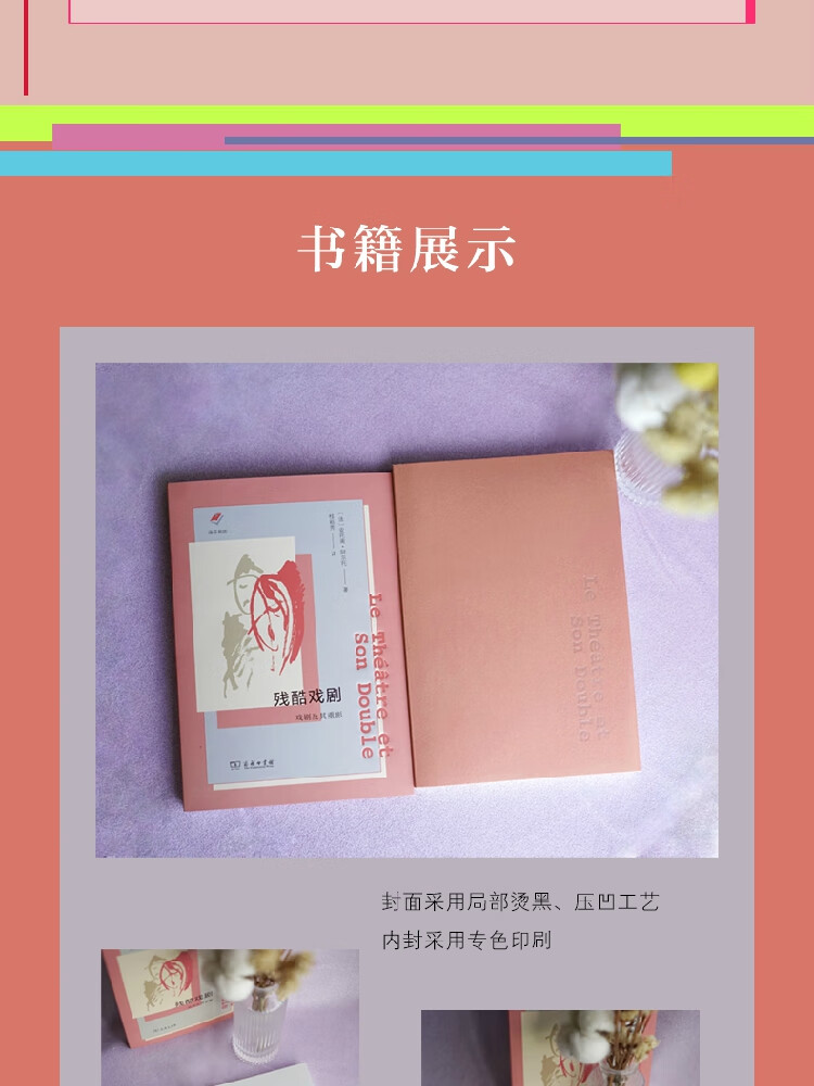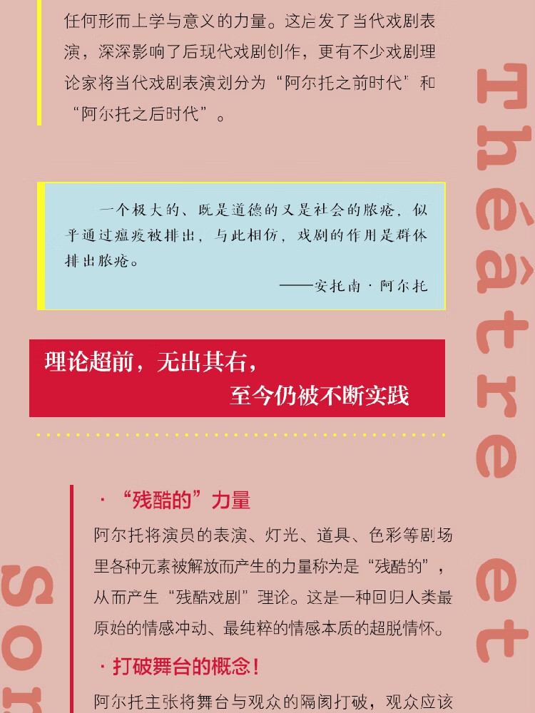 《残酷戏剧:戏剧及其重影》是法国戏剧大师安托南·阿尔托论述戏剧的经典文集,包括论文、讲座、宣言及信件。阿尔托在书中提倡戏剧应该是残酷的,应该表现生的欲望、宇宙的严峻以及无法改变的必然性。他主张戏剧的功力应该是使观众入戏,观众不应是外在的冷漠观赏者,舞台应与观众融为一体。他的戏剧主张对现代戏剧产生了巨大的影响,他在本书中提出的生活的残酷性理论,使其影响又远远超越了戏剧这一狭窄的领域。