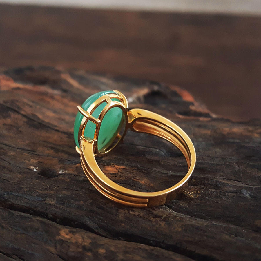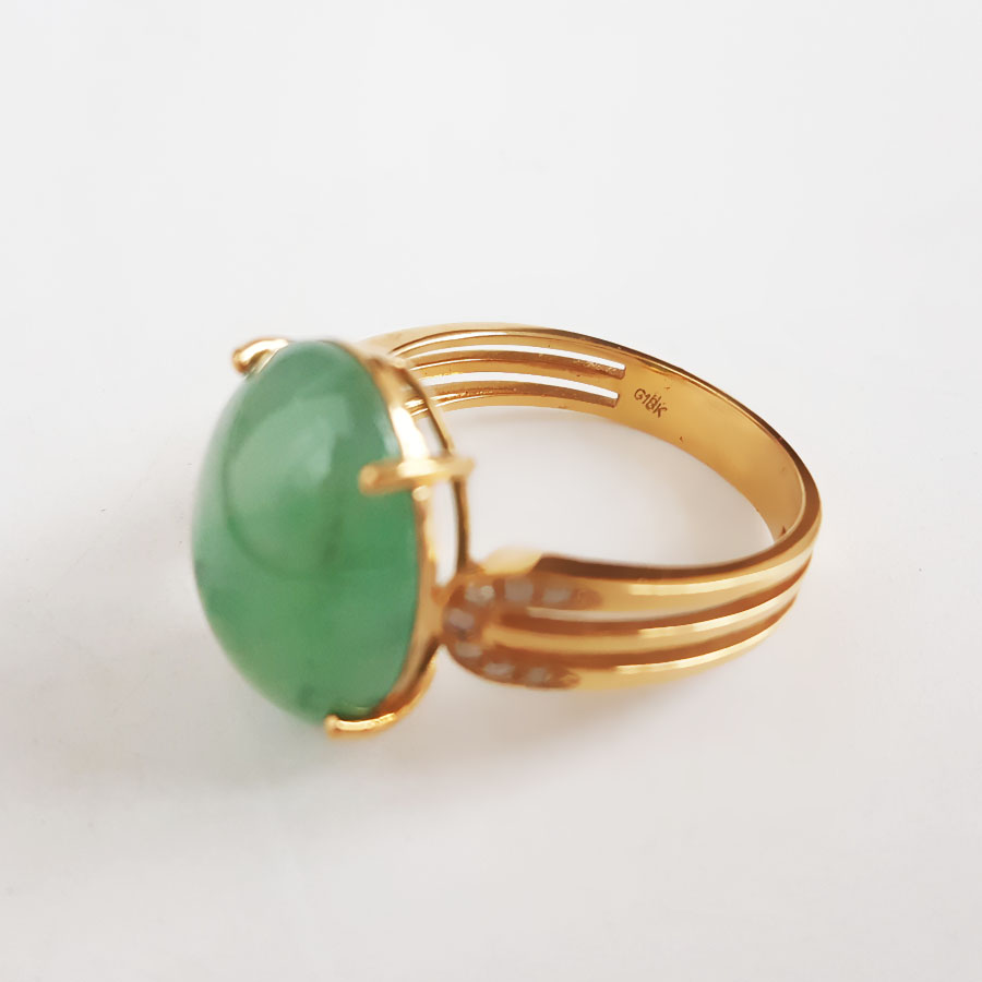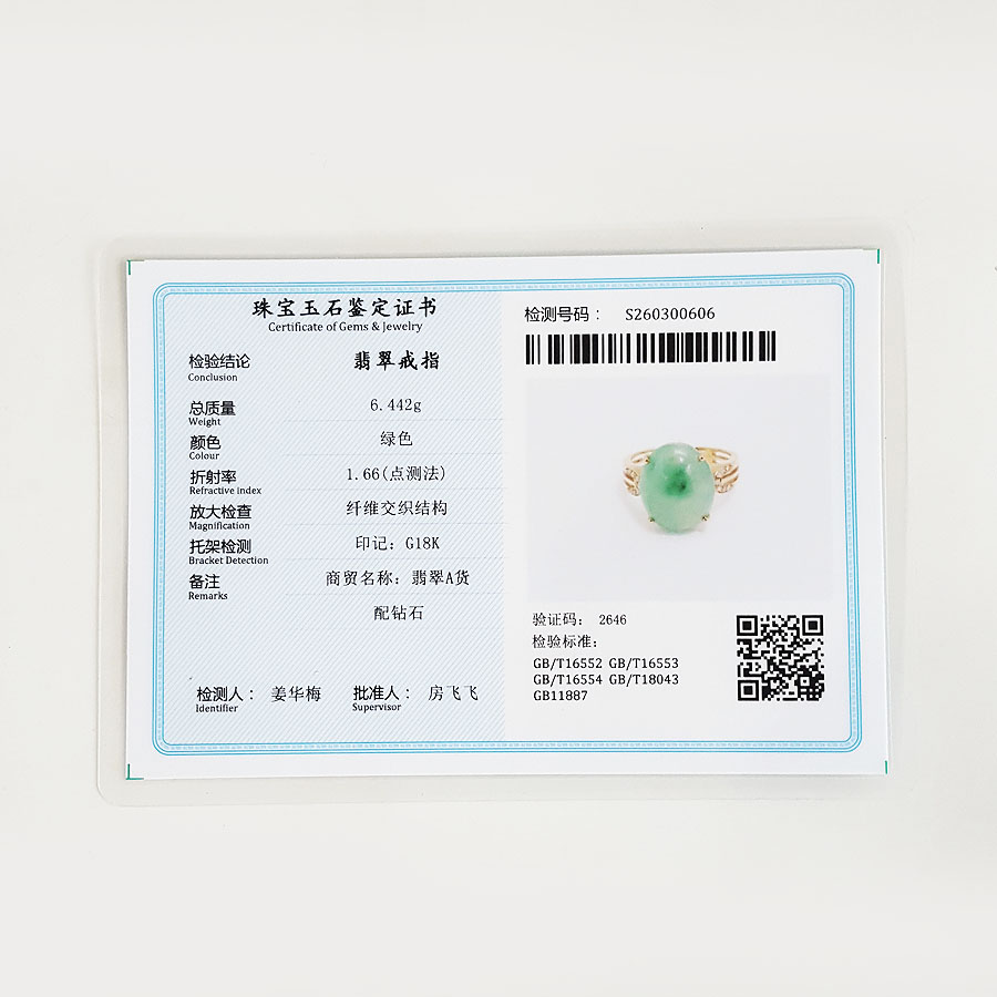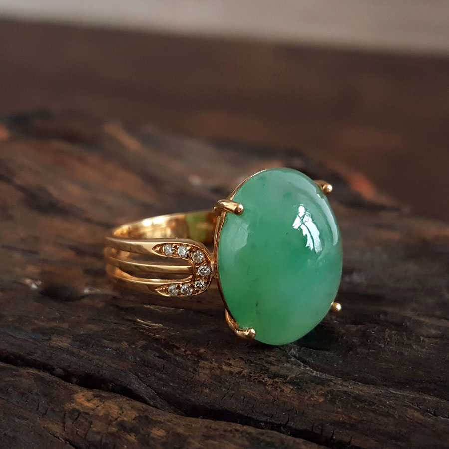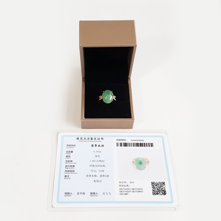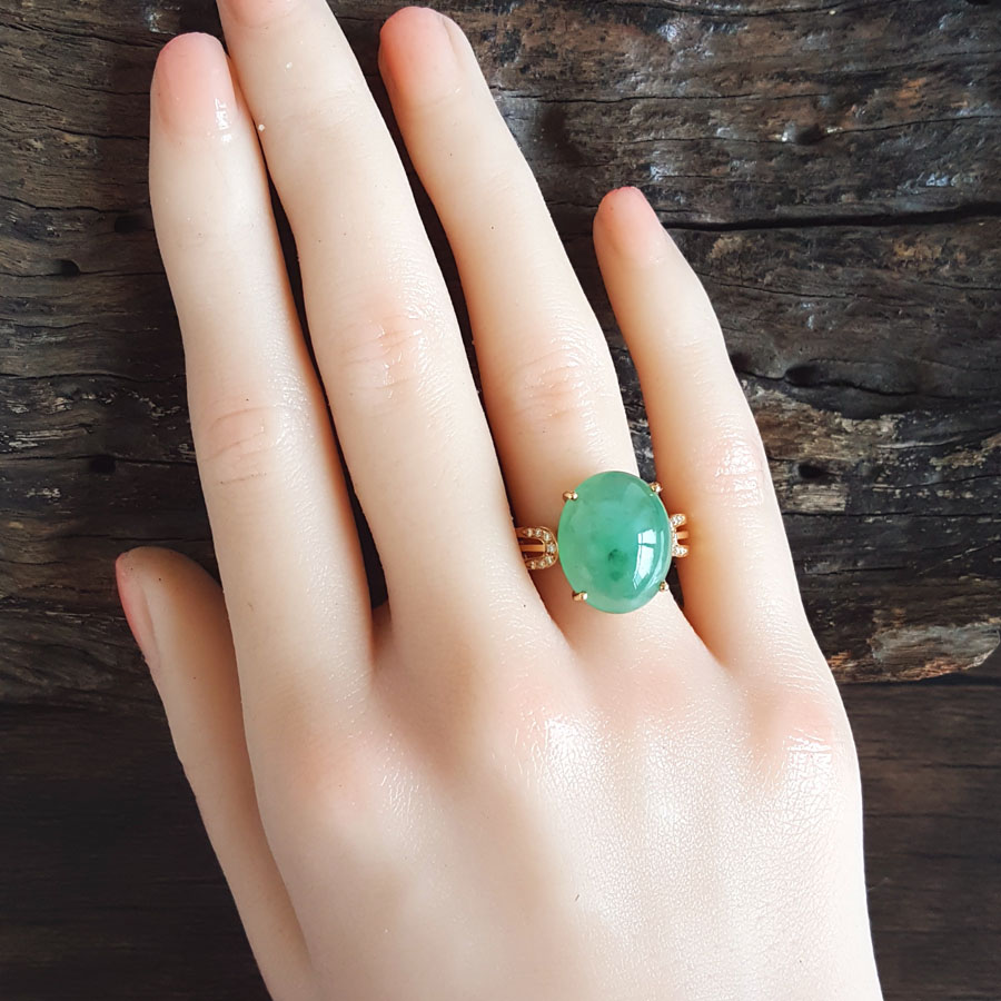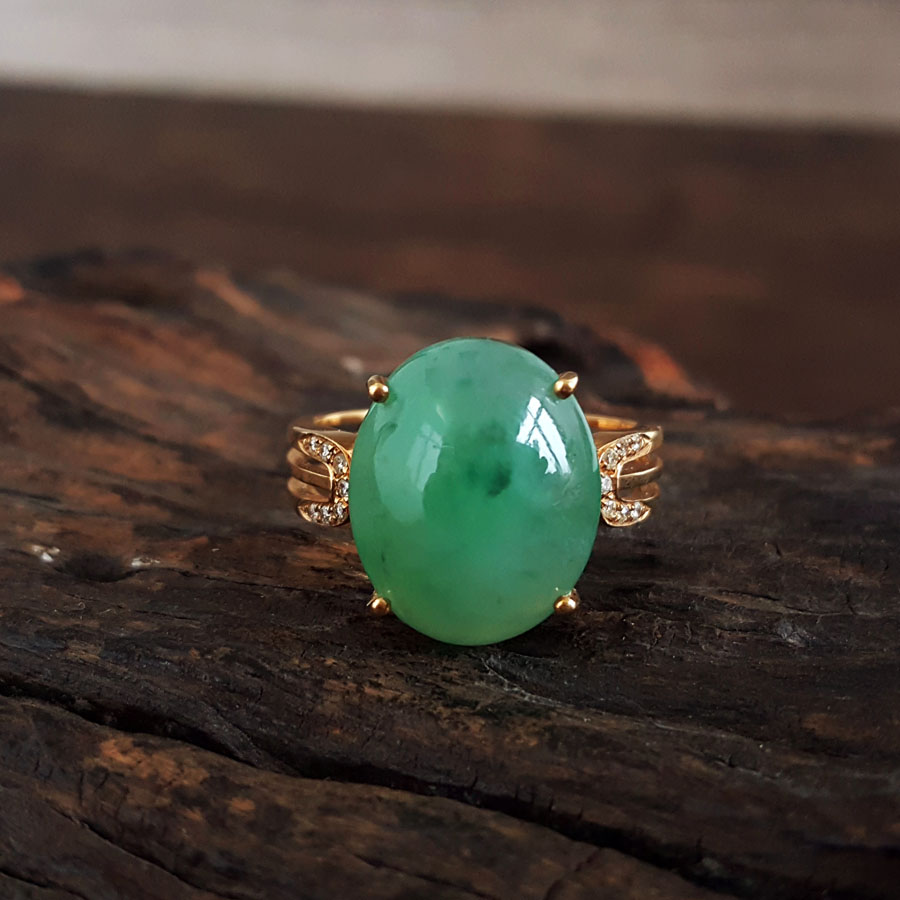 名称 | AU750黄金镶钻镶天然细腻满绿糯冰种蛋面翡翠戒指 |