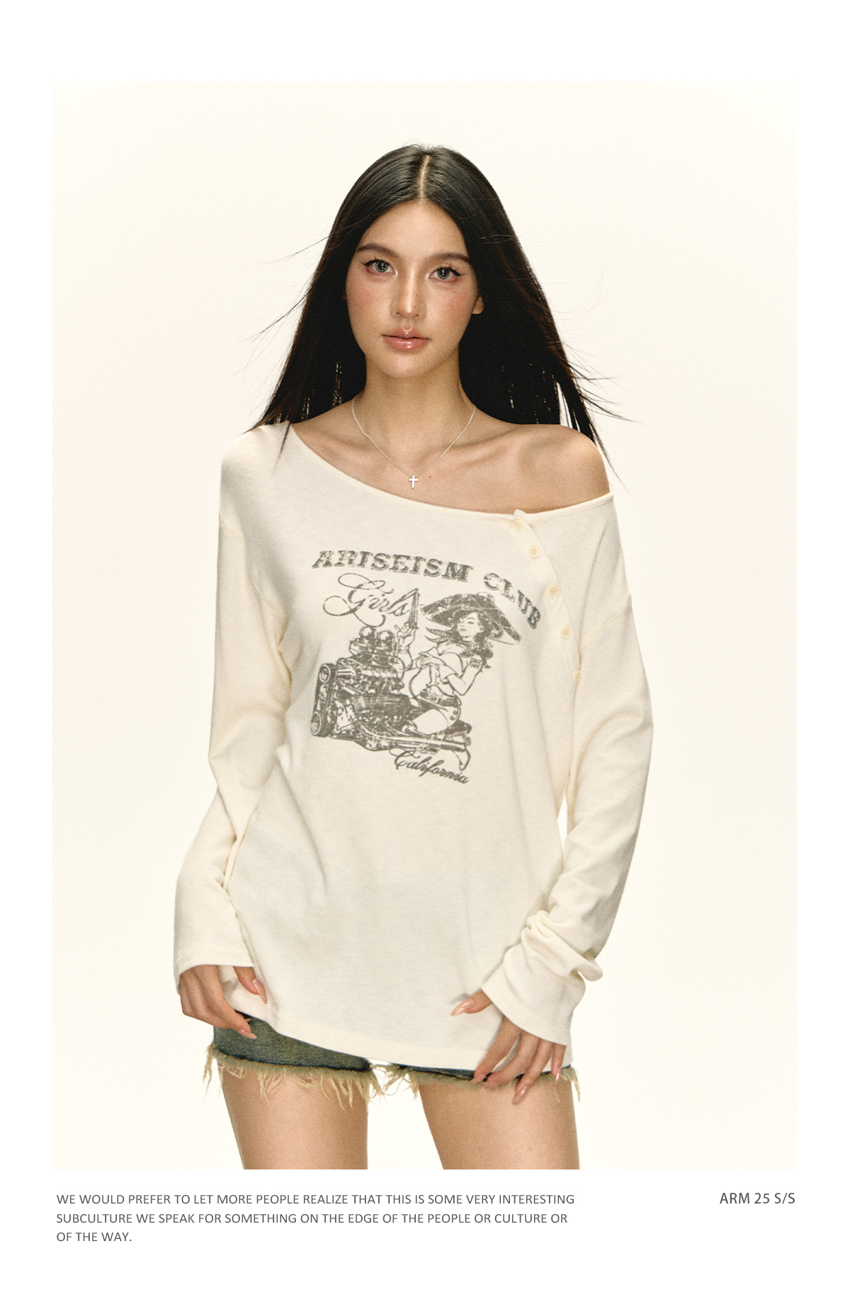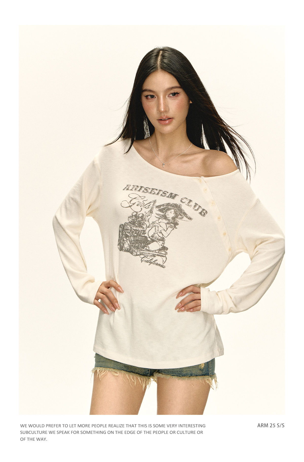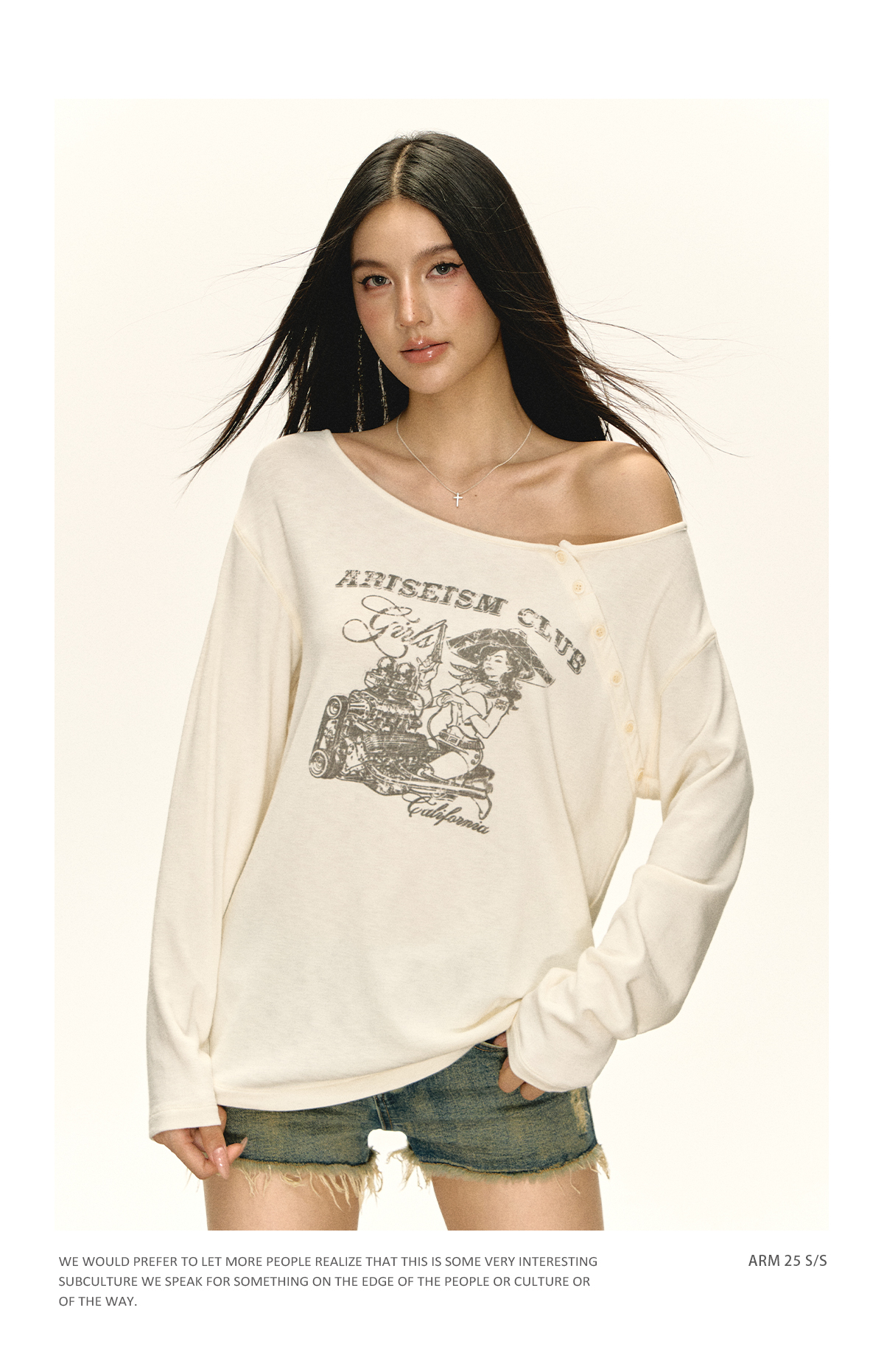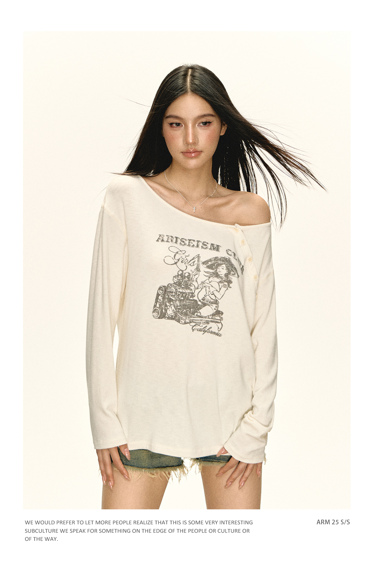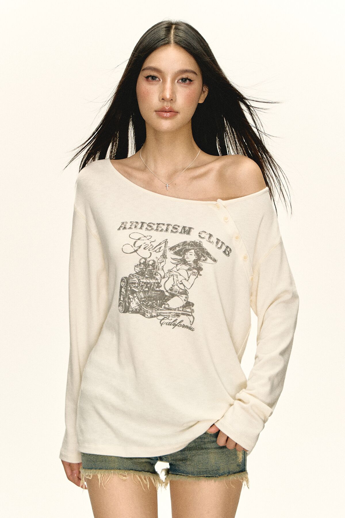 Ariseism 美式复古摩托修理工图案斜肩t恤女秋季新款修身上衣