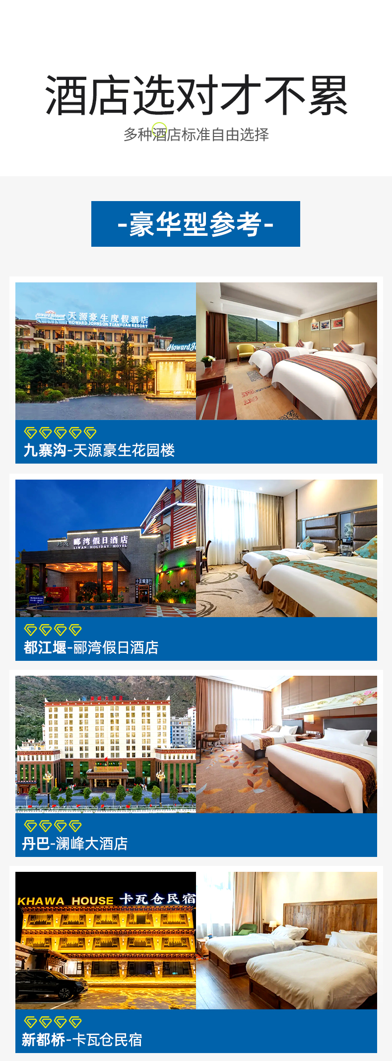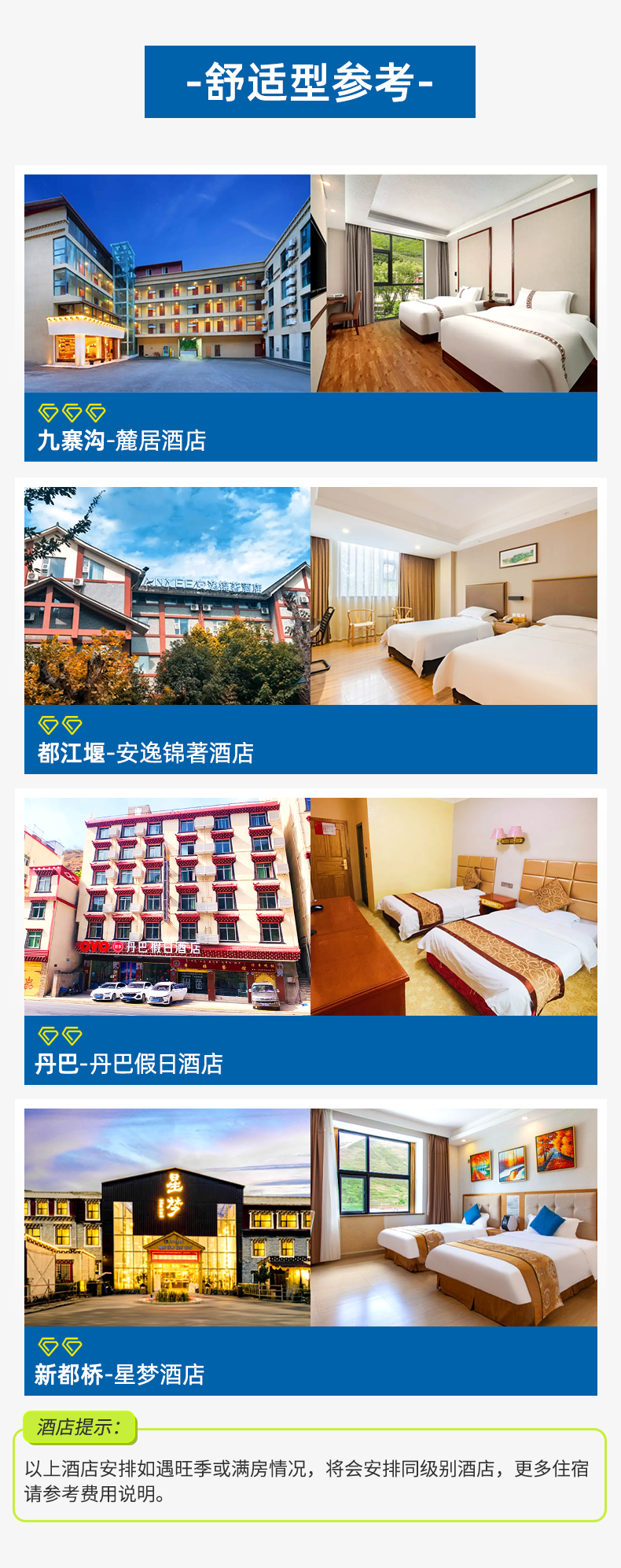 注:川西地区接待能力有限,酒店水平比不上发达城市水平,请勿以发达地区酒店水平来做比较,安排酒店会尽可能保证干净整洁,敬请谅解!