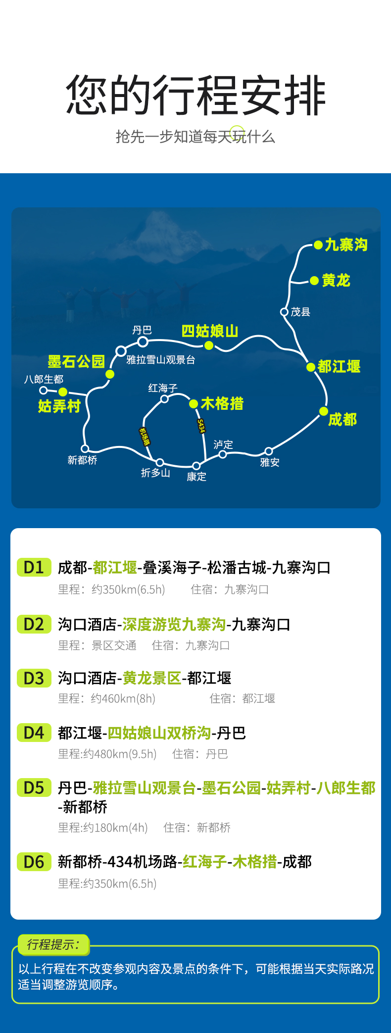 注:由于早上要从成都各个地方接人到指定地点集合上车出发,淡季(11月-次年4月)小车师傅会在出发前1-1.5小时开始接人,旺季(5月-10月)/节假日会在出发前2-2.5小时开始接人,故部分客人会提前1小时左右到达出发集合地点,请耐心等待,敬请谅解。