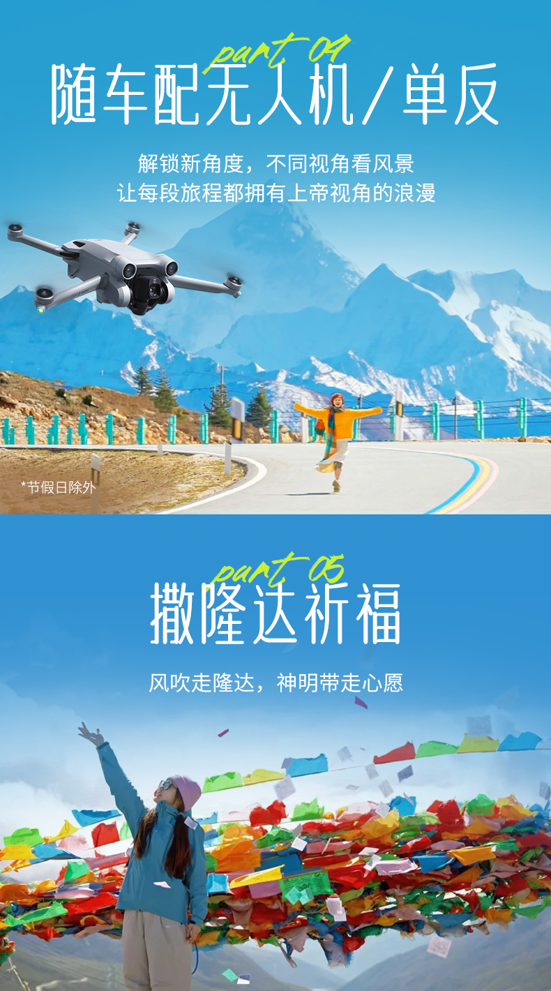 注:当天出发的车队配备无人机或单反,共享使用,旺季/节假日期间,单反/无人机随机安排不保证每车均配备,敬请谅解!