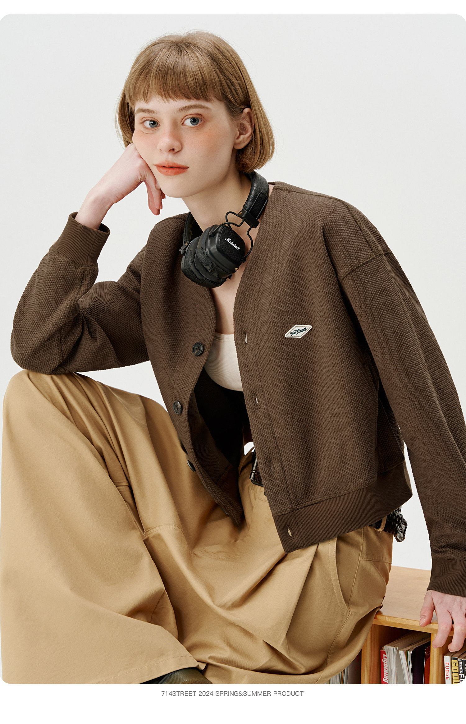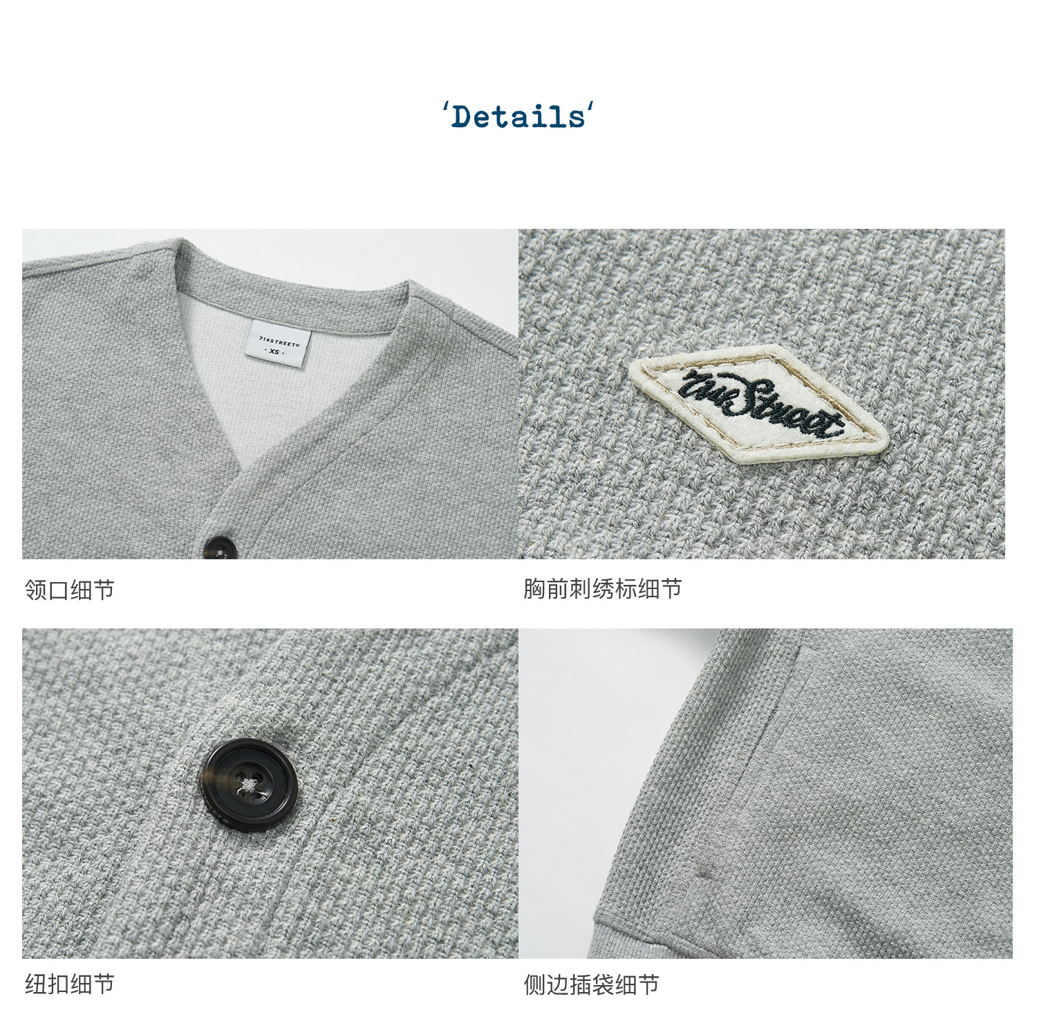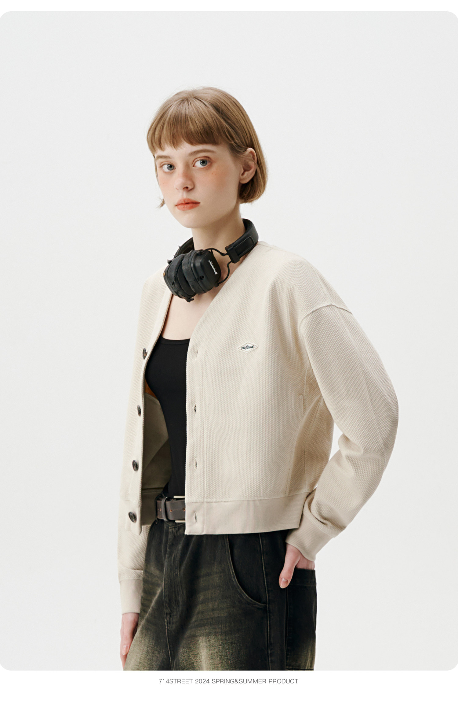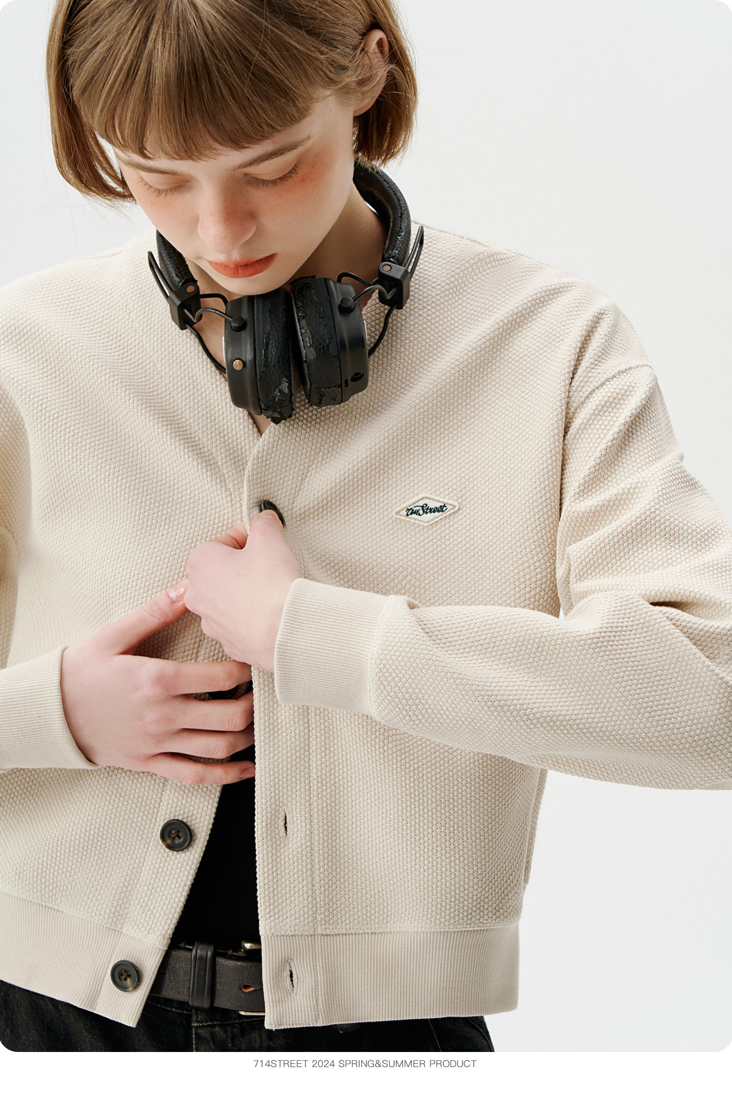 714street潮牌V领开衫外套女2024春秋新款情侣装休闲复古卫衣