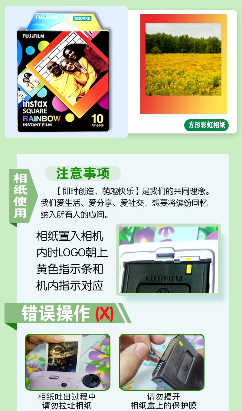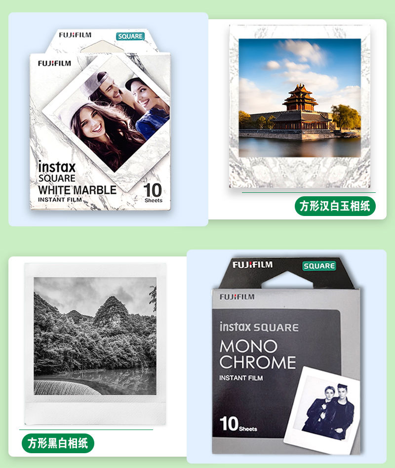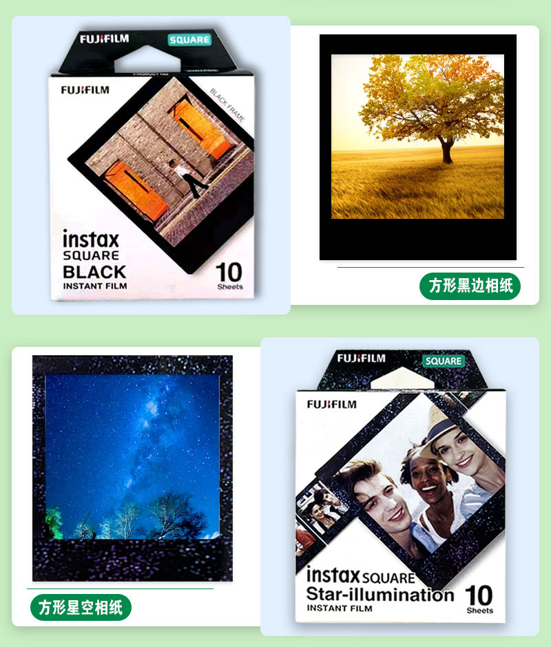 富士拍立得方形相纸适用于 SQ1、SQ6、SQ10 等相机,有白边相纸、彩虹星空汉白玉黑边花边相纸、黑白相纸、黑边相纸、新款日落晚霞方形 sunset 相纸、方形星空相纸。