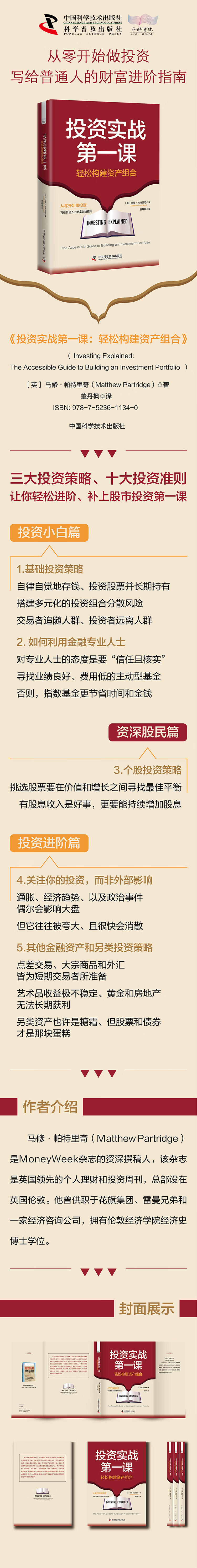本书从投资的基本知识开始讲解,比如储蓄、风险以及投资者心理的重要性。接下来,作者深入讨论了如何与金融专业人士合作,以及如何选择一只基金或投资信托。随后,本书讨论了如何选择个股,这部分更适合稍有经验的投资者(以及那些喜欢动手实践的人),具体策略包括:价值投资、成长投资,以及收益投资。最后,作者探讨了一些更进阶的领域,如通胀、政治事件、经济趋势对投资的影响;如何投资点差交易、外汇、大宗商品、黄金、房地产等金融资产,以及比特币和开放银行等另类投资品种。