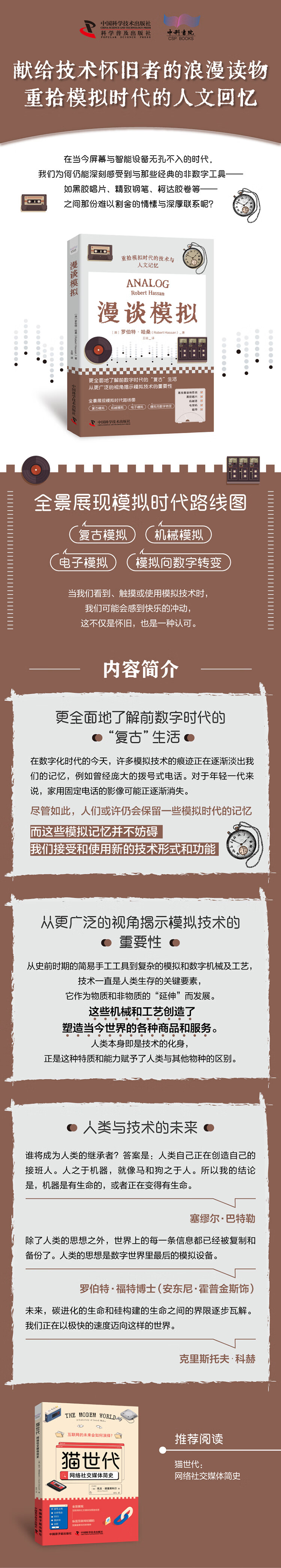 《漫谈模拟》深入探讨了模拟技术在人类历史与文化中的演变及其影响,从古老的文字、时钟到现代的电子模拟,揭示了技术在放大人类能力的同时,也带来了对真实性的反思及数字化带来的精神损失。书籍通过对艺术家的致敬,穿插了个人与技术的交织故事,展现了模拟技术在当代社会的独特地位与价值,呼吁人们重新审视和理解模拟技术及其在人类生活中的地位。