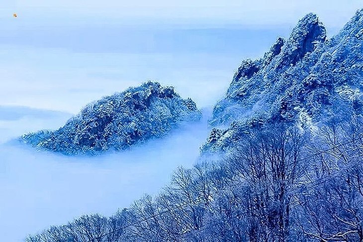 冬季的老君山降雪频繁,雪后常伴随着云海奇观,大小山峰、千沟万壑都淹没在云涛雪浪里,波澜壮阔,一望无边。