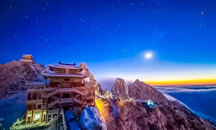 冬雪与松、石、云巧妙结合,配以晶莹冰挂、琉璃雾凇、宏伟金殿,将老君山装扮成绝美的人间仙境。