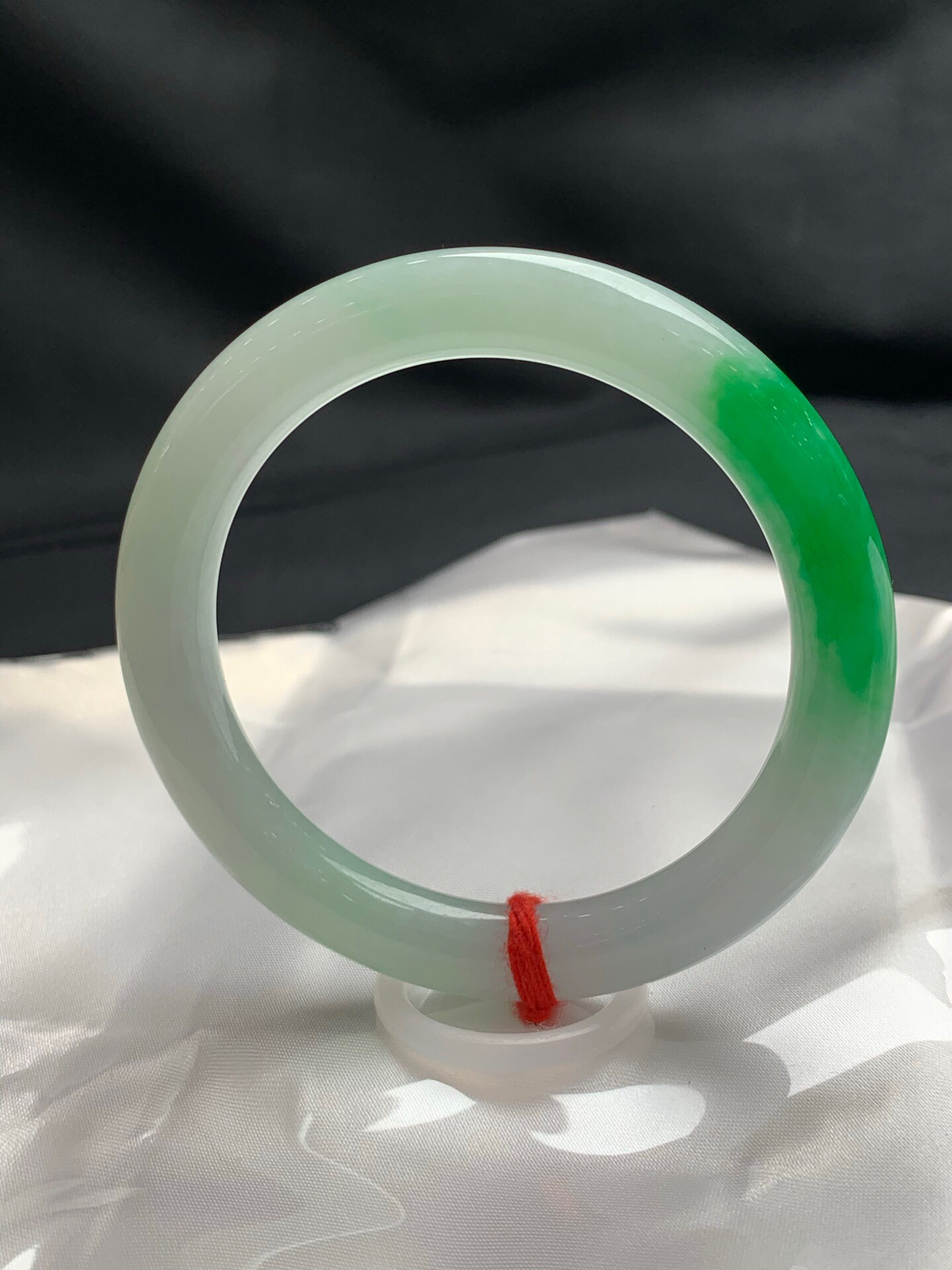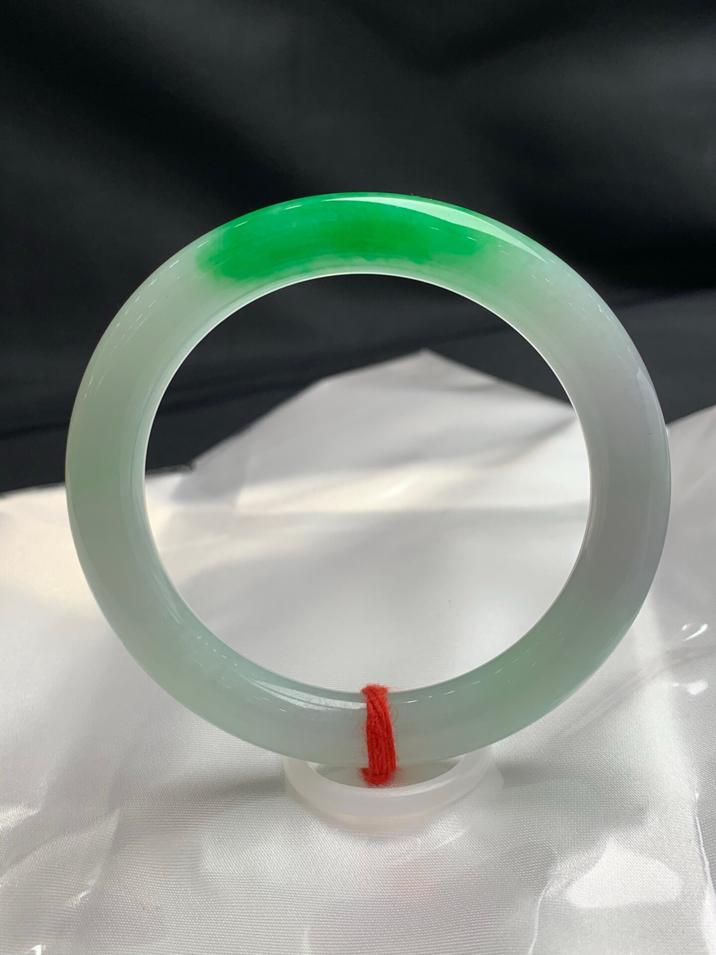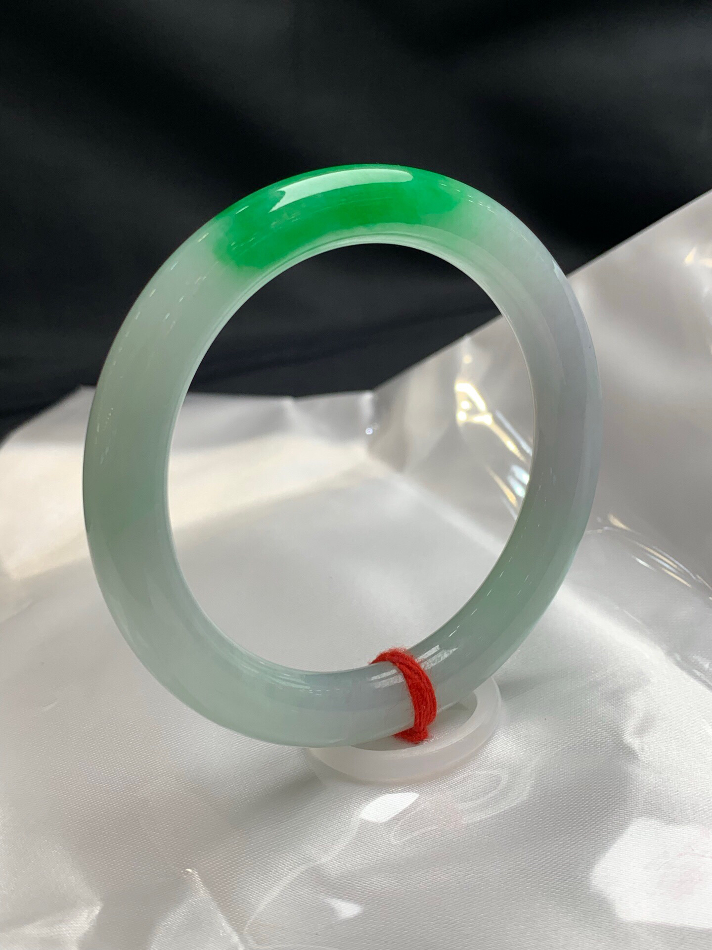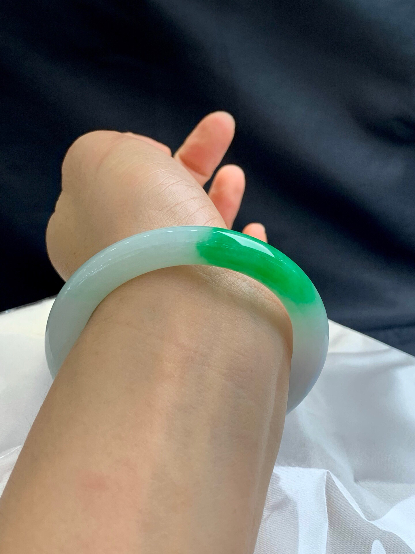 620642,56圈口,糯化飘绿细圆条美人条,淡绿底色飘一截正阳绿,色泽艳丽,底子细腻,侧边带黄翡,特色黄加绿
