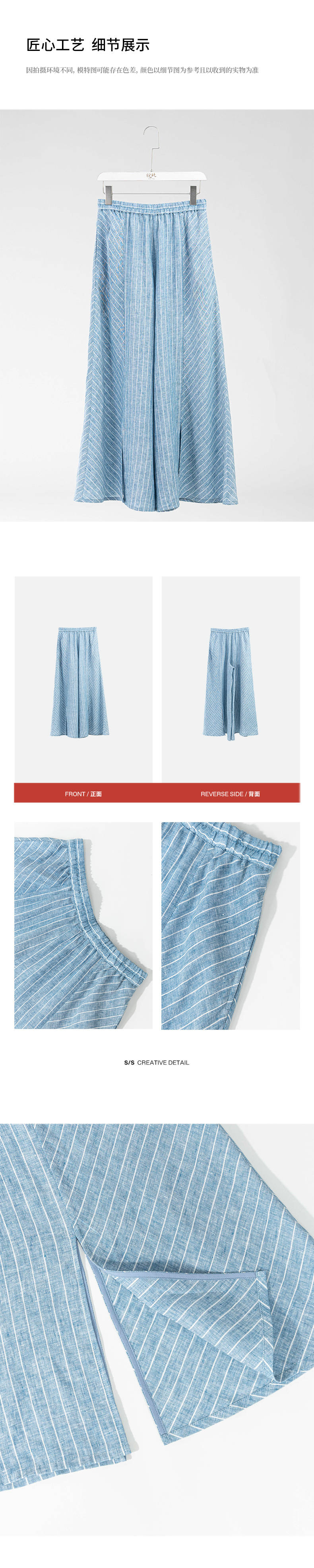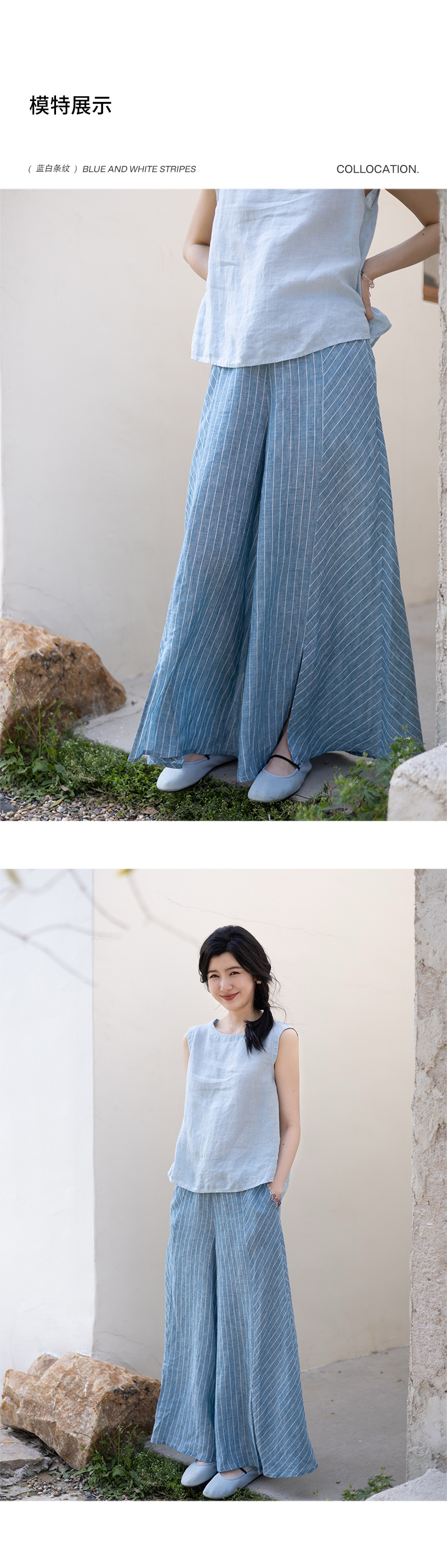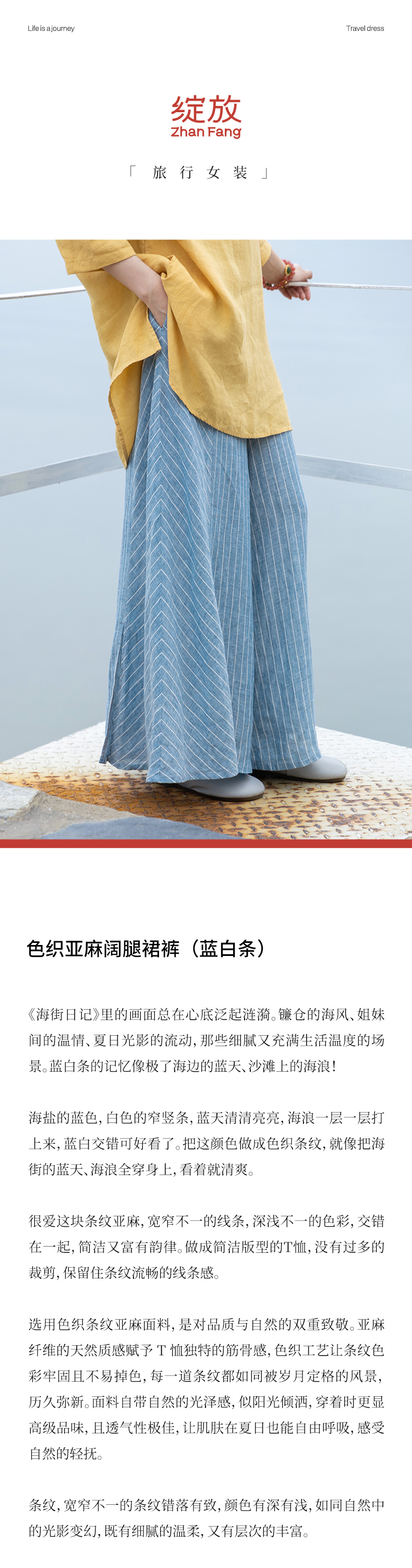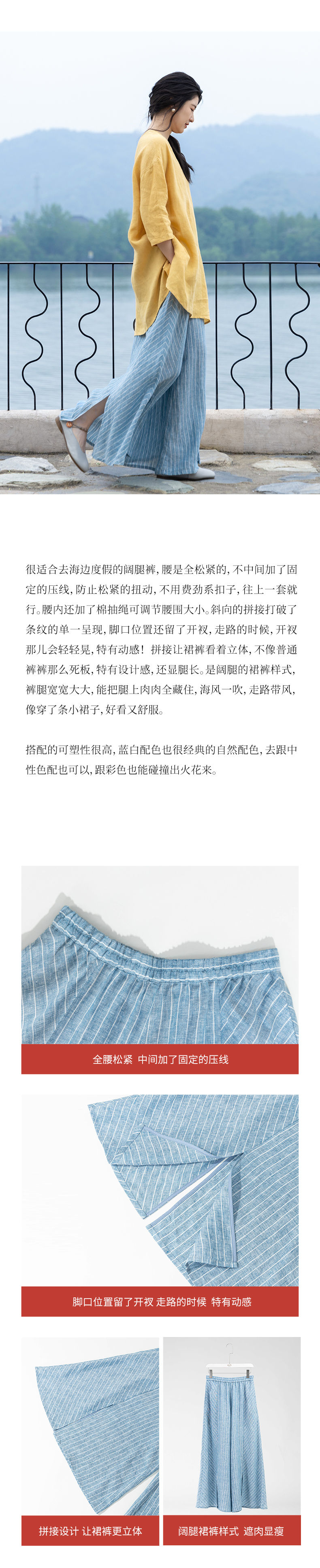绽放旅行女装351朵/【海街日记·蓝白条】色织亚麻阔腿裙裤松紧腰