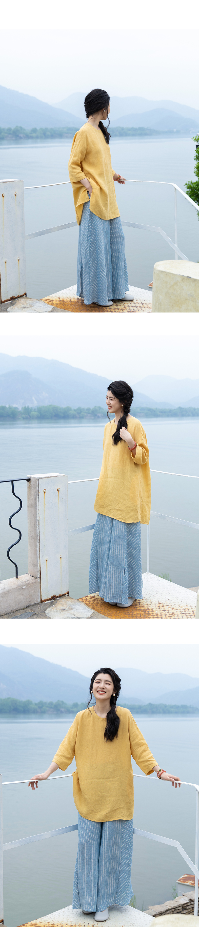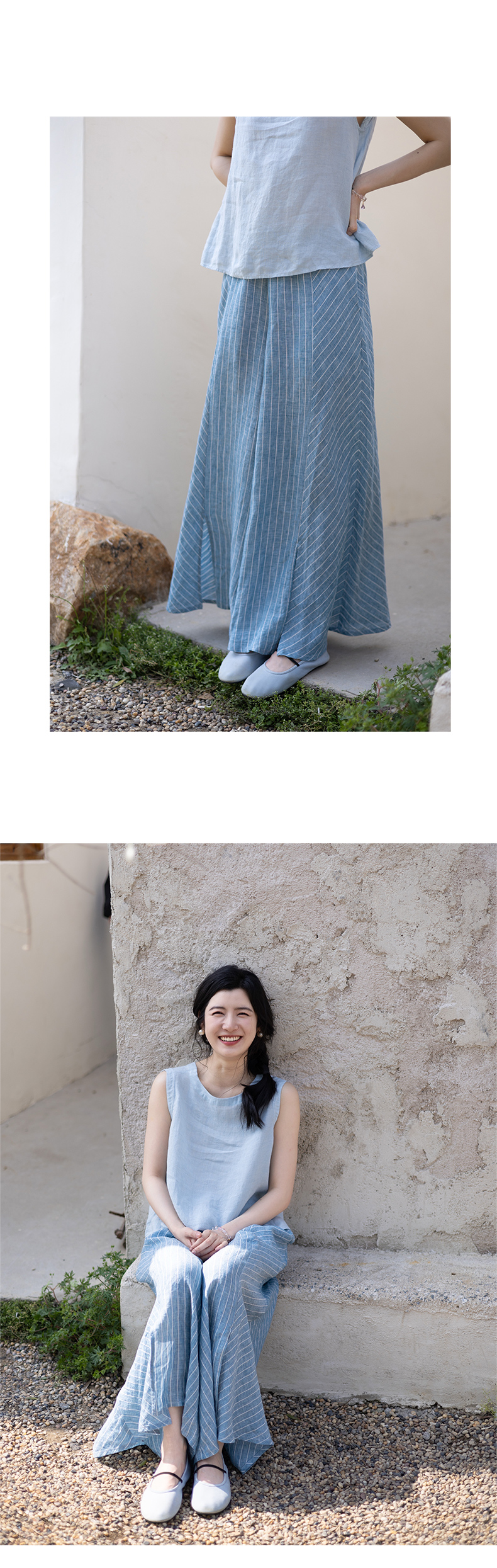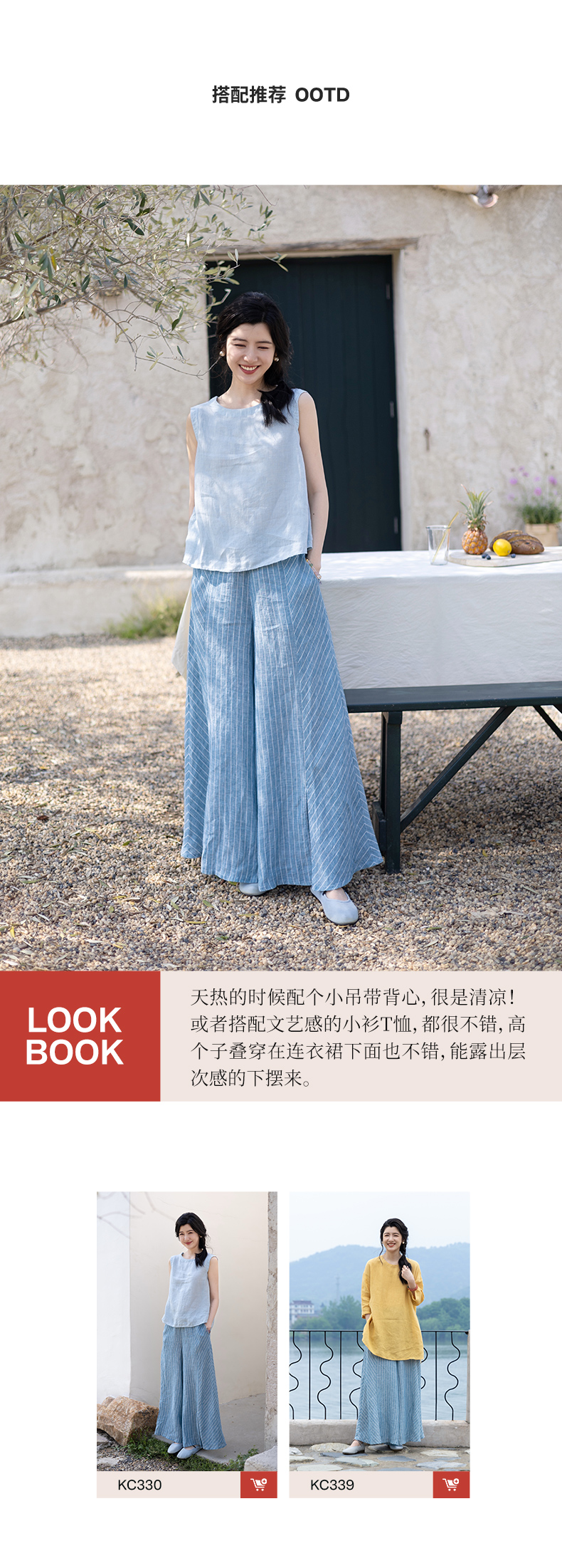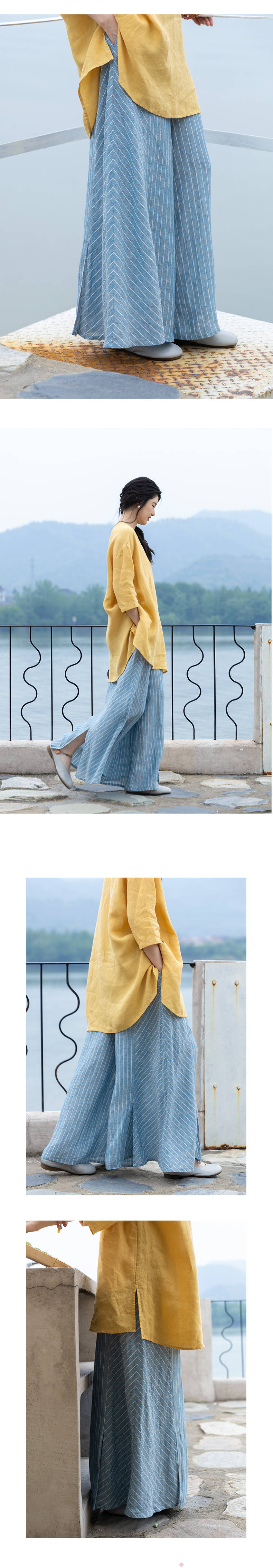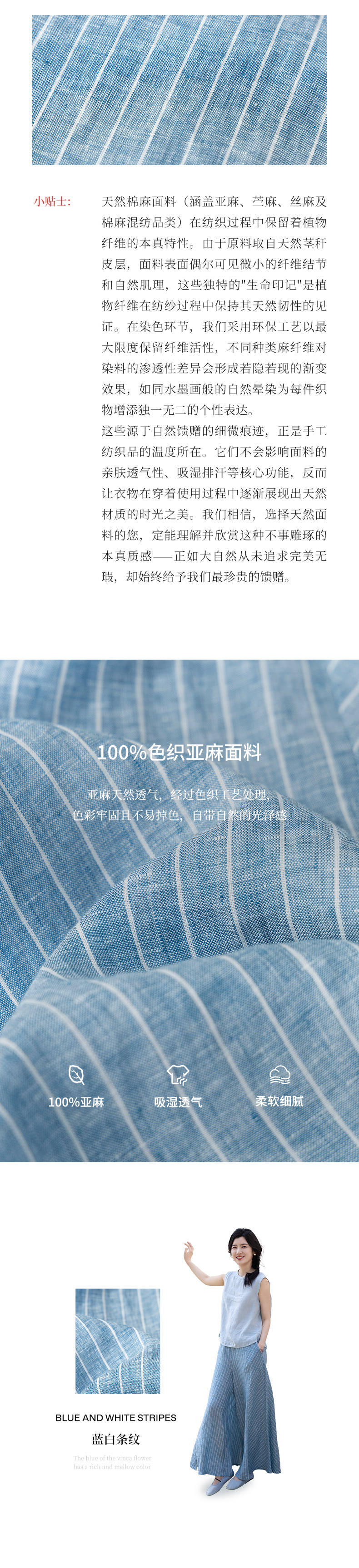 绽放旅行女装351朵/【海街日记·蓝白条】色织亚麻阔腿裙裤松紧腰