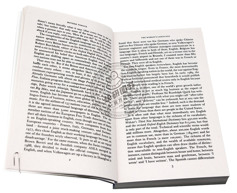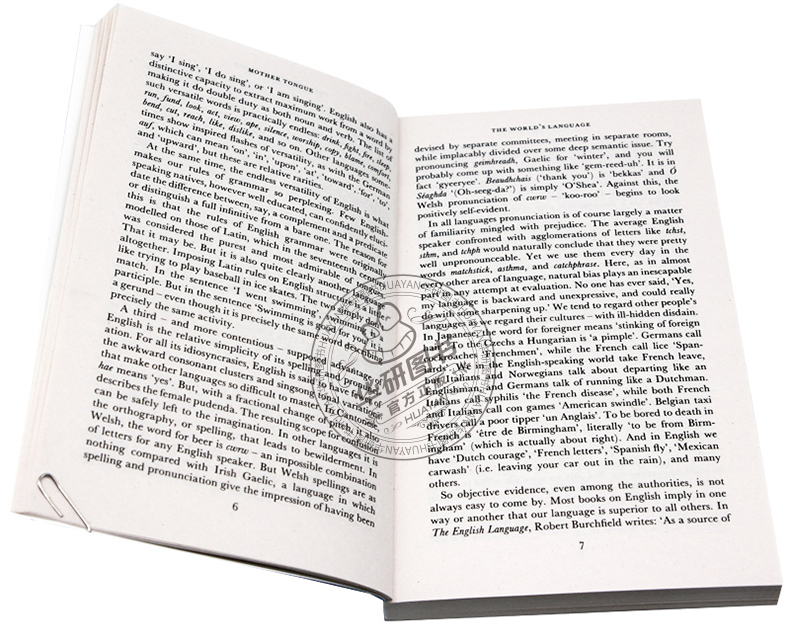 全球有近10亿人使用英语或学习英语,每天我们都在努力K英文、说英文,但有多少人真正了解,英文是怎么回事?历史上的第一句英文说了什么?英文为什么有那么多没有道理的规则,为什么“四”是four,“四十”就不是fourty?同样说英语的英国人和美国人,为什么也会鸡同鸭讲?Mother Tongue: The Story of the English Language《母语:英语的故事》可以回答你! 闻名世界的旅游作家比尔•布莱森扒完《万物简史》再揭英语老底!在Mother Tongue: The Story of the English Language《母语:英语的故事》一书中,比尔•布莱森摇身一变,化身语言历史学家,谈古道今、旁征博引、追根究底对世界上非常成功的营销案例——英语——空前大起底。 Mother Tongue: The Story of the English Language《母语:英语的故事》不仅是一本另类的英语学习读物,它更是一部欧洲文化进化史,一本信息丰富的英语百科全书,当然你也可以当它是一本英式极品笑话大合集来阅读。总之,阅读Mother Tongue让你从10亿英语使用者中“脱颖而出”。 “More than 300 million people in the world speak English and the rest, it sometimes seems, try to...” Only Bill Bryson could make a book about the English language so entertaining. With his boundless enthusiasm and restless eye for the absurd, this is his astonishing tour of English. From its mongrel origins to its status as the world’s most-spoken tongue; its apparent simplicity to its deceptive complexity; its vibrant swearing to its uncertain spelling and pronunciation, Bryson covers all this as well as the many curious eccentricities that make it as maddening to learn as it is flexible to use. Bill Bryson’s classic Mother Tongue is a highly readable and hilarious tale of how English came to be the world’s language.