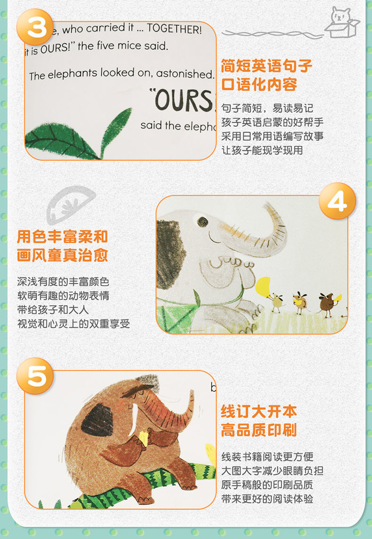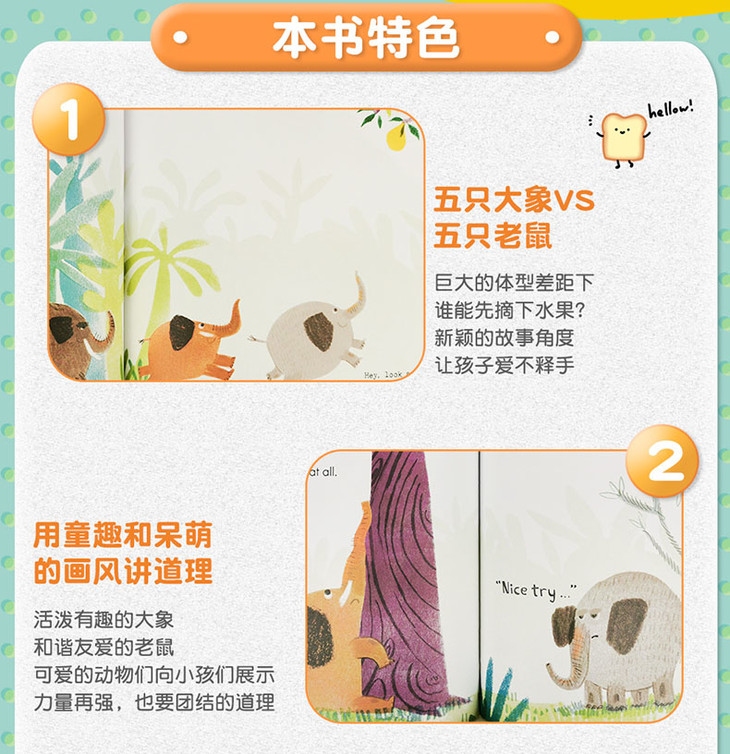 在这本图画书中,五头愚蠢、贪婪的大象和五只极小的老鼠在现代社会里展开了一场比拼。一天,在丛林深处,五头大象发现了一棵新树——一棵高大的树——在那棵树的顶上,是它们所见过的最好吃的、让人馋涎欲滴的水果。“我的!”每只大象都叫道。“我的,我的,我的,我的,我的!”但是谁会第一个到达那里呢?大象会不会发现这五只小老鼠,正在计划着,慢慢地接近那根尖顶的树枝?阿努斯卡·阿莱普兹以新鲜的视角、滑稽的人物塑造和美丽的艺术质感,讲述了一个团队合作和分享的故事,一部当代喜剧和寓言。