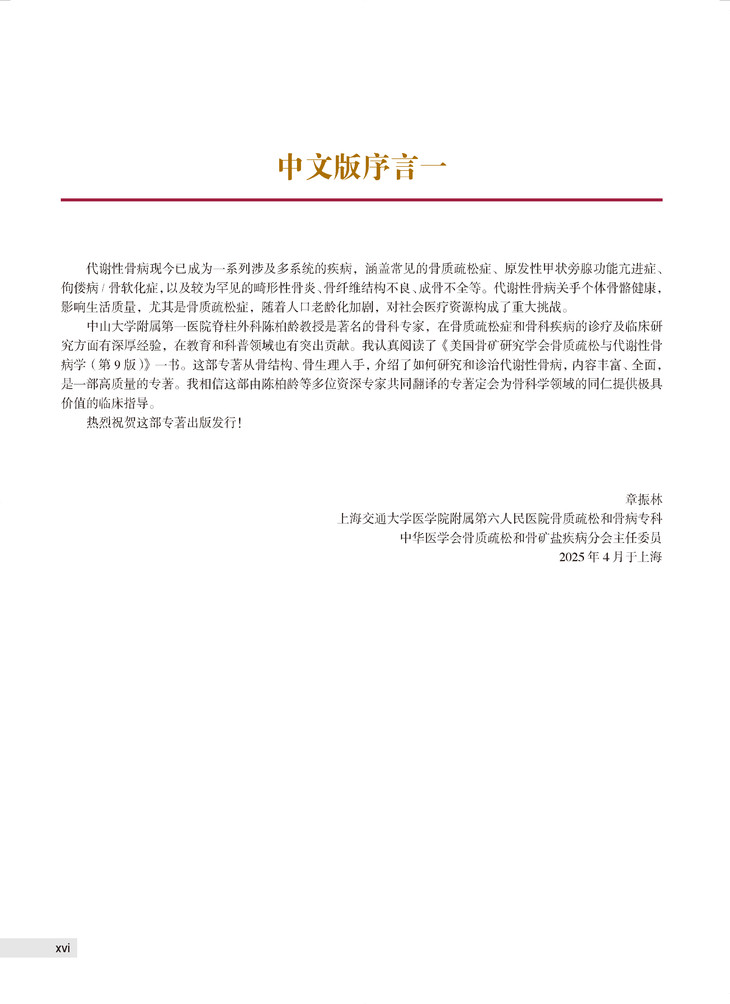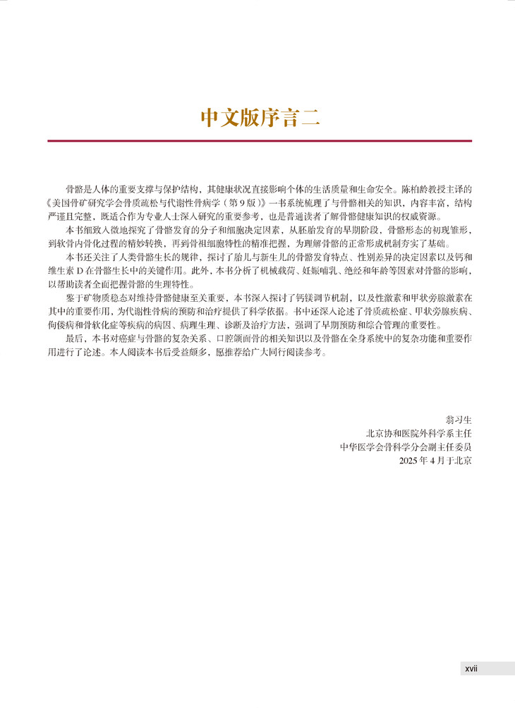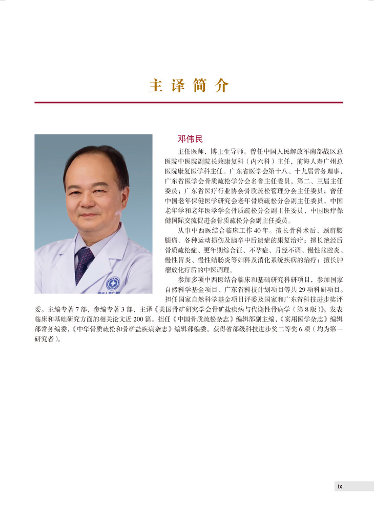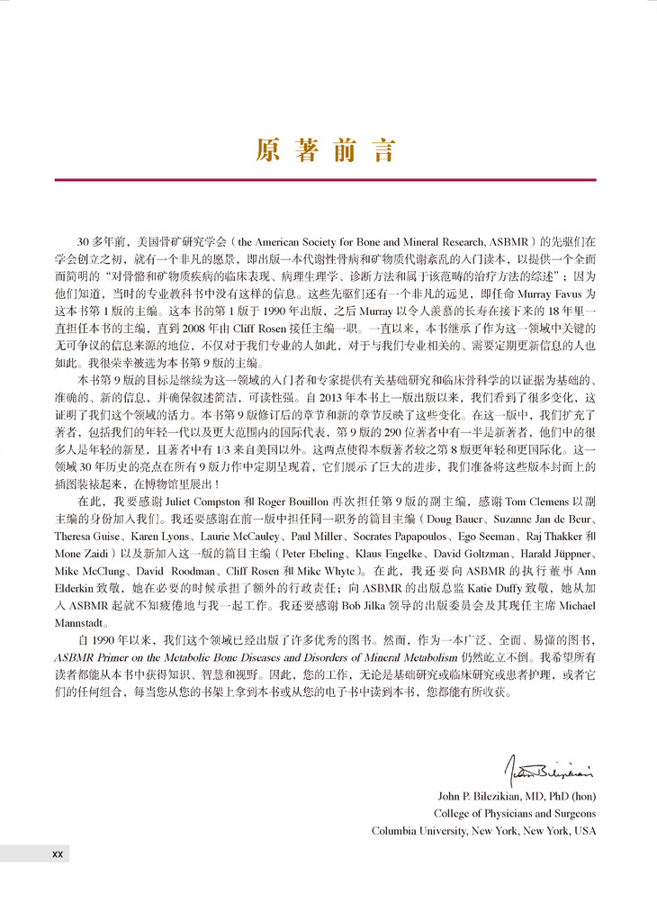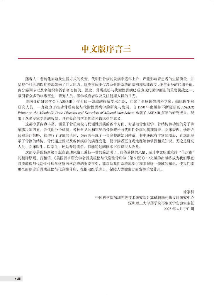 本书是一部在骨矿代谢领域具有领导地位的权威专著,该书首版出版于1990年(美国),三十多年来不断再版,最新一版为2019年出版的第9版。多年来,在相关领域专著中,本书销量名列前茅,被行业誉为“骨代谢疾病第一书”。本书由美国骨矿研究学会(ASBMR)组织编写,200多位来自美国、英国、澳大利亚、加拿大的相关领域权威专家参与编写,在指导医生临床实践的同时,呈现出了当今骨矿代谢研究的进展全貌。本书涉及骨质疏松与代谢性骨病学的几乎所有领域内容,为相关专科医生、医学生的实践及学习研究提供了“一站式”参考资源。新版加入了大量精美图片,具有更强实用性,确保了其在骨矿代谢领域“第一书”的地位。部分章节专门对疾病发展和疾病状态的生物学因素加以阐述,并将其与临床干预有机结合。新的章节涵盖了放射性骨损伤等多个课题。本书作为美国骨矿研究学会(ASBMR)指定学习用书,其权威性得到ASBMR委员会的充分认可。