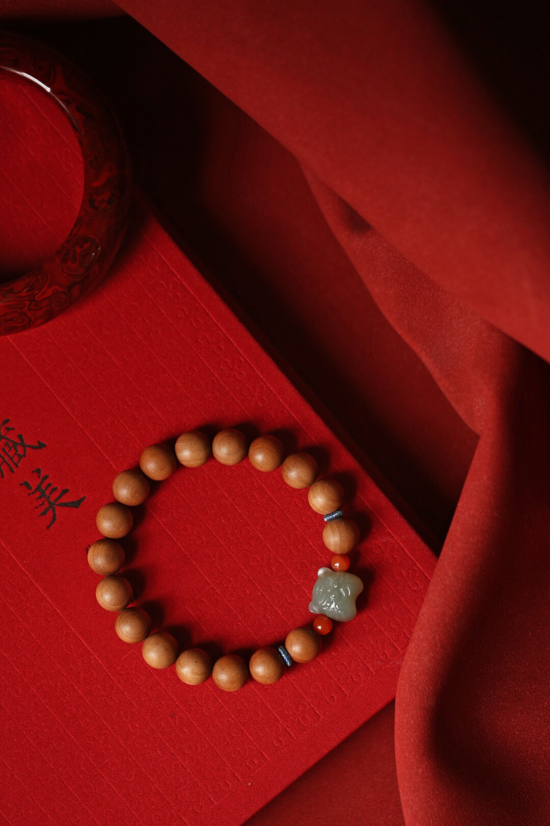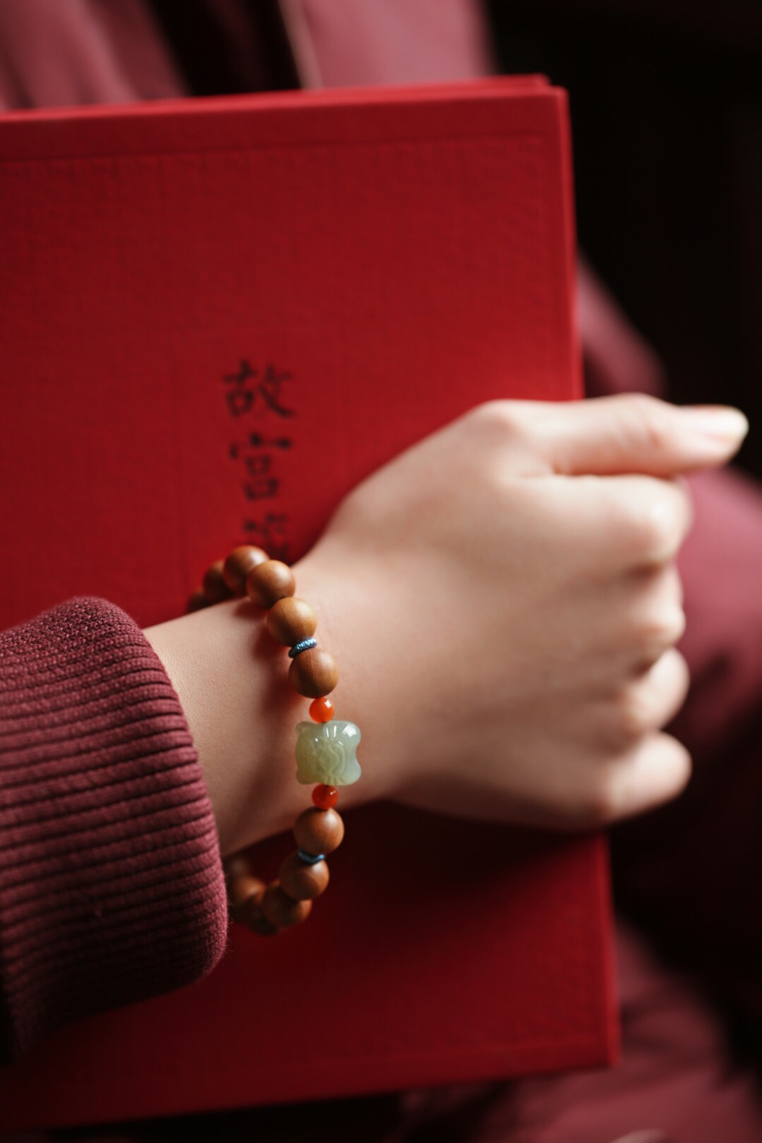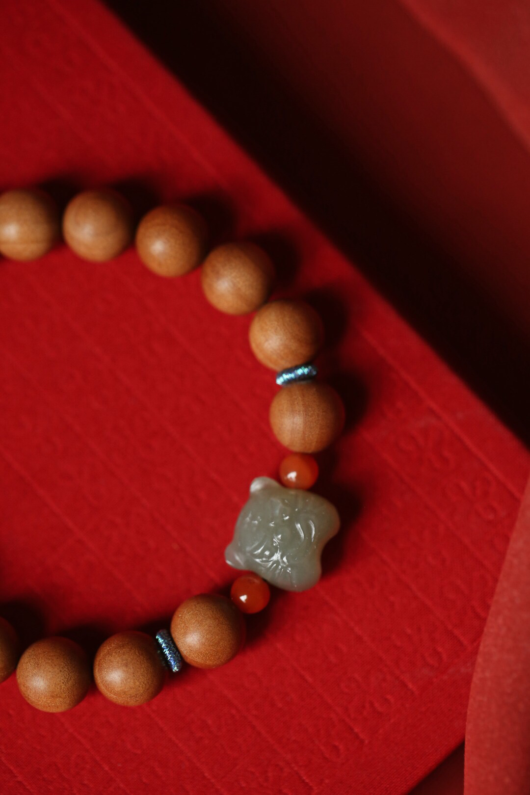 “偌兰”老山檀原创手串:宝贝精选了非常优质的老山檀料制作而成,料质细腻,底色干净,纹理清晰,质地非常的醇厚,性价比很高。手串的香气清新迷人,奶香味和果蜜香味舒适自然,别有特色。搭配南红和和田玉虎,端庄典雅,充满了自然的神韵。手串的料质好,富有小清新的风格,极具特色,性价比很高,值得入手!