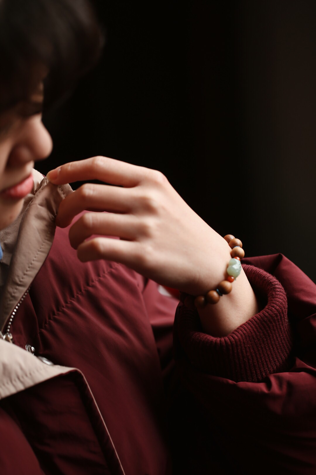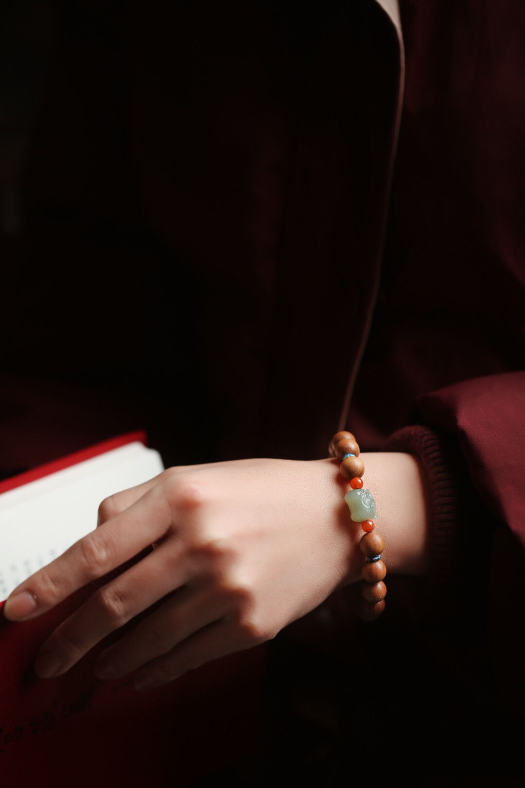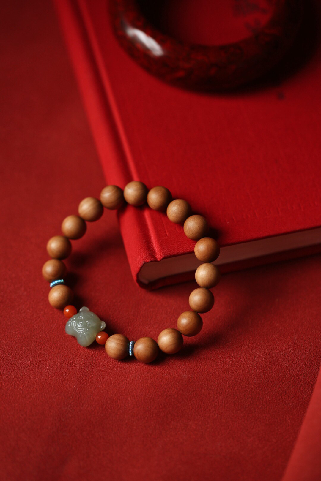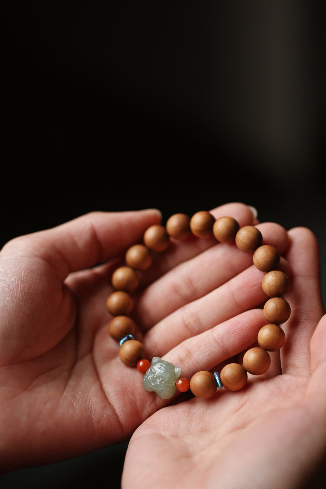 “偌兰”老山檀原创手串:宝贝精选了非常优质的老山檀料制作而成,料质细腻,底色干净,纹理清晰,质地非常的醇厚,性价比很高。手串的香气清新迷人,奶香味和果蜜香味舒适自然,别有特色。搭配南红和和田玉虎,端庄典雅,充满了自然的神韵。手串的料质好,富有小清新的风格,极具特色,性价比很高,值得入手!