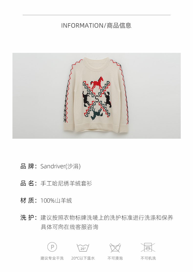 历年在巴黎时装周亮相,享誉世界的艺术羊绒品牌[Sandriver 沙涓]由羊绒布道者郭秀玲女士创立。阿拉善自有牧场纯种羔羊绒,日本国宝设计师小筱顺子,上海自有基地精工细作。承载羊绒情怀,坚持匠人品质。
