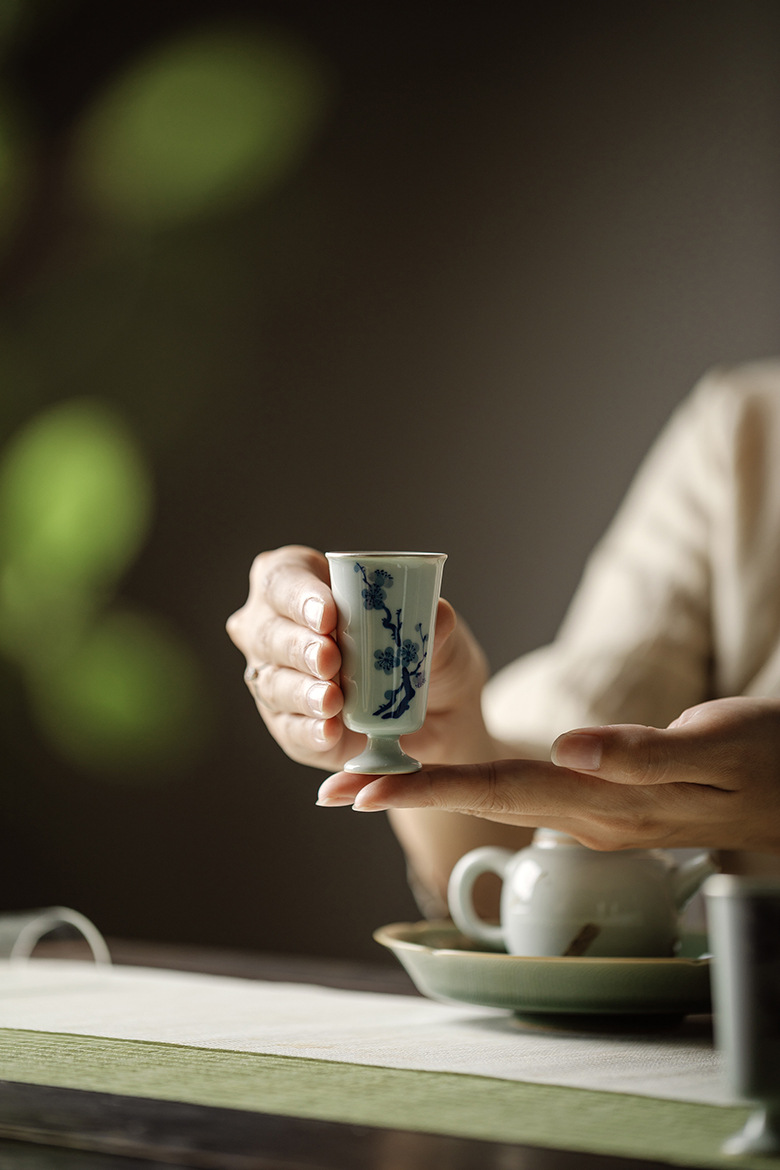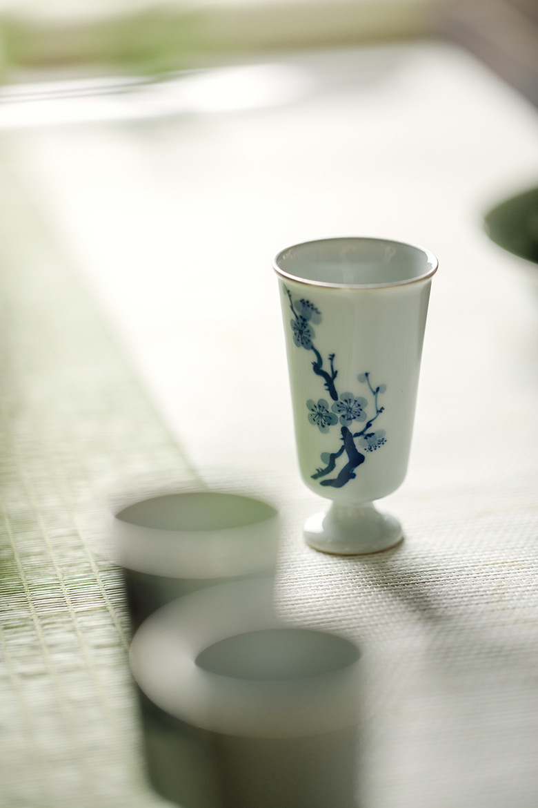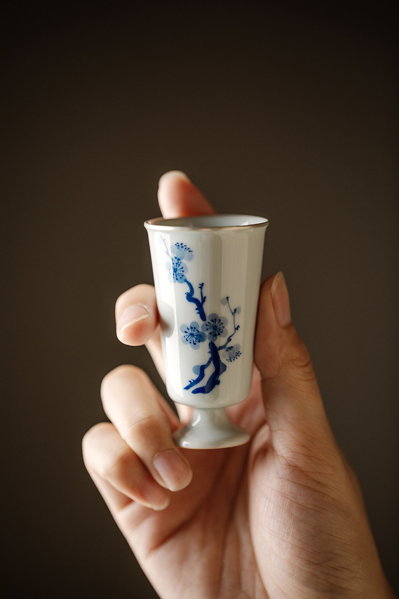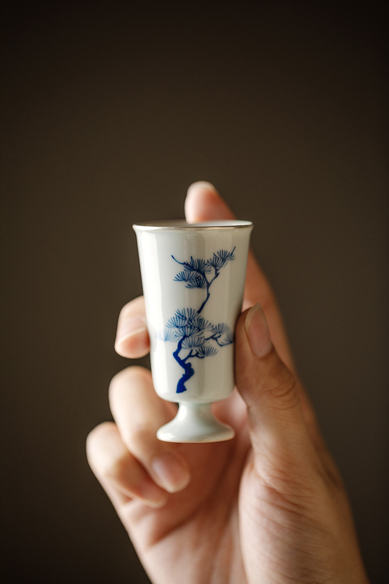 永利汇束刻中式复古青花手绘松竹梅高足且行茶杯功夫茶具小号品茗杯家用
