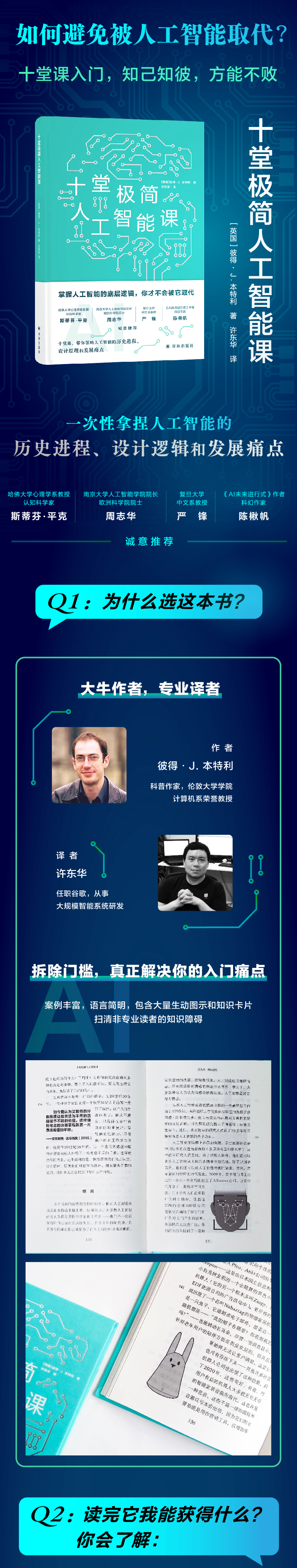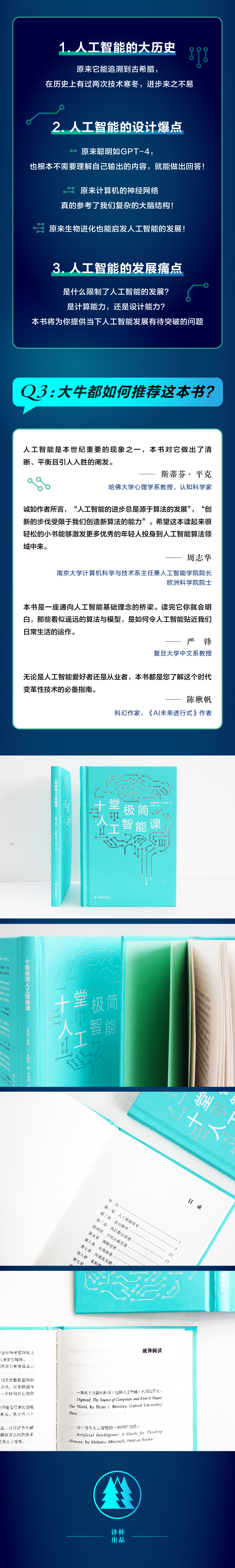 哈佛大学心理学系教授斯蒂芬平克盛赞本书的“晰、平衡且引人入胜”,南京大学人工智能学院院长周志华认为本书“文笔流程而不失严谨”,《AI未来进行式》作者陈楸帆将本书视为我们“了解这个时代变革性技术的必备指南”,在如此众多一线科研学者的推荐下,本书是一本你可以信赖的靠谱读物