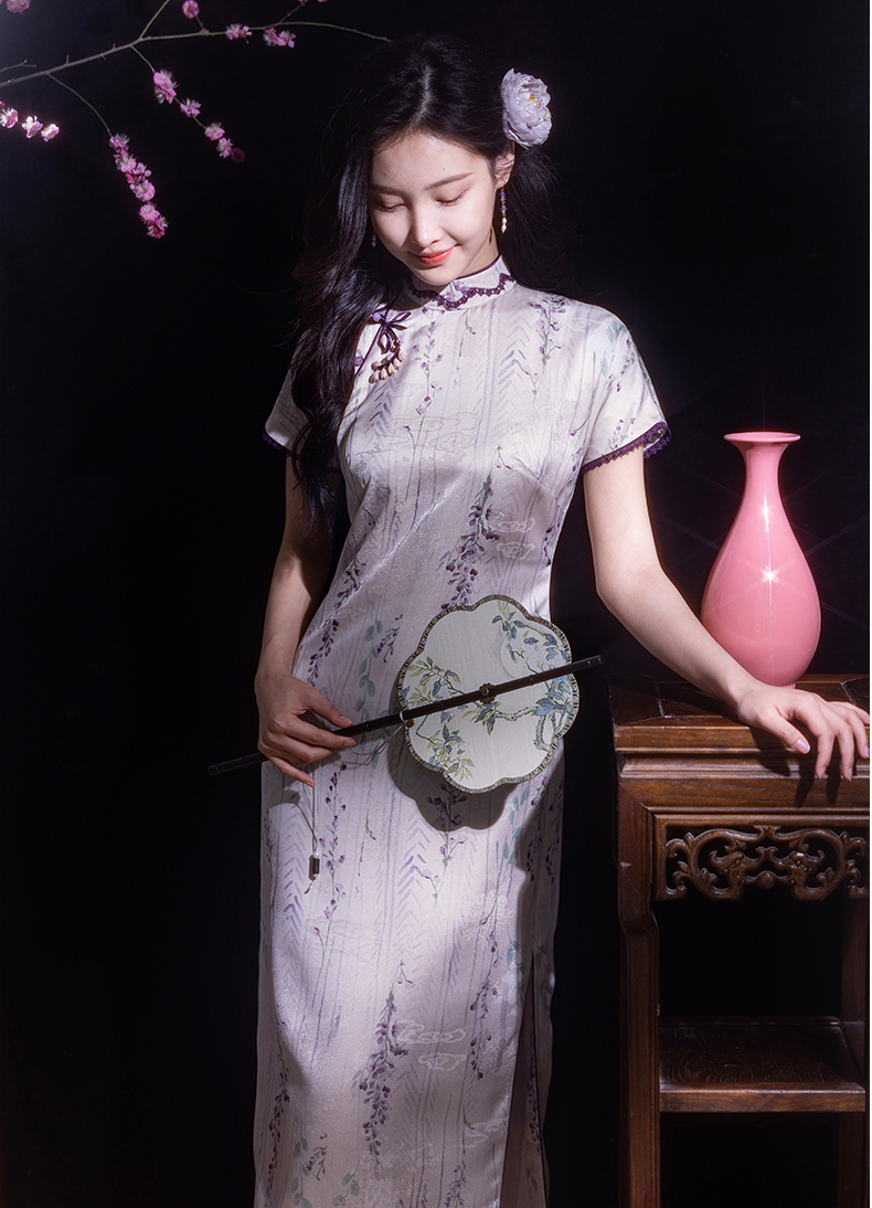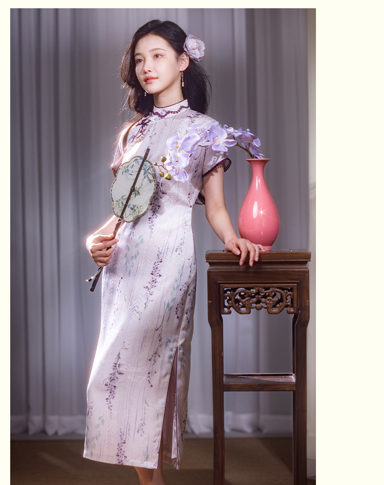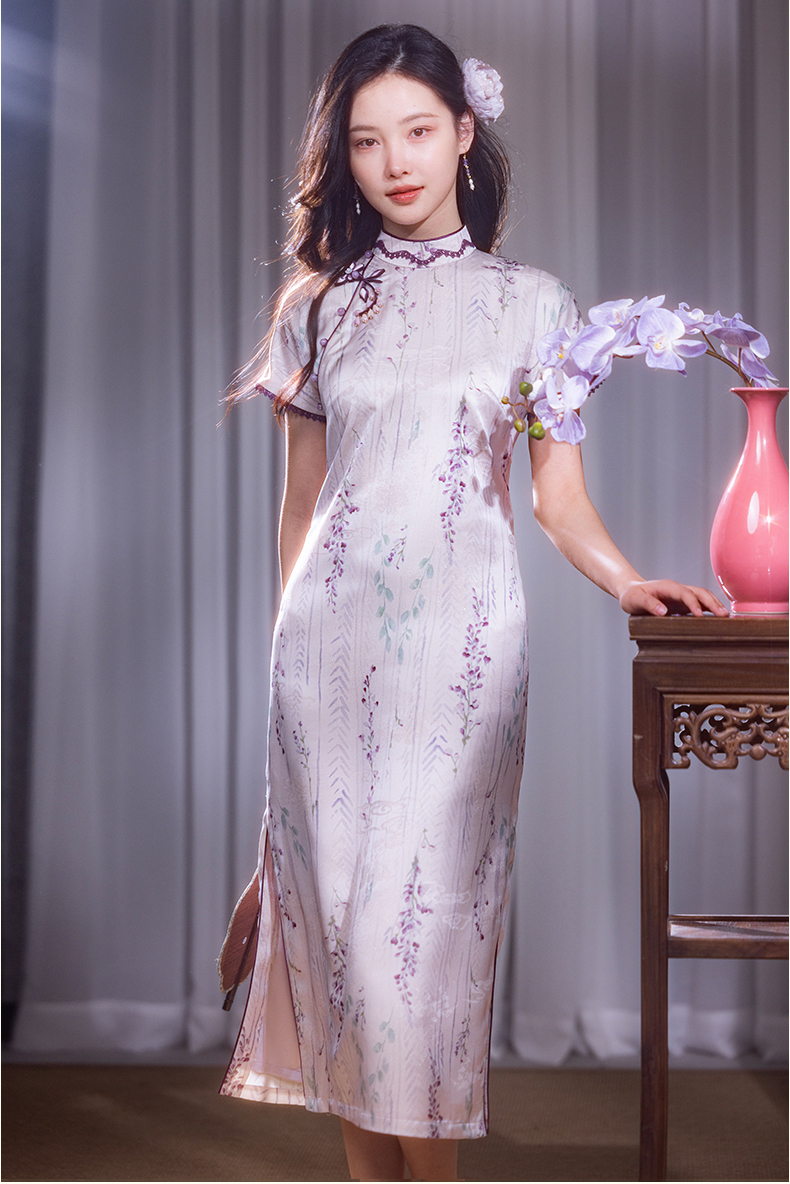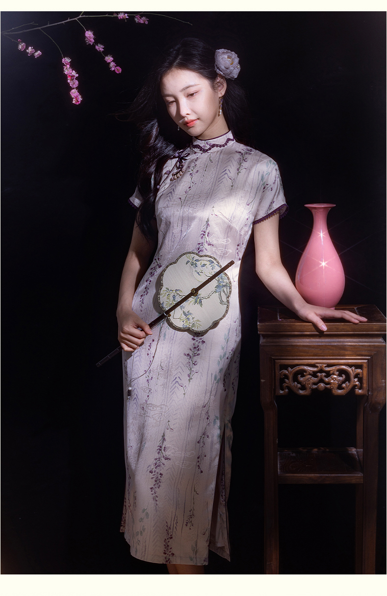 逸红颜紫簪2025夏新款紫藤复古略宽松显腰身垂坠金绫缎改良长旗袍