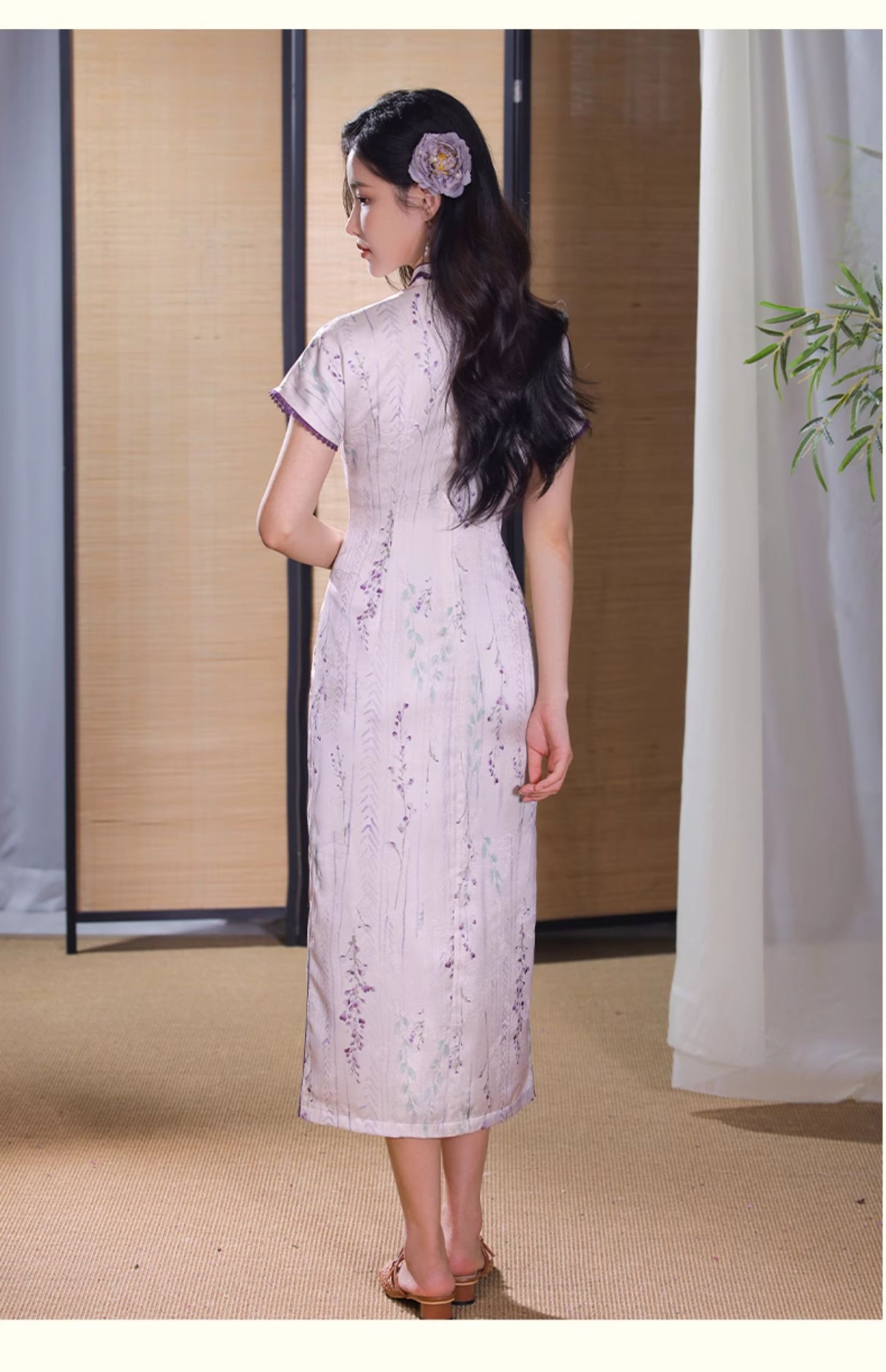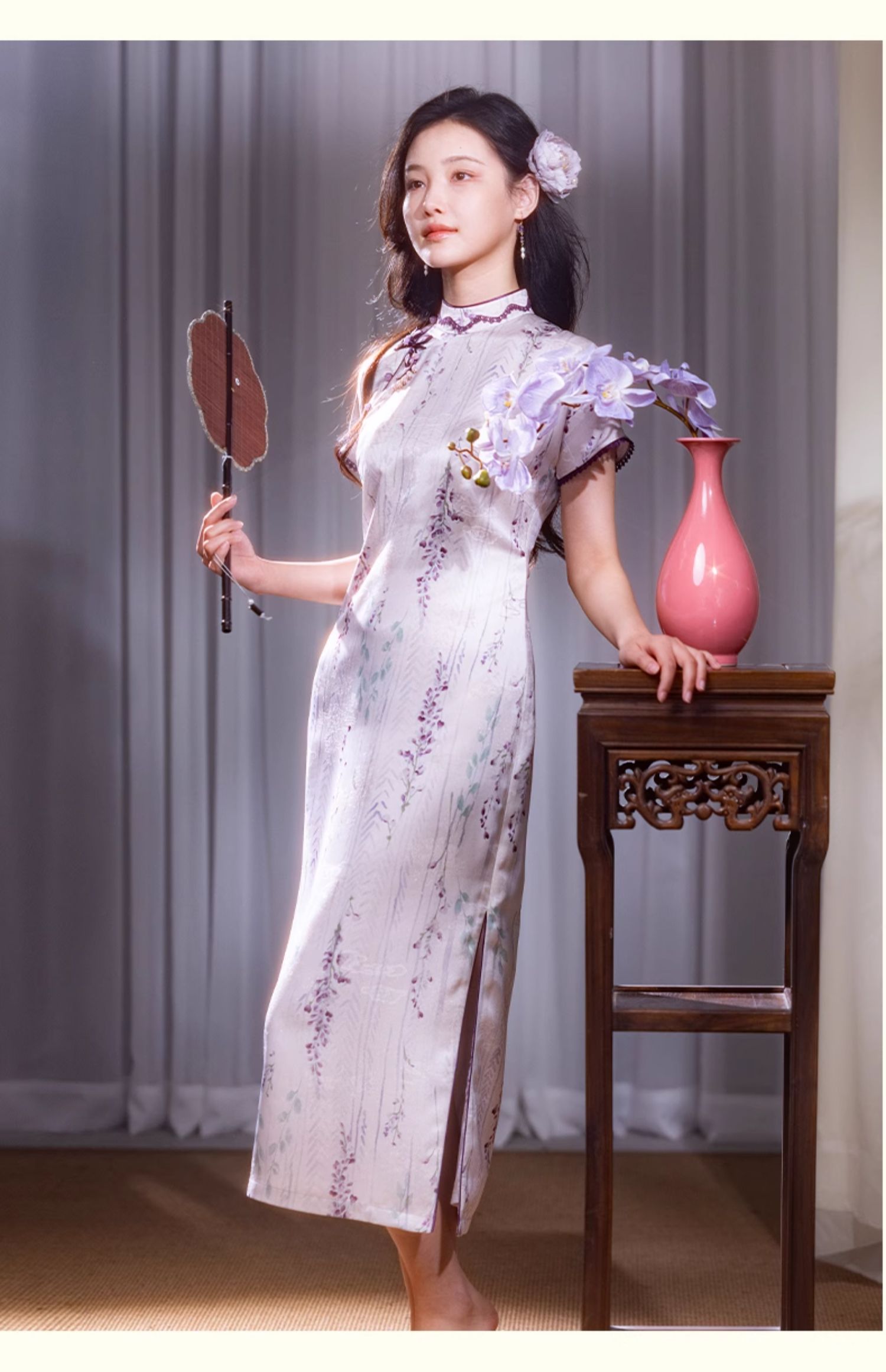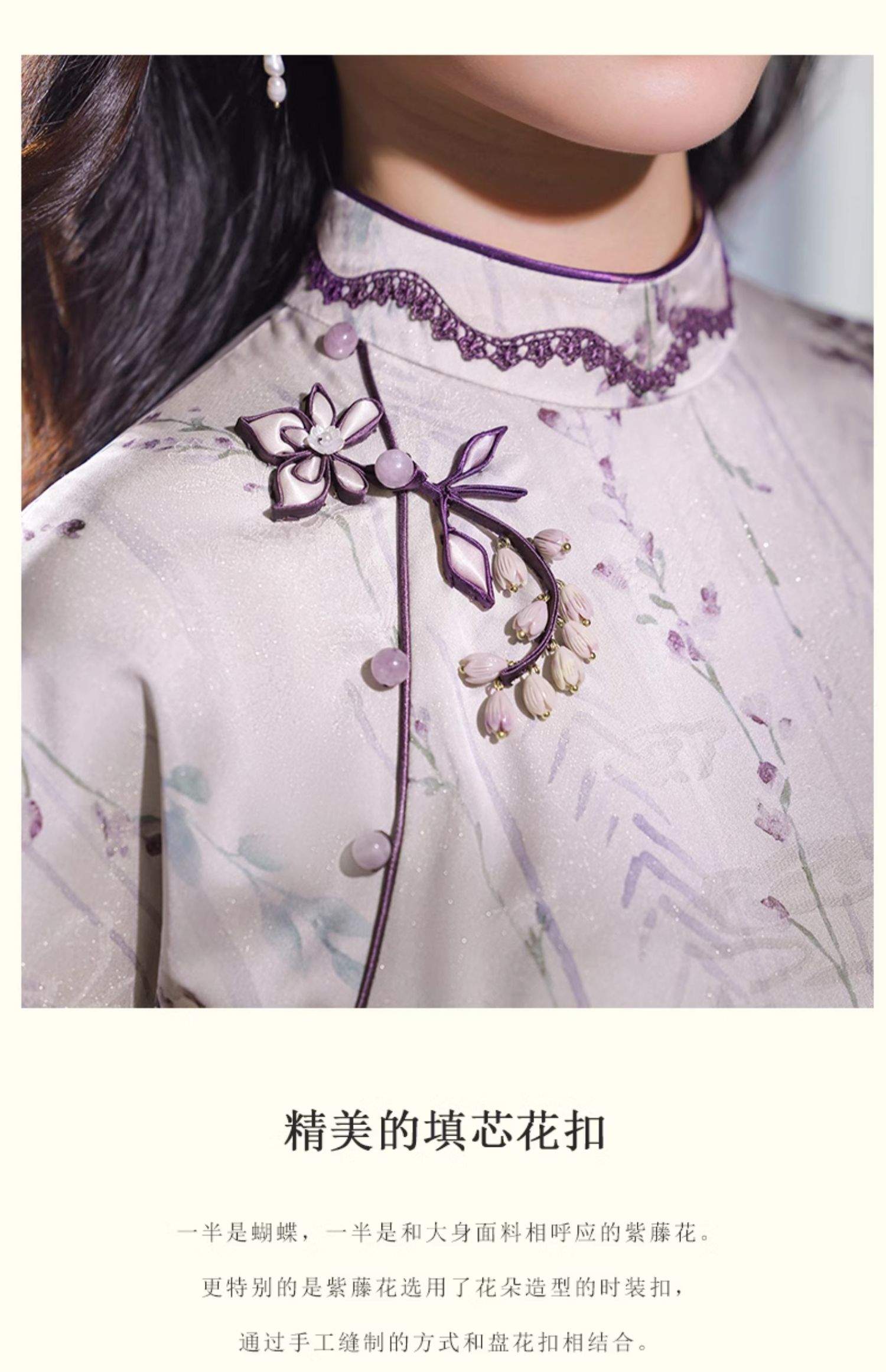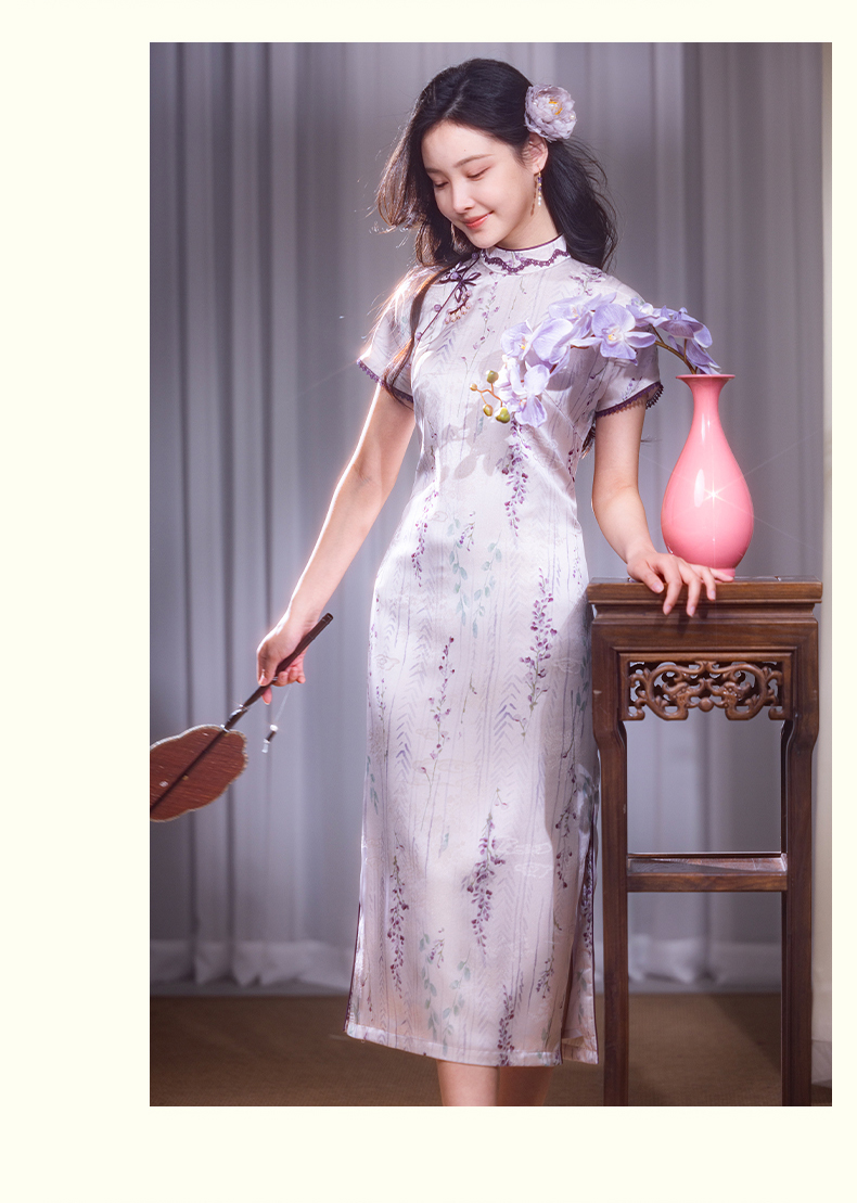 逸红颜紫簪2025夏新款紫藤复古略宽松显腰身垂坠金绫缎改良长旗袍