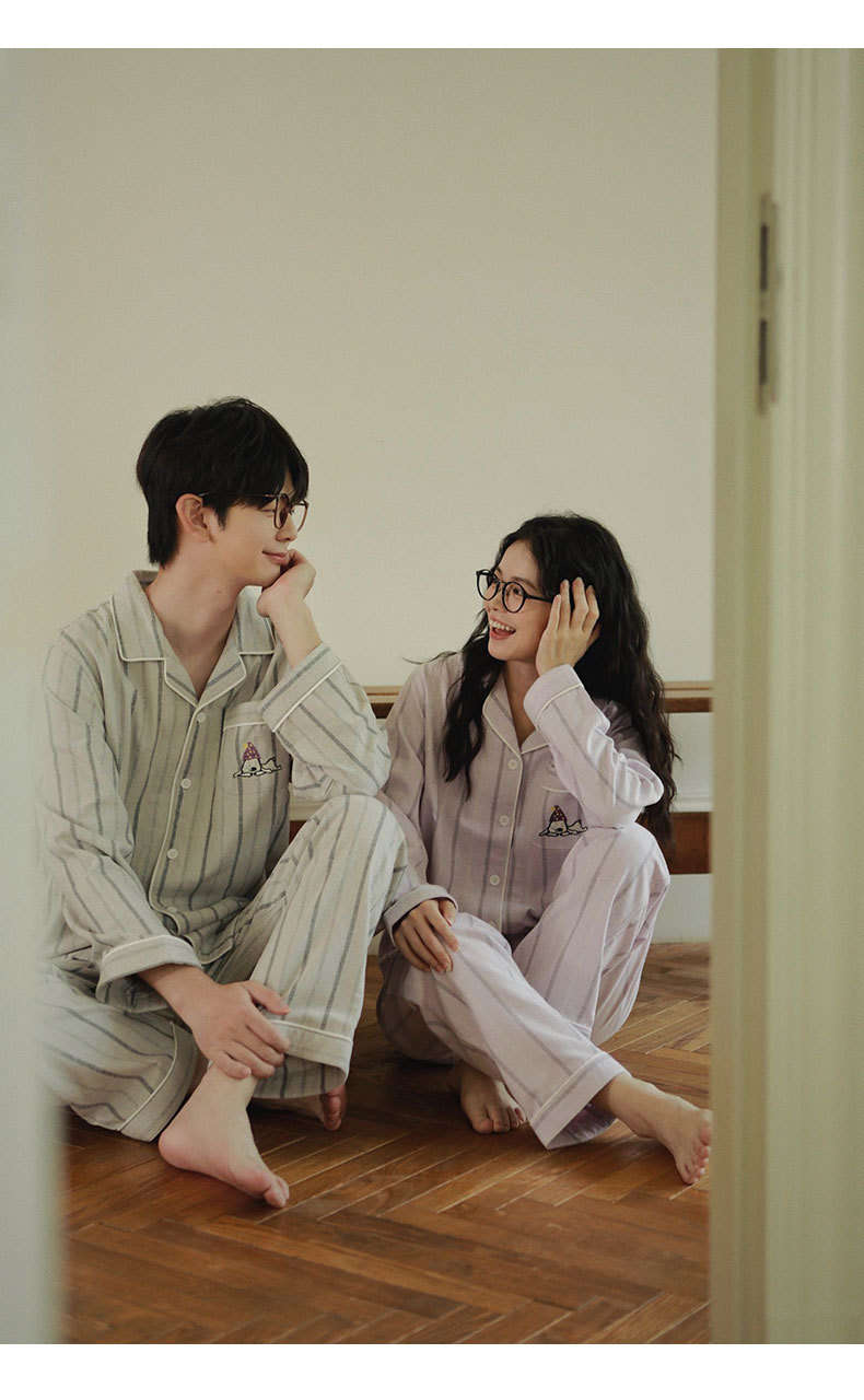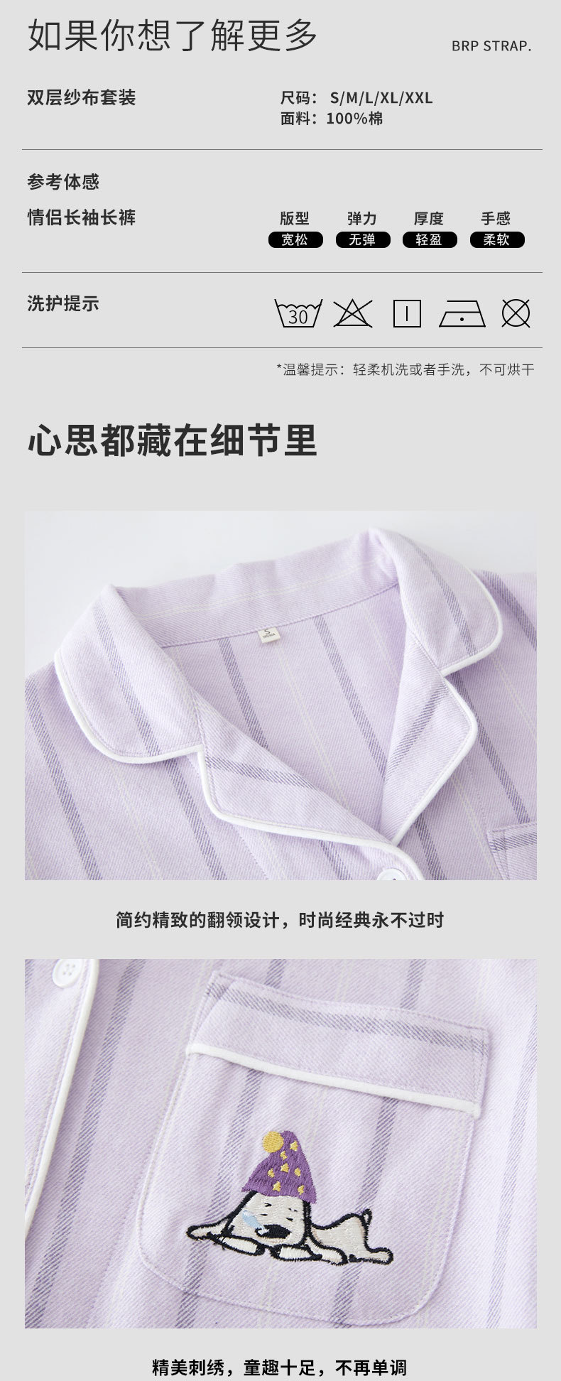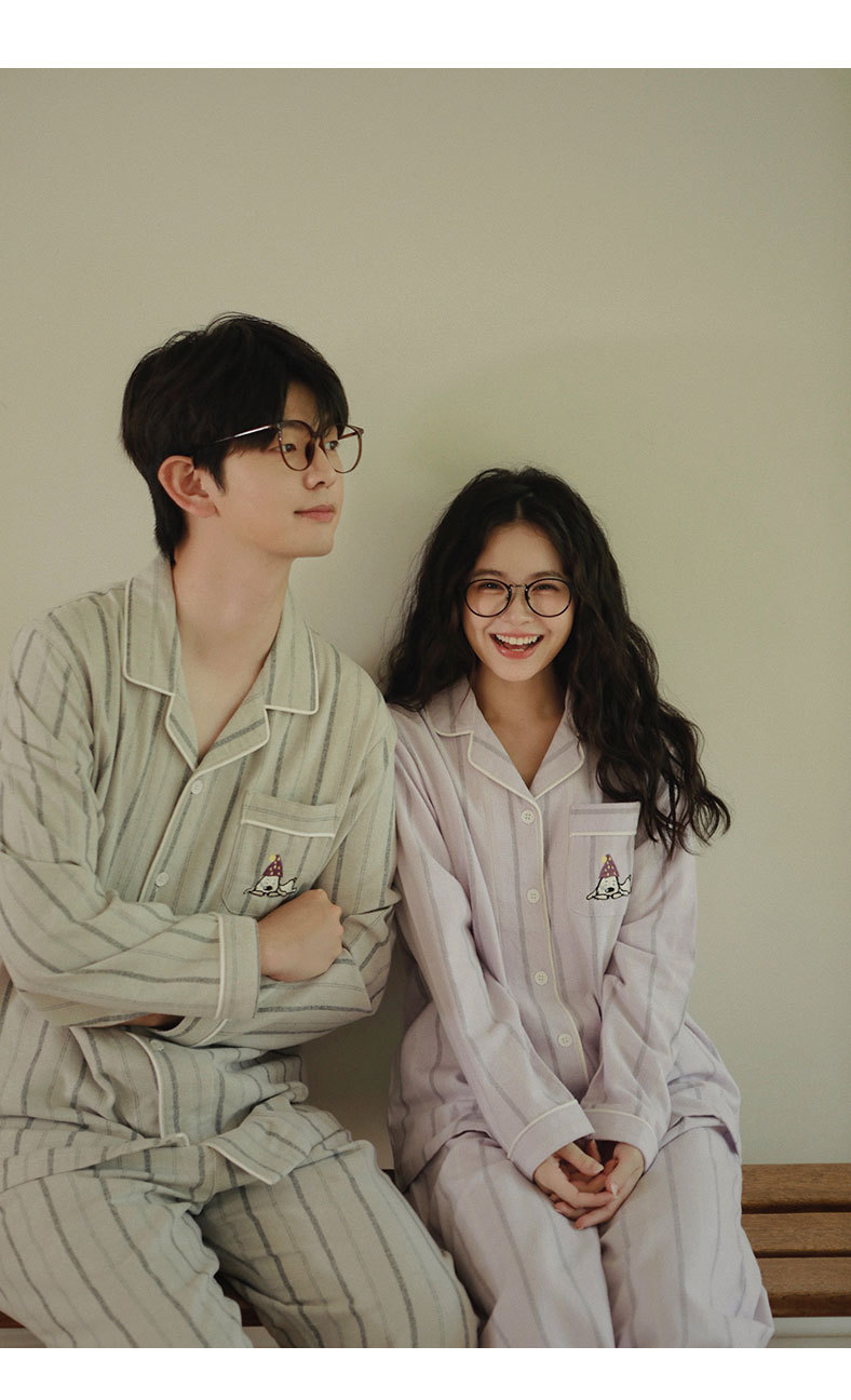 2025秋新款!情侣款纯棉磨毛家居服 瞌睡小狗刺绣显瘦竖条长袖长裤睡衣套装