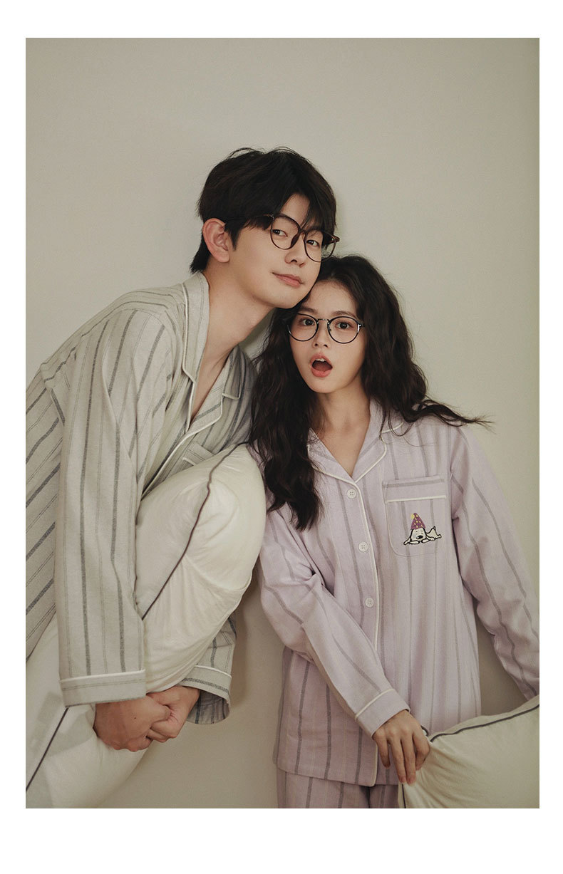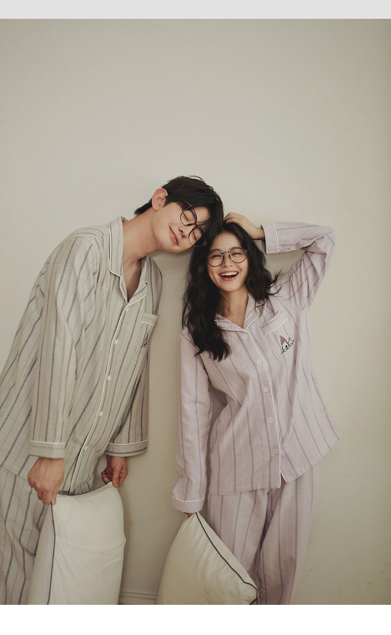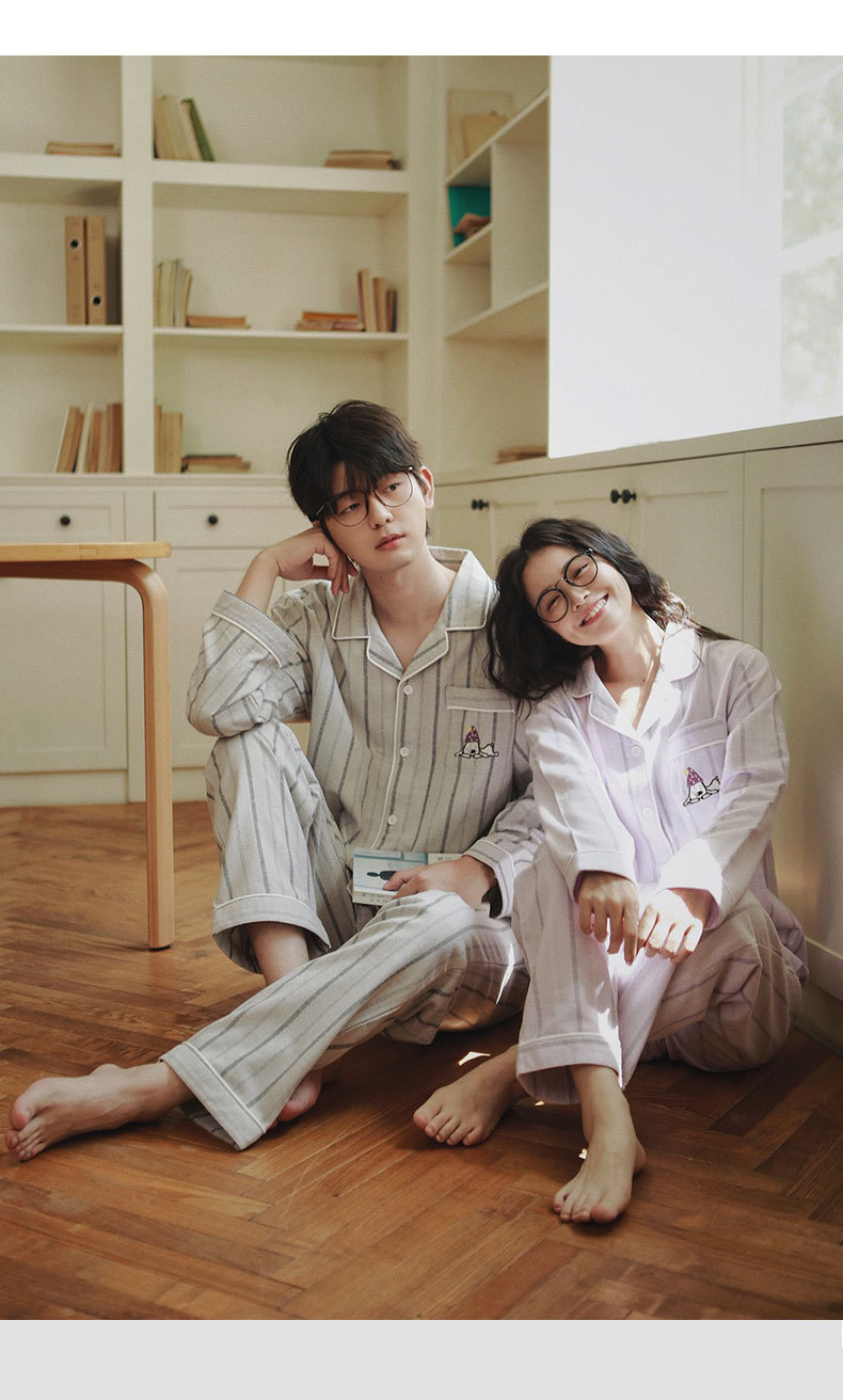 2025秋新款!情侣款纯棉磨毛家居服 瞌睡小狗刺绣显瘦竖条长袖长裤睡衣套装