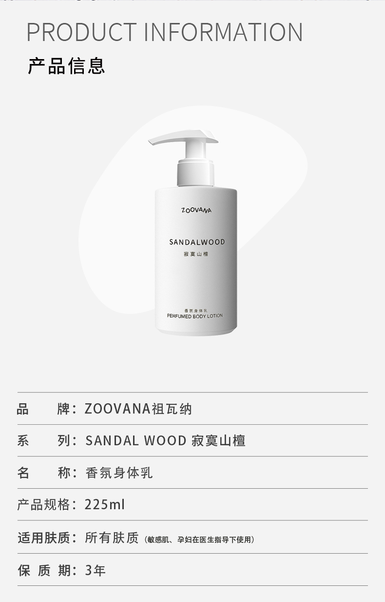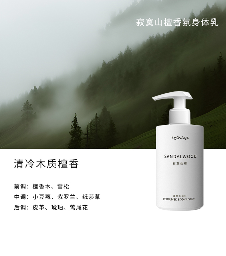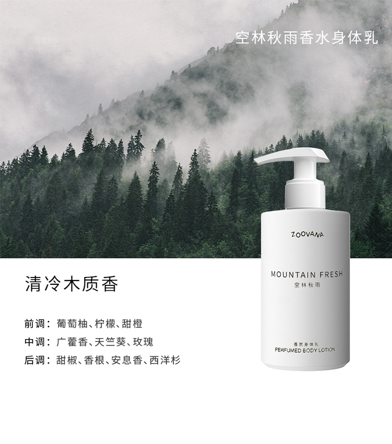【品名】 ZOOVANA祖瓦纳 香氛身体乳 滋润保湿 肤感轻盈不黏腻 3款香型可选 【规格】空林秋雨225ml 、冷雨煎茶225ml 、寂寞山檀225ml 【备案编号】 冷雨煎茶:粤G妆网备字2023359443 空林秋雨:粤G妆网备字2022090382 寂寞山檀:粤G妆网备字2024328109 【产地】国内 【保质期】3年 【发货包装】独立包装 【发货地】广州 【发货快递】圆通、中通随机发 【补邮费地区】新疆、西藏+12元 【发货时效】48-72小时,周末节假日顺延 |