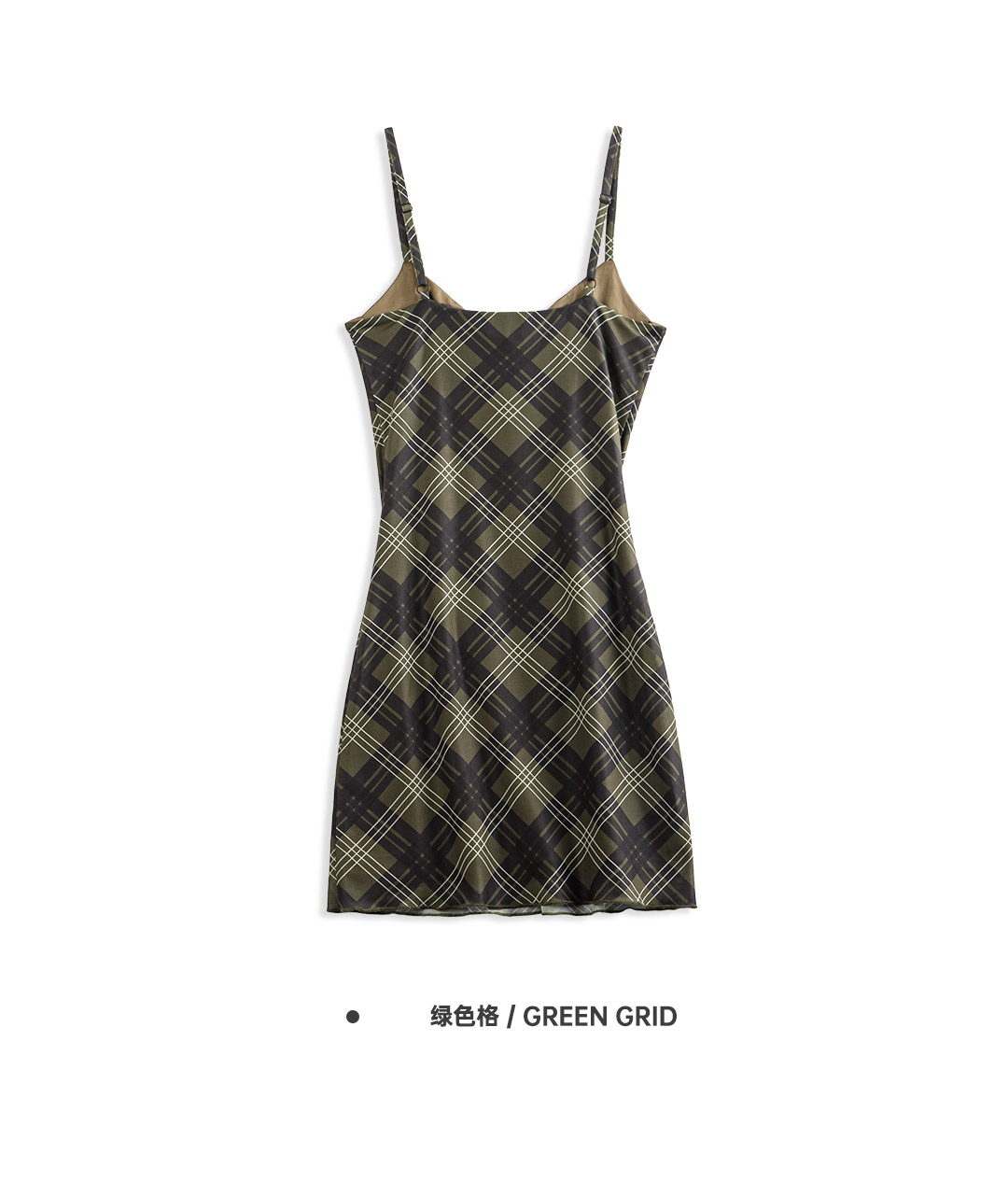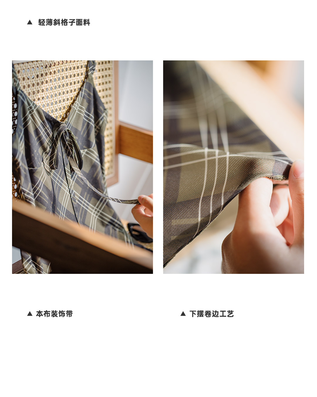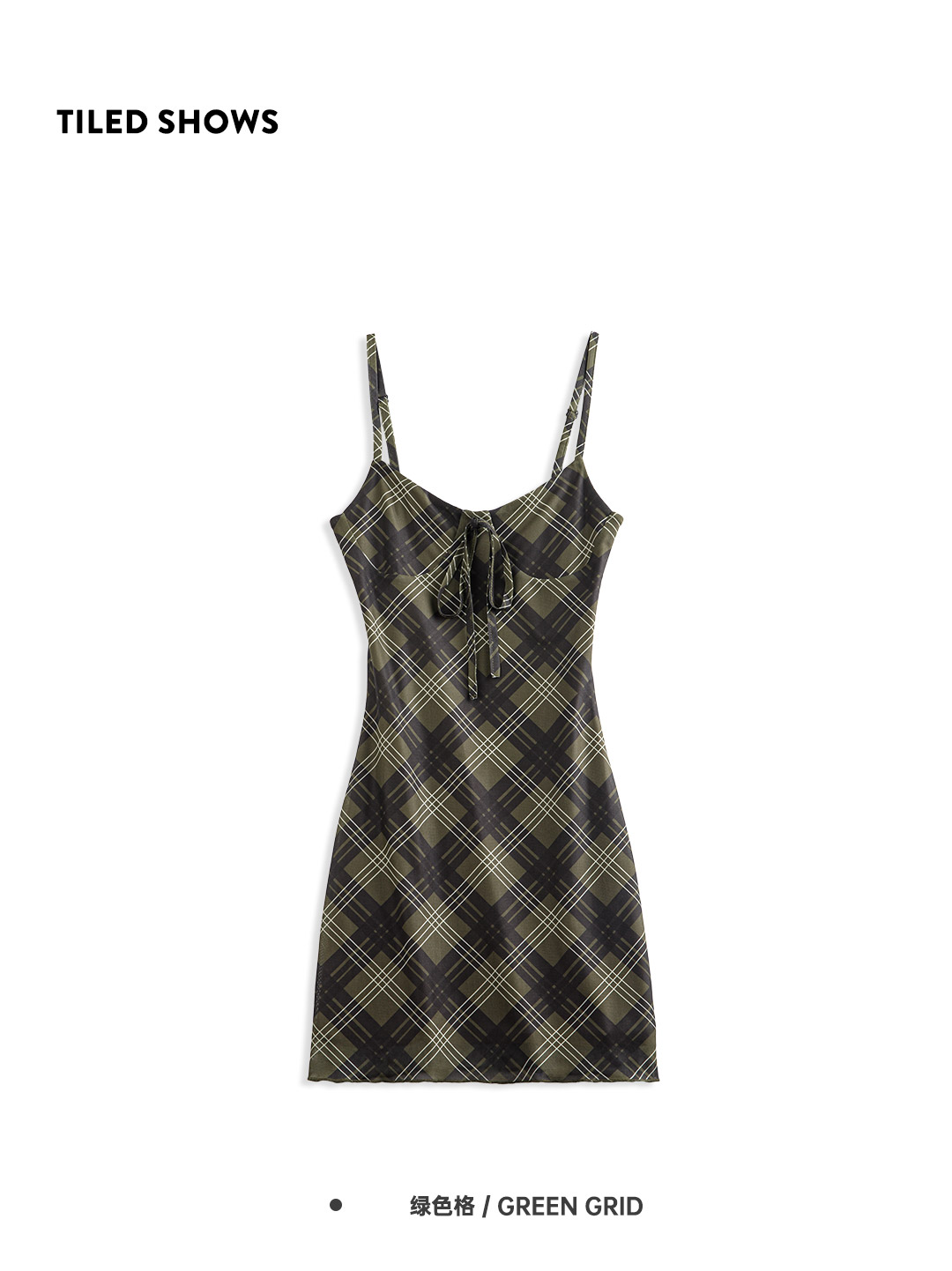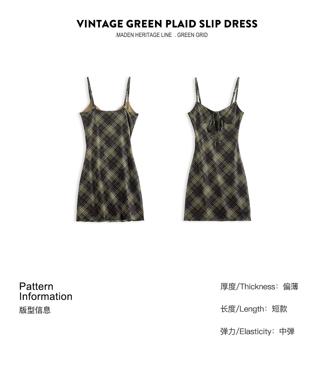 马登复古绿格子吊带裙休闲百搭V领连衣裙收腰设计拉链裙子夏季女