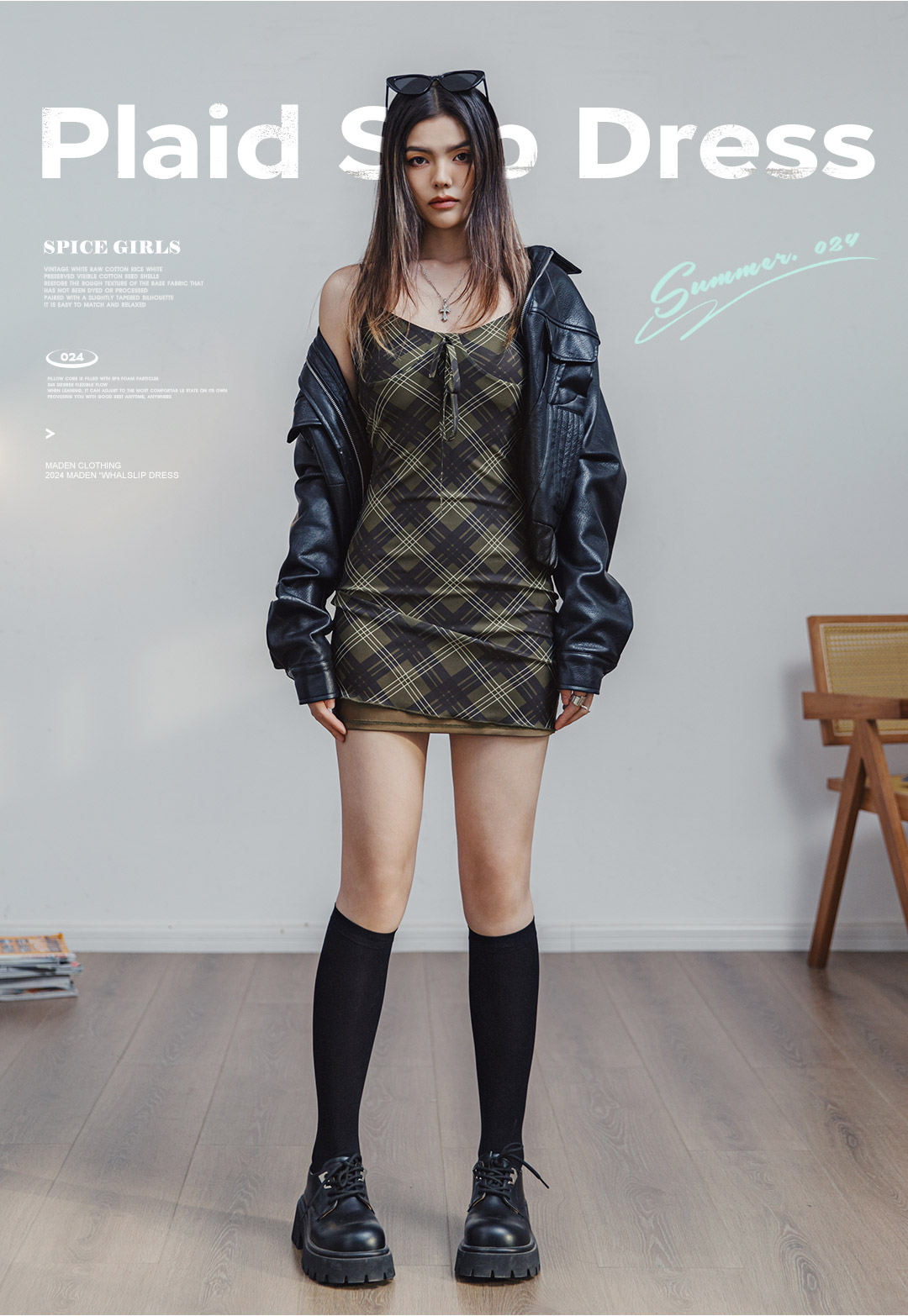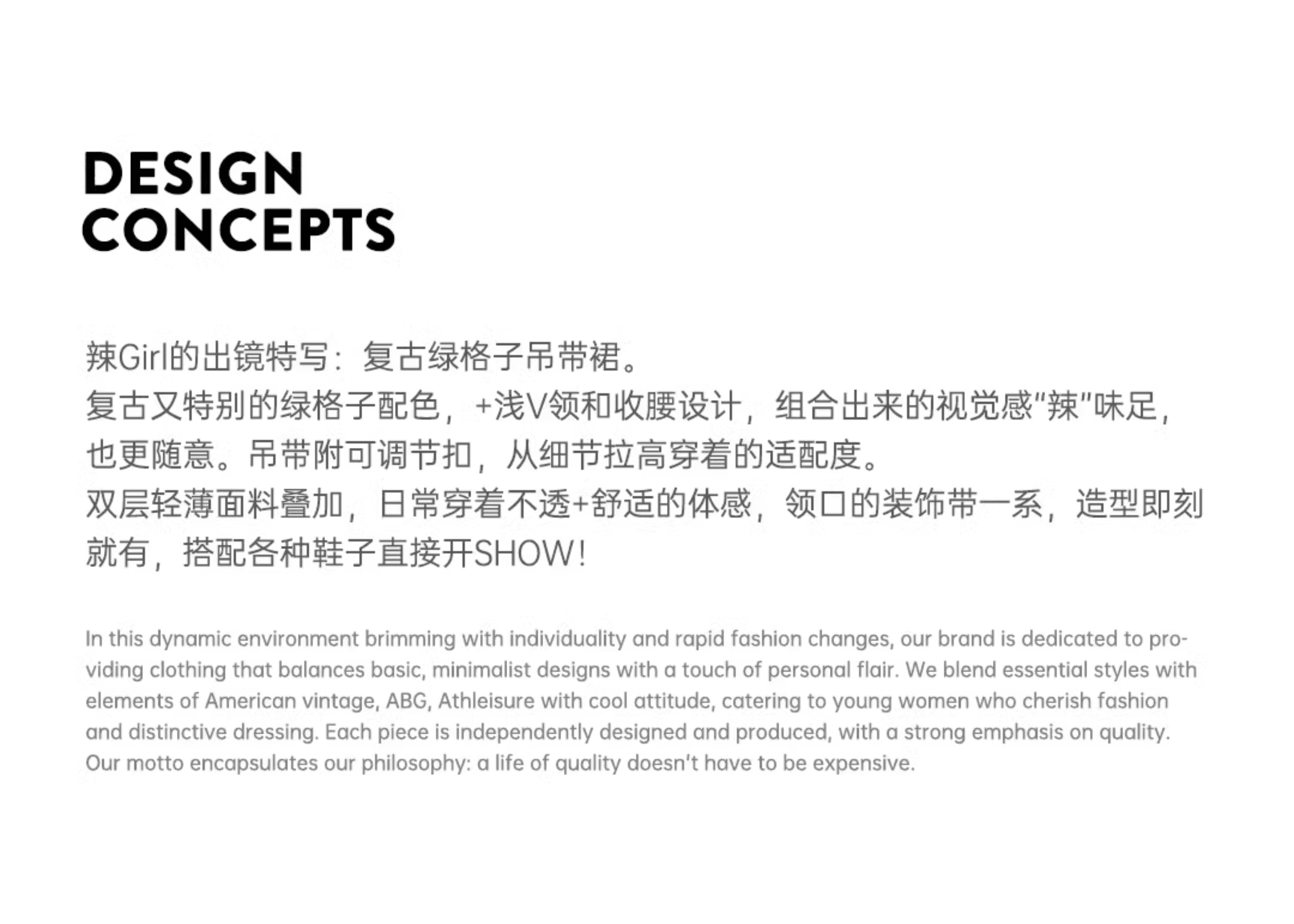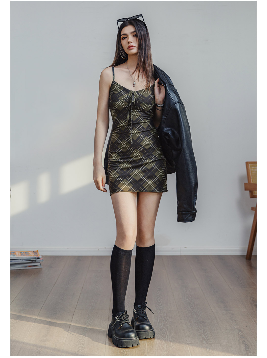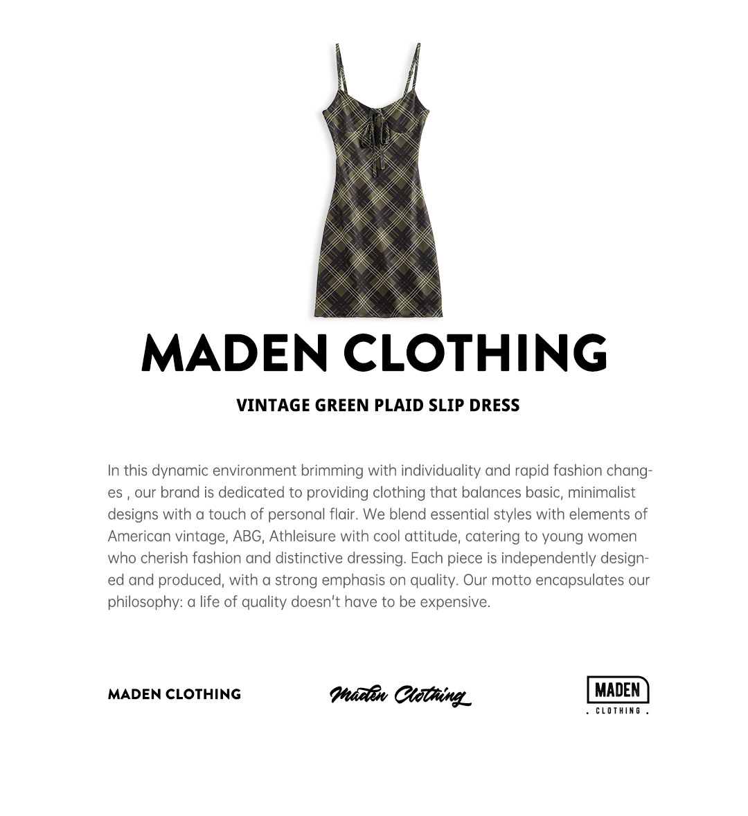 马登复古绿格子吊带裙休闲百搭V领连衣裙收腰设计拉链裙子夏季女