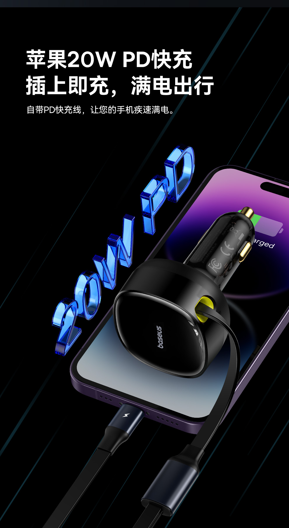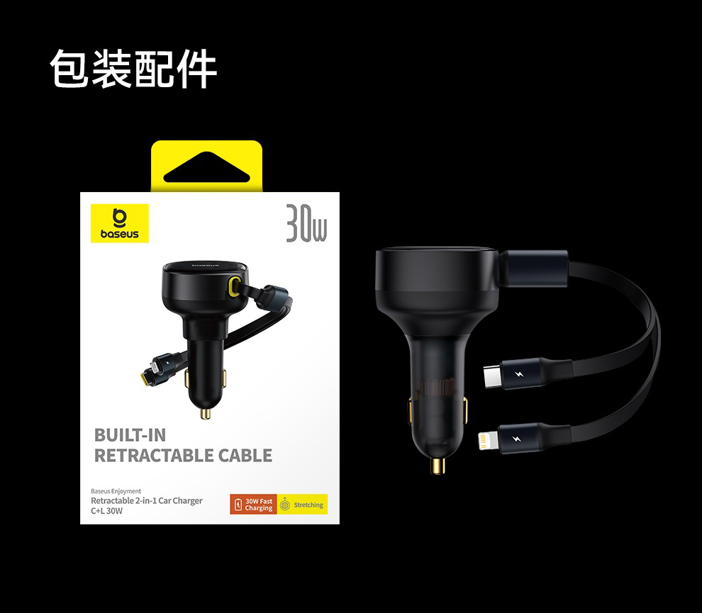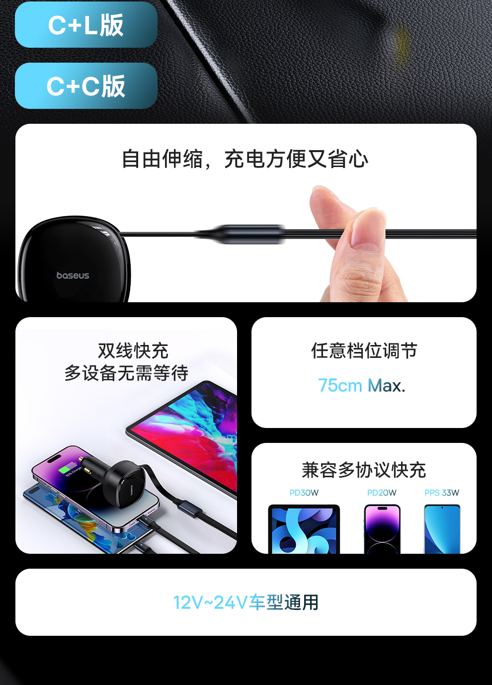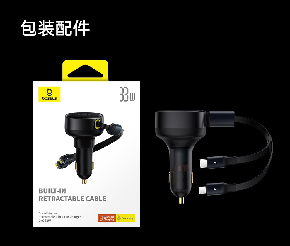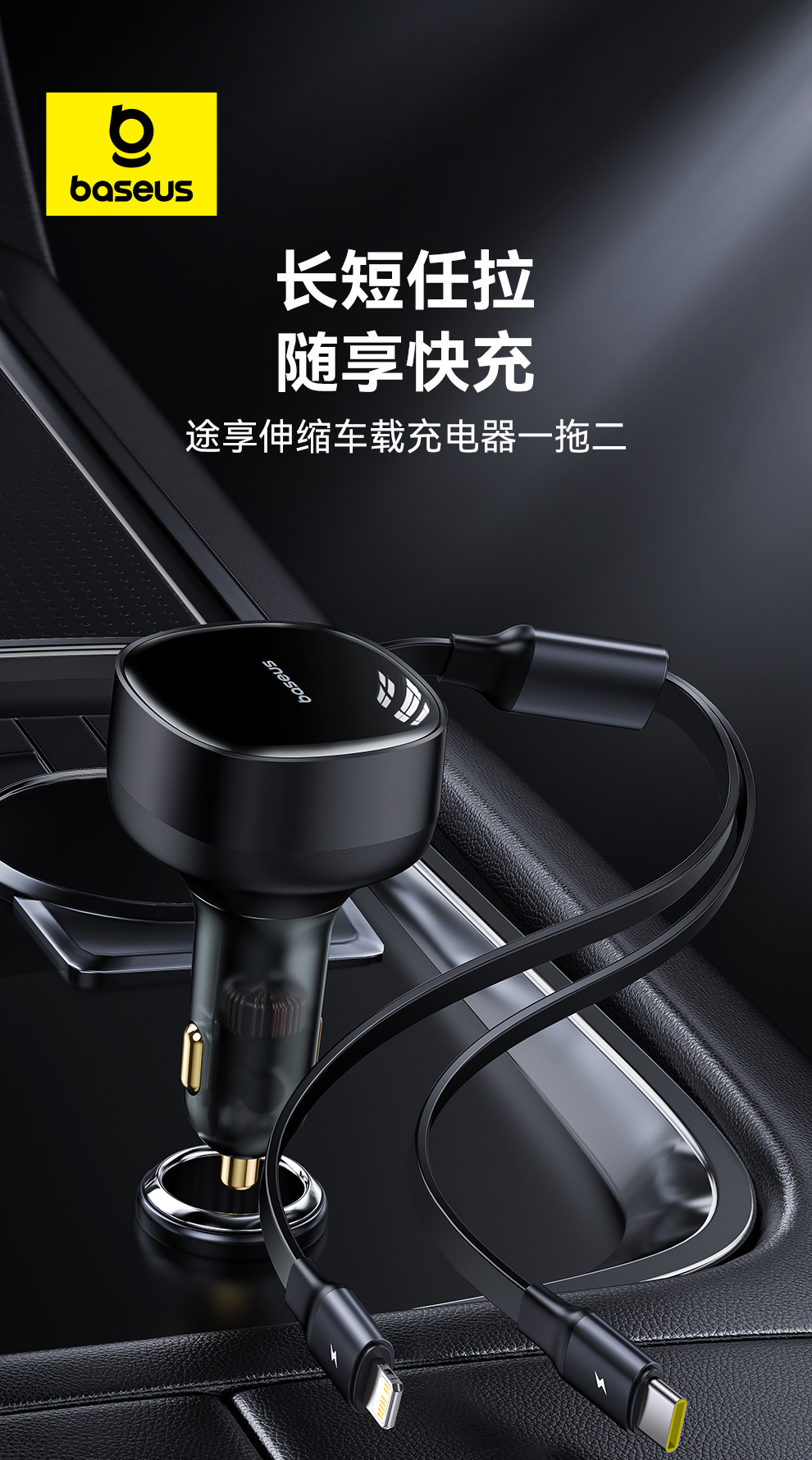 倍思 途享系列 伸缩车载充电器一拖二 2C 33W