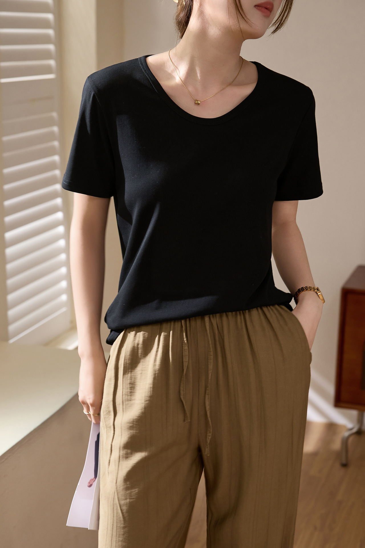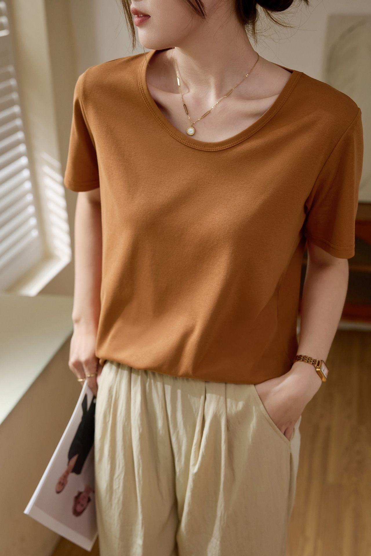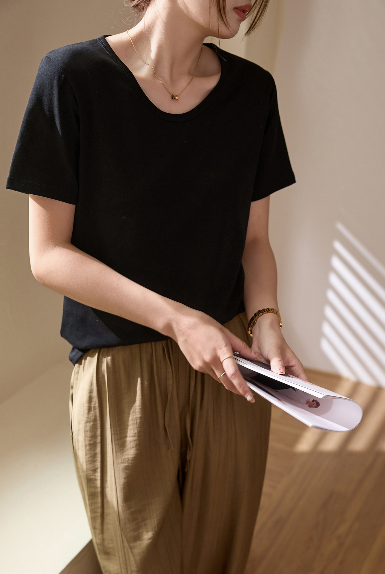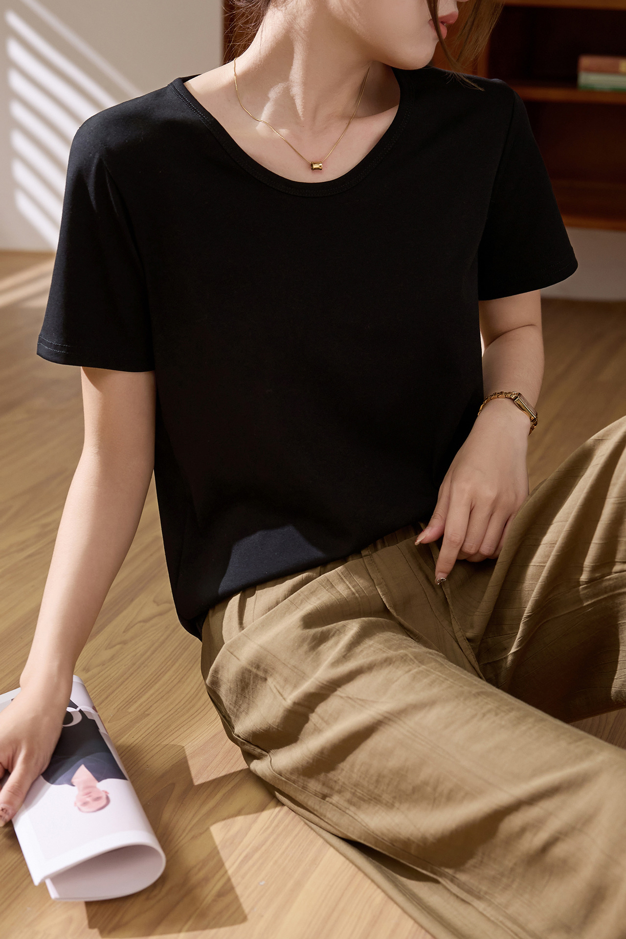 【甄选纯棉】大圆领T恤女夏装2024新款短袖宽松直筒百搭打底上衣_HLY