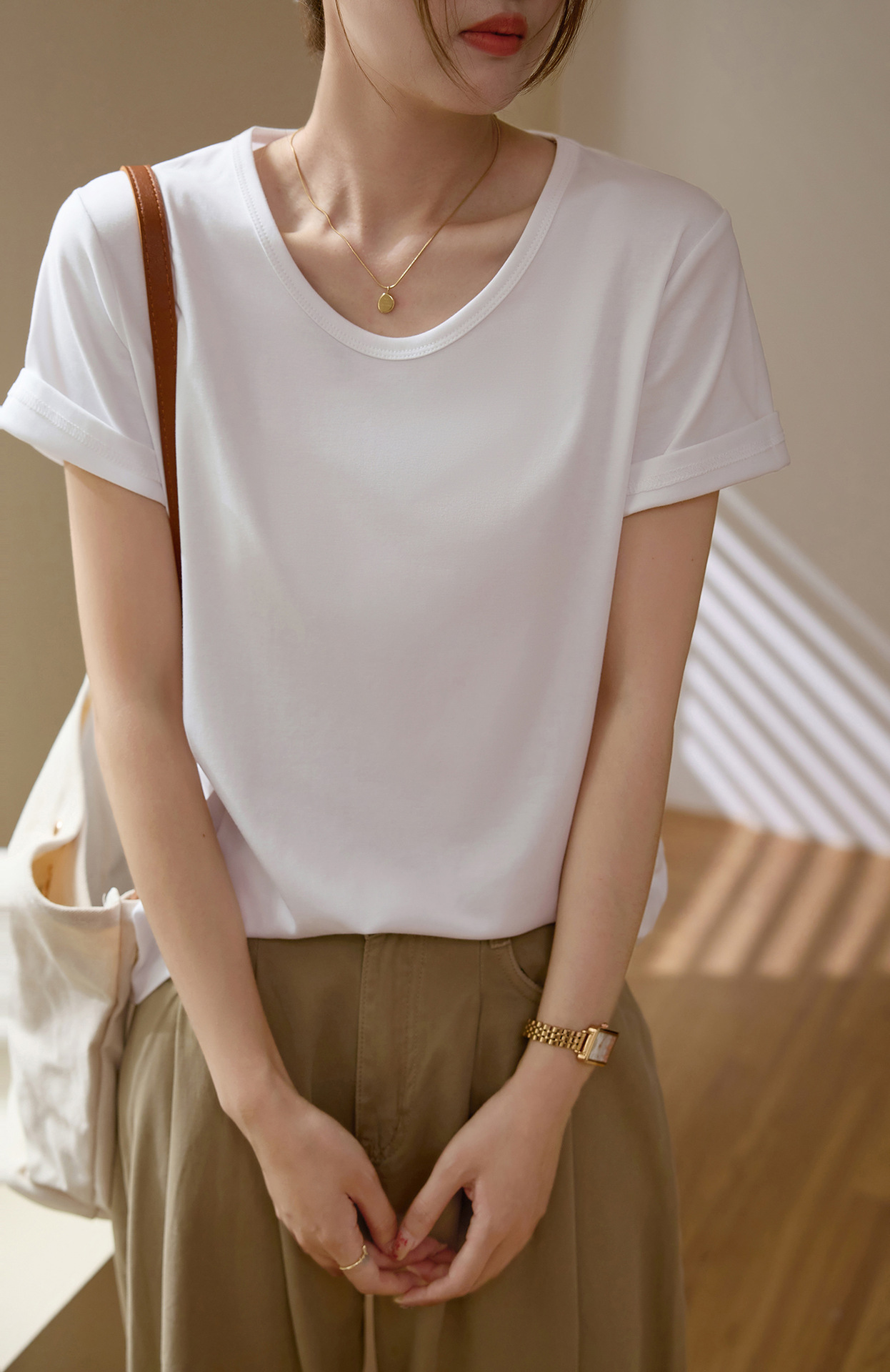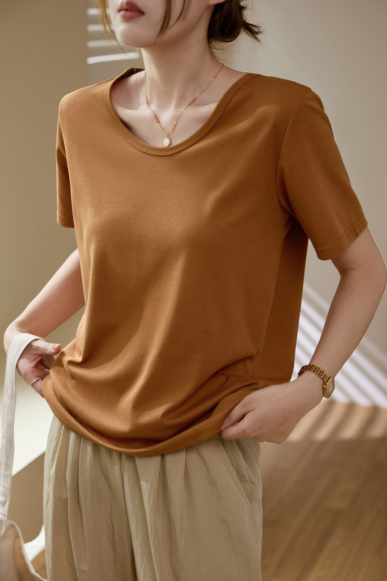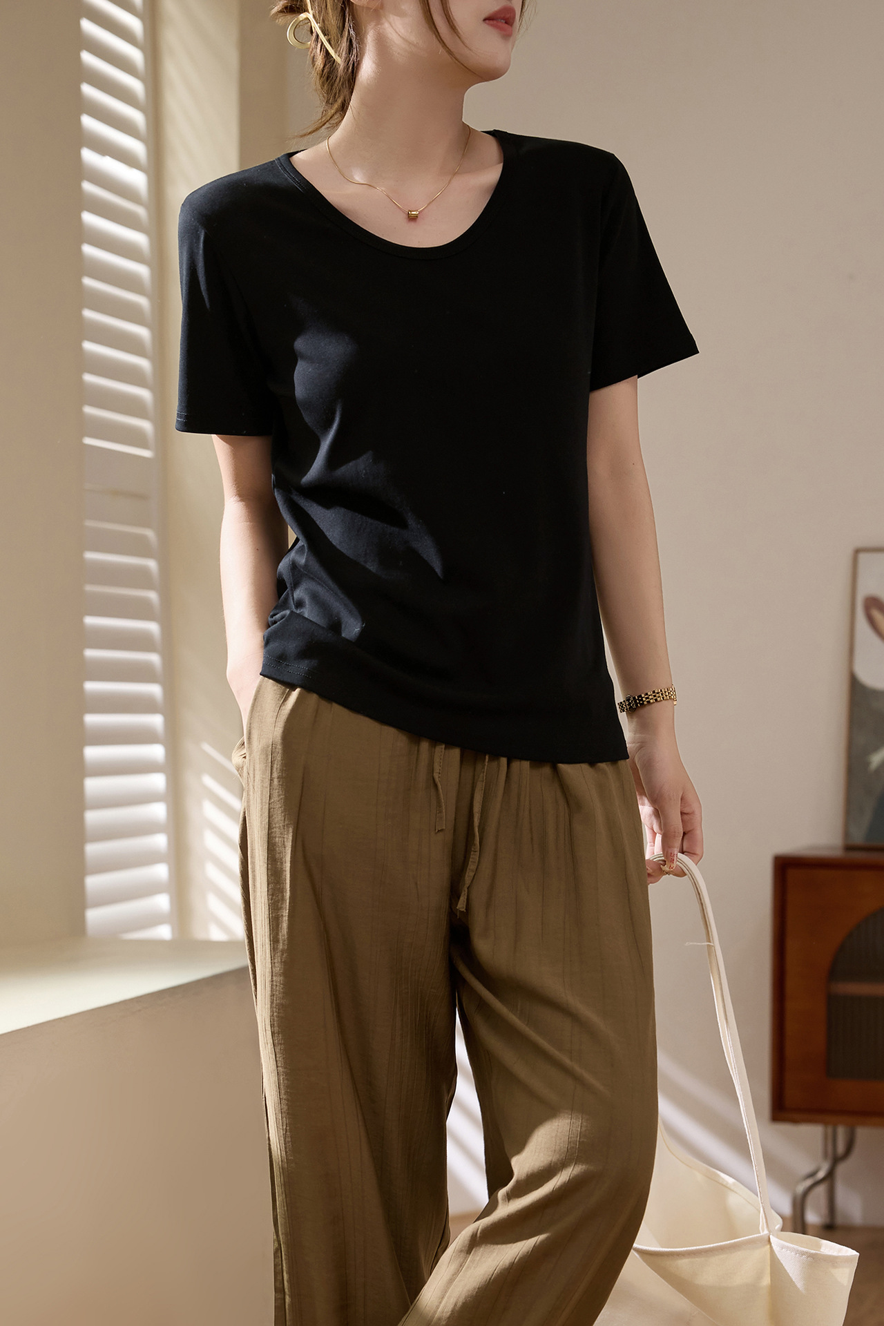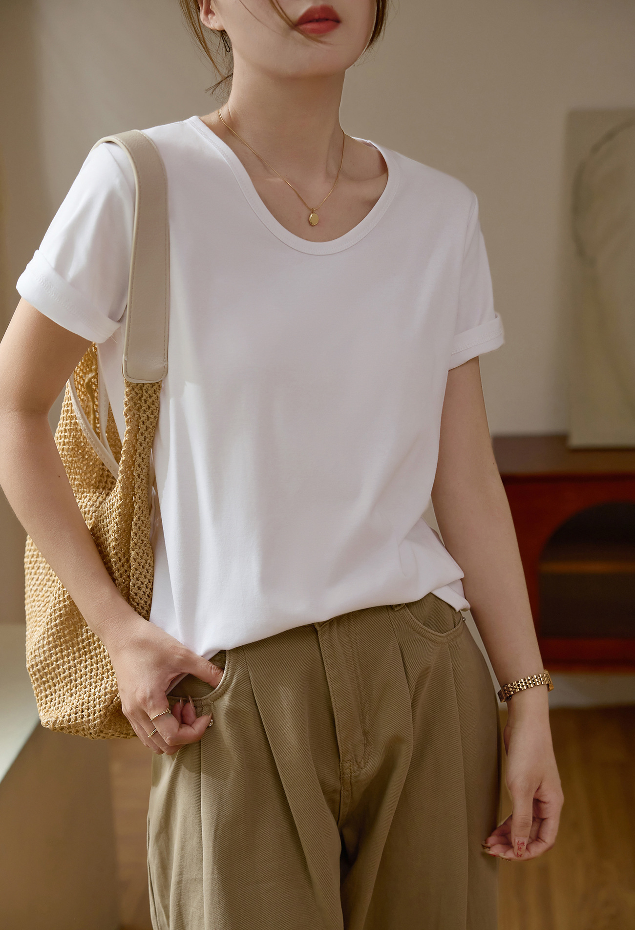 【甄选纯棉】大圆领T恤女夏装2024新款短袖宽松直筒百搭打底上衣_HLY