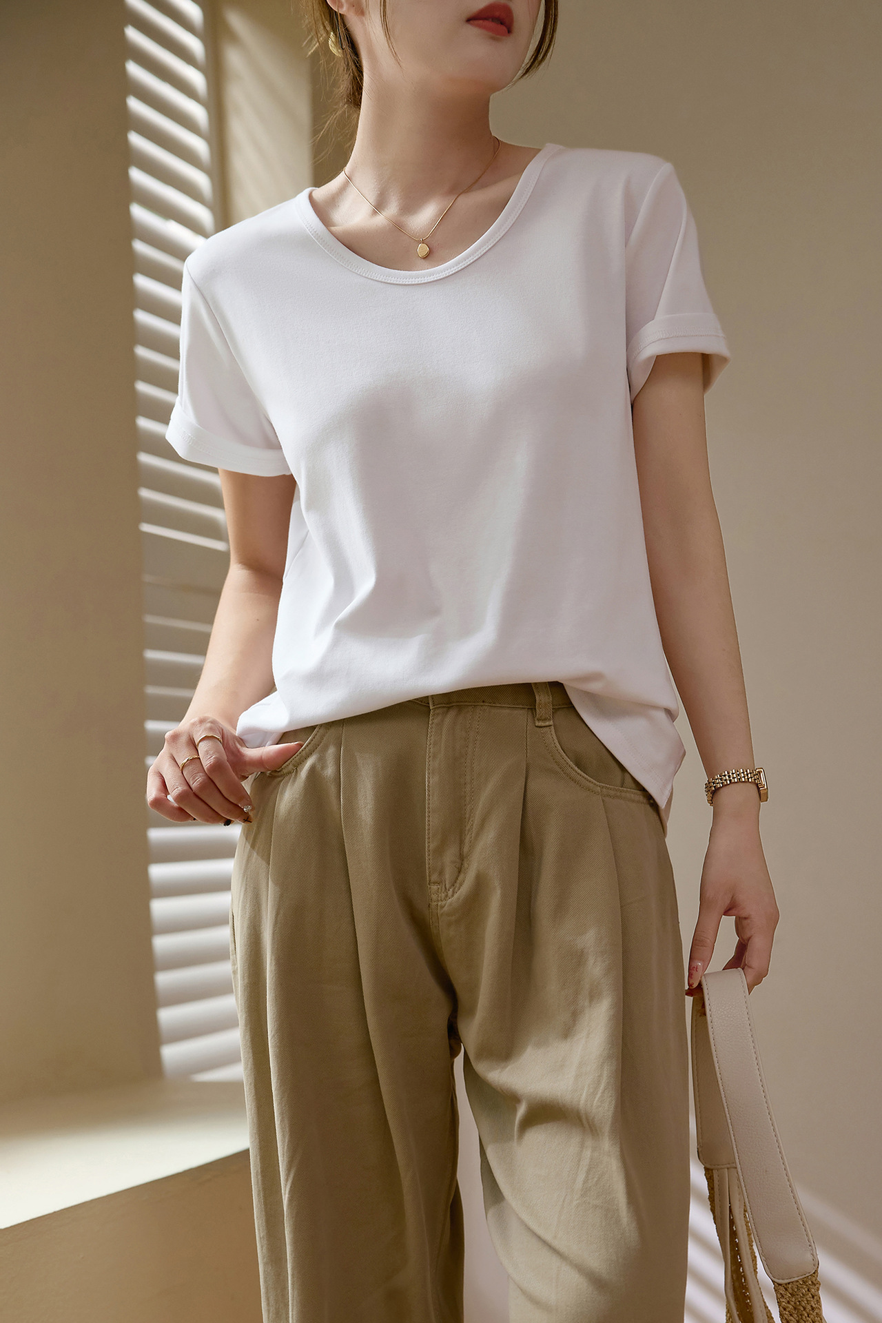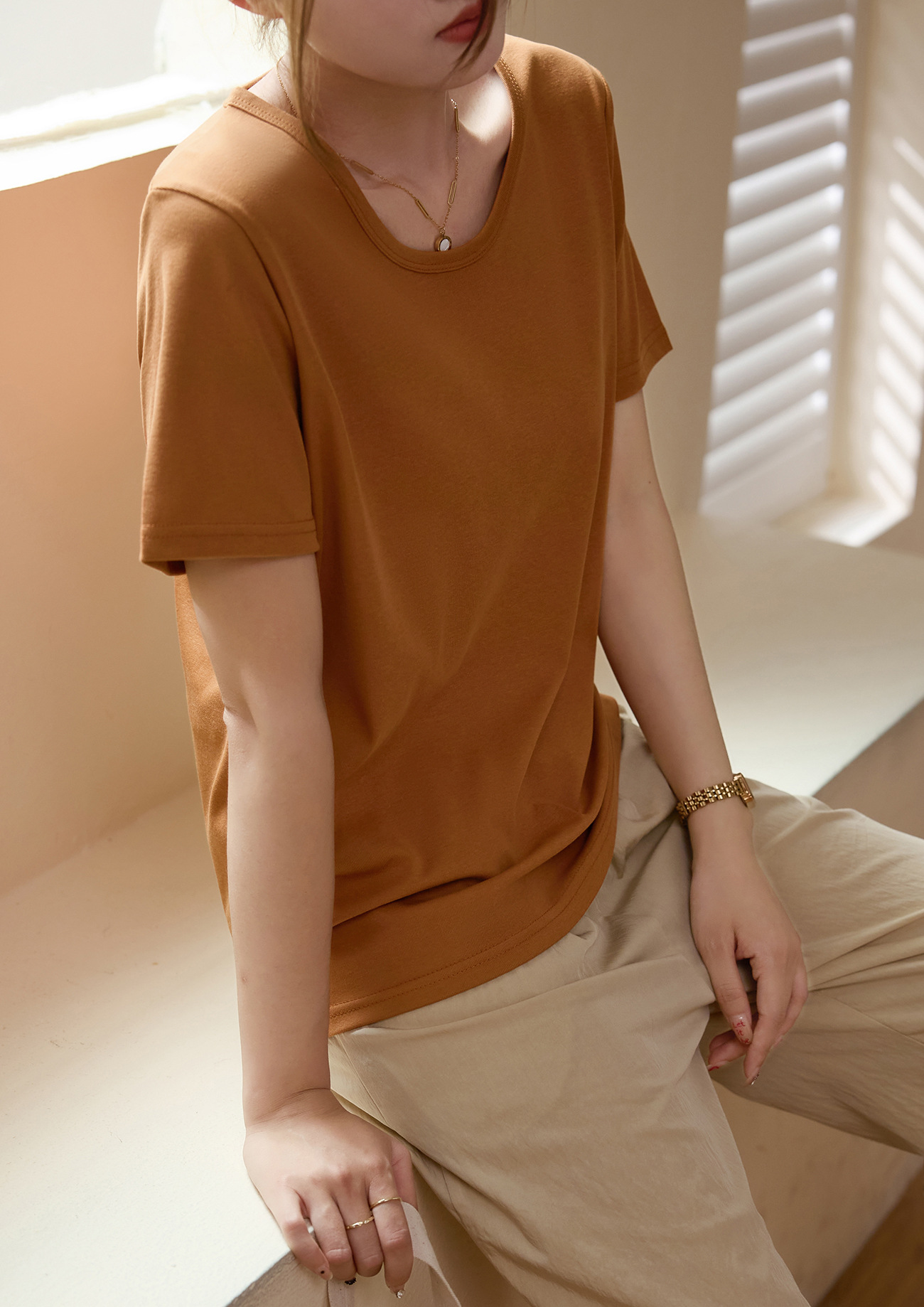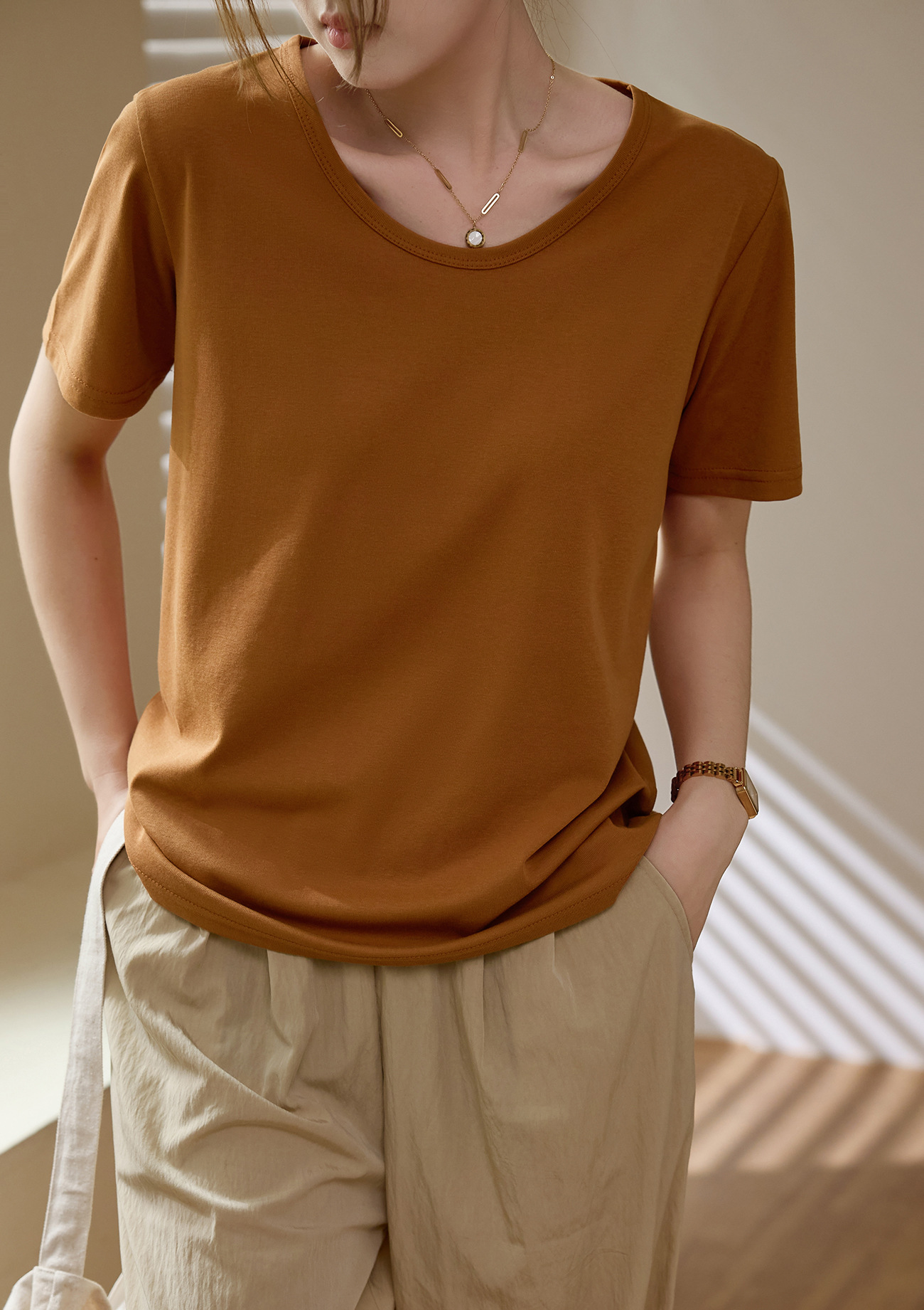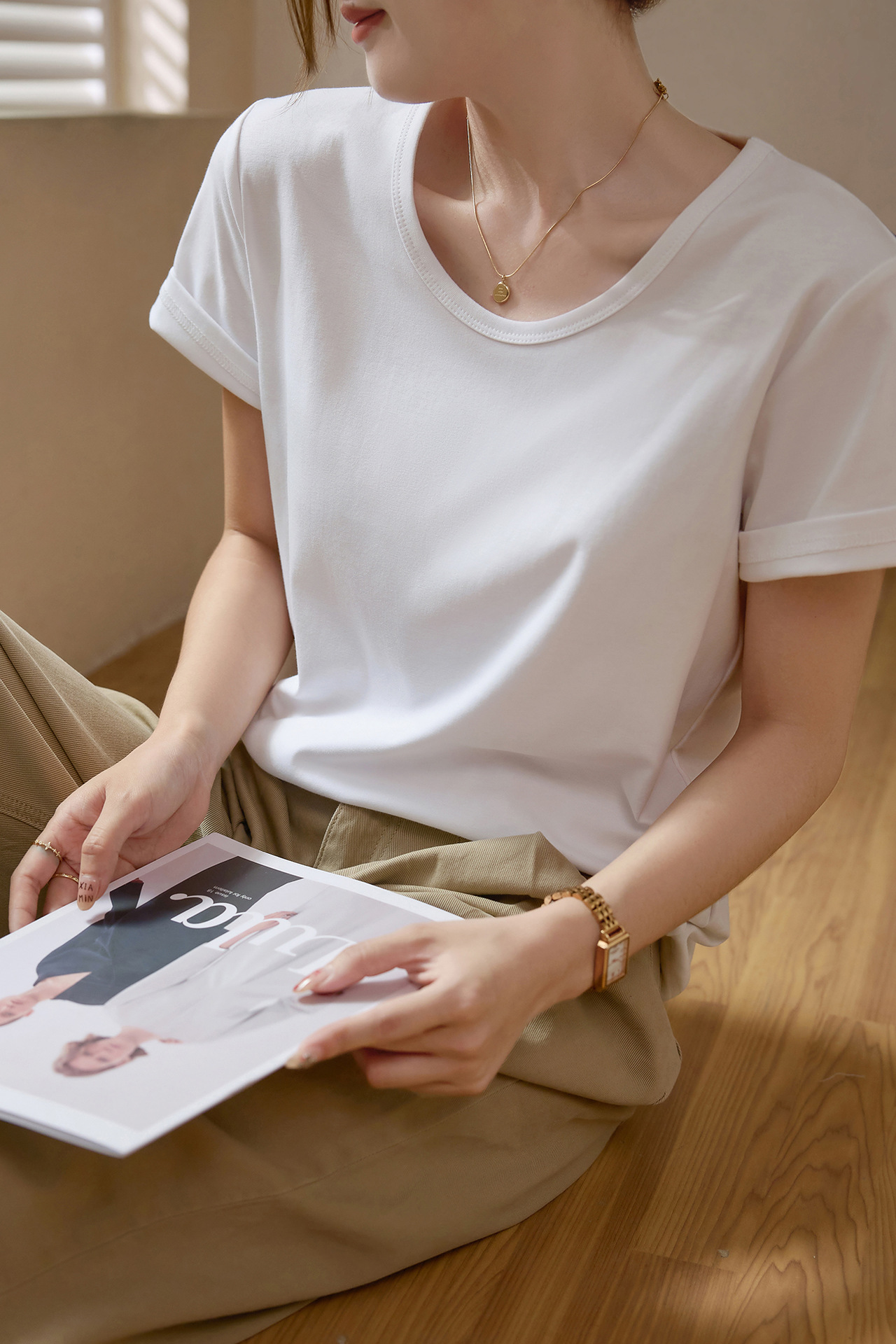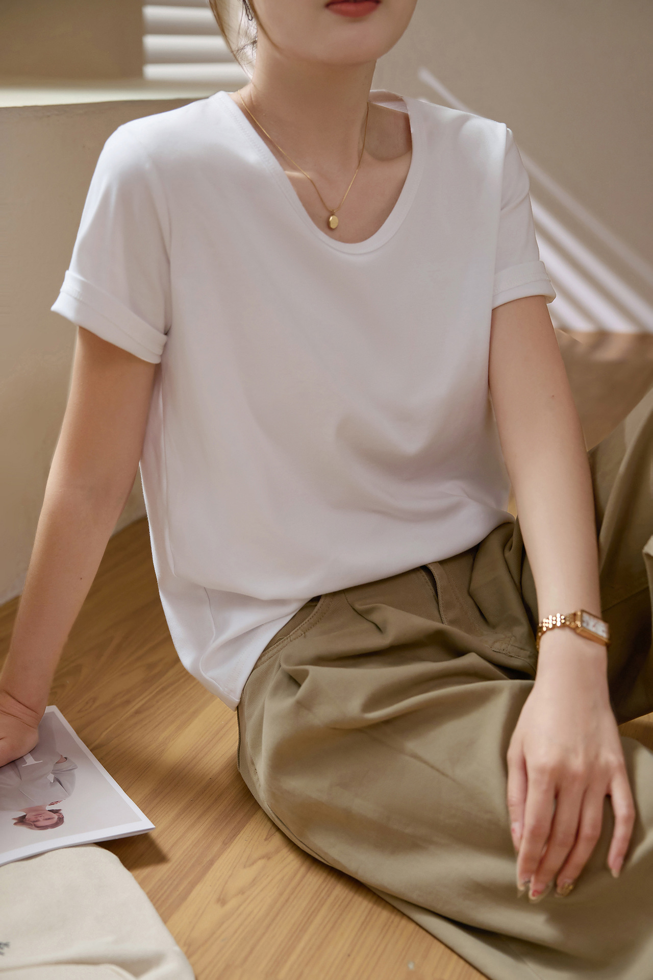【甄选纯棉】大圆领T恤女夏装2024新款短袖宽松直筒百搭打底上衣_HLY
