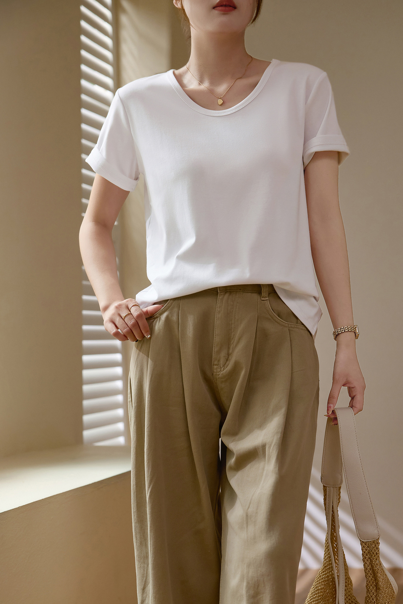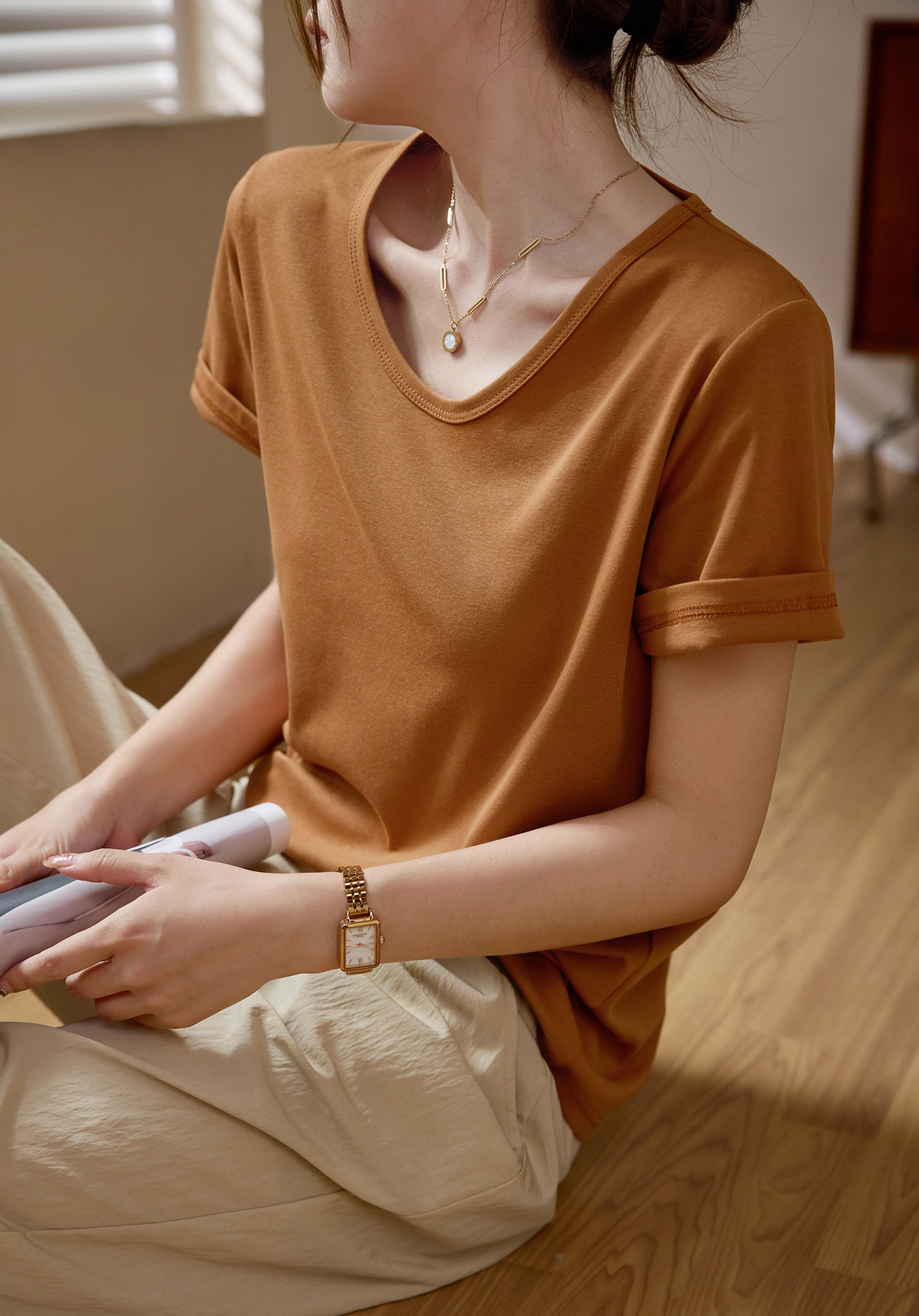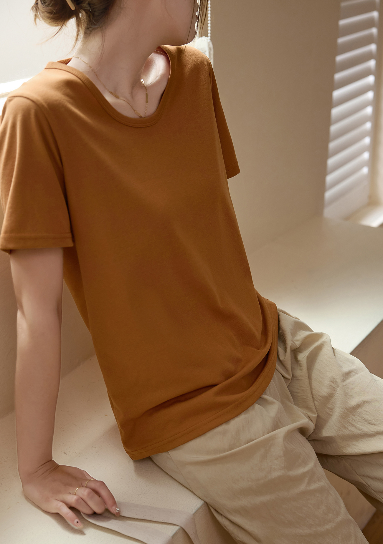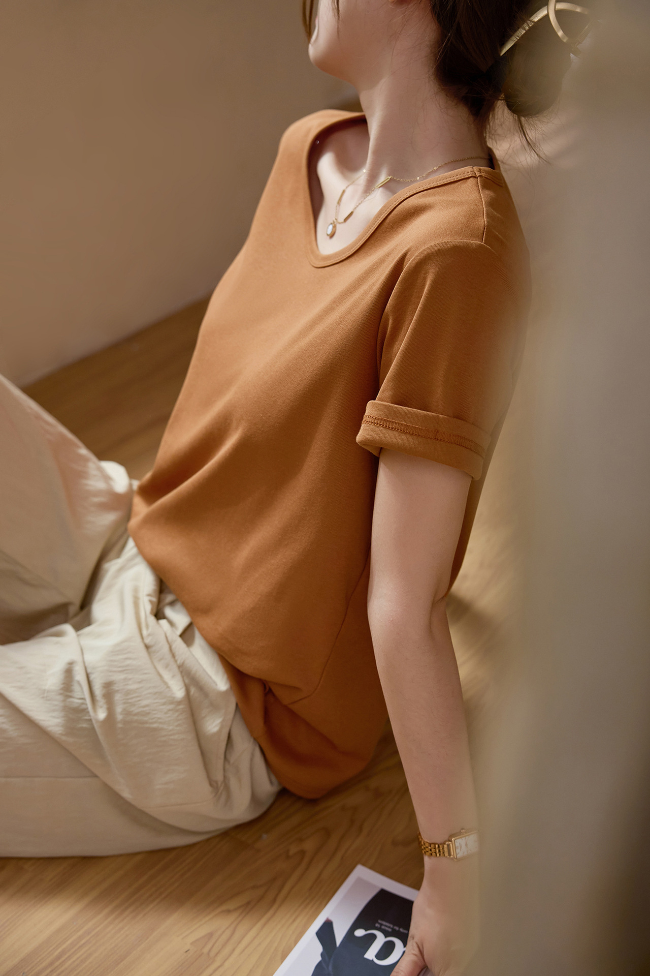 【甄选纯棉】大圆领T恤女夏装2024新款短袖宽松直筒百搭打底上衣_HLY