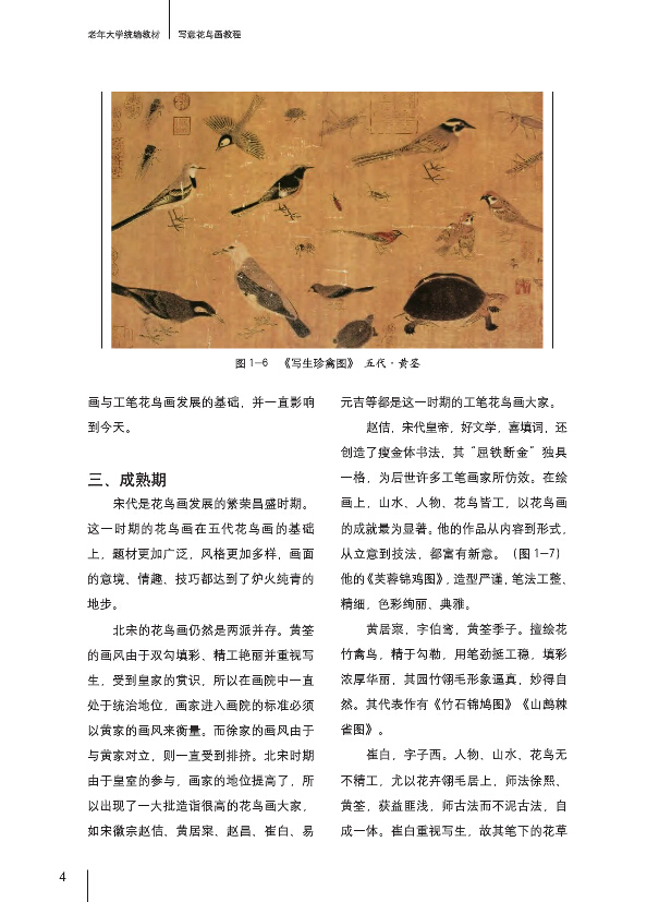 《老年大学统编教材:写意花鸟画教程》是在我们多年来老年大学教学经验的基础上,根据老年人学习写意花鸟画的特点编写的。教材力求知识系统全面,技法讲解详细,内容由浅入深。题材的选择尽量较全面地照顾到花鸟画的各个方面,对常见的重要的花鸟画题材尽量做到分步骤讲解,对其他花鸟画题材则讲求概括简练。在范画的选择上,我们采取编者绘画与经典名画相结合的方法,力求高标准、严要求。在教材的佳作欣赏部分r我们选取了历代有代表性的花鸟画作品数十幅,使大家能对写意花乌画的技法演变有一个全面的认识,并为大家提供一个清楚的临摹范本。