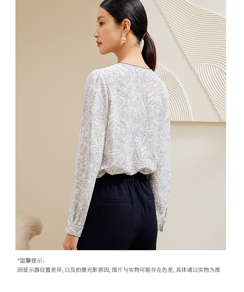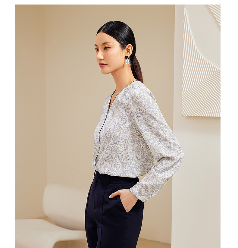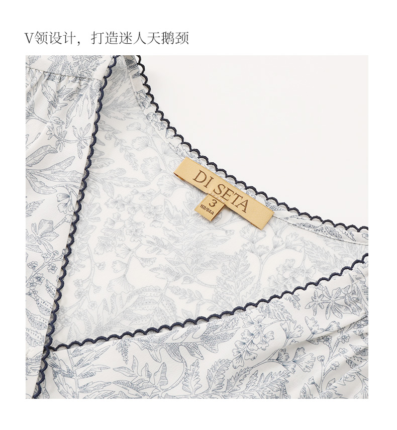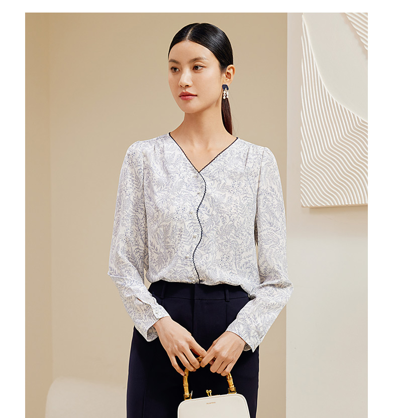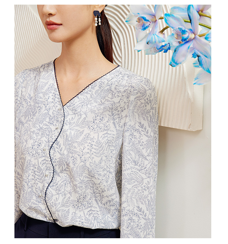 玳莎V领印花真丝衬衫女24早春新款波浪边设计感小众优雅气质小衫 EA31306