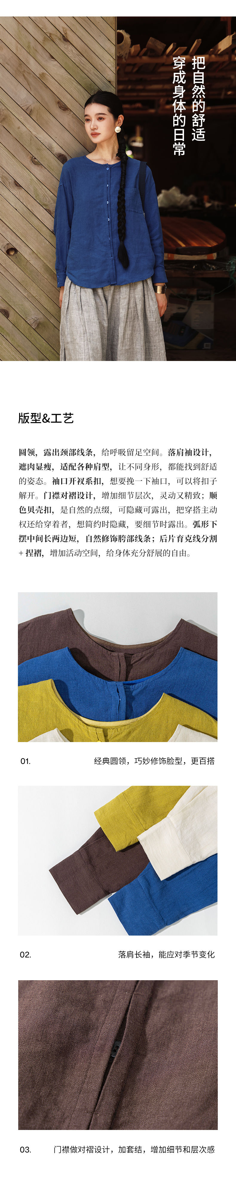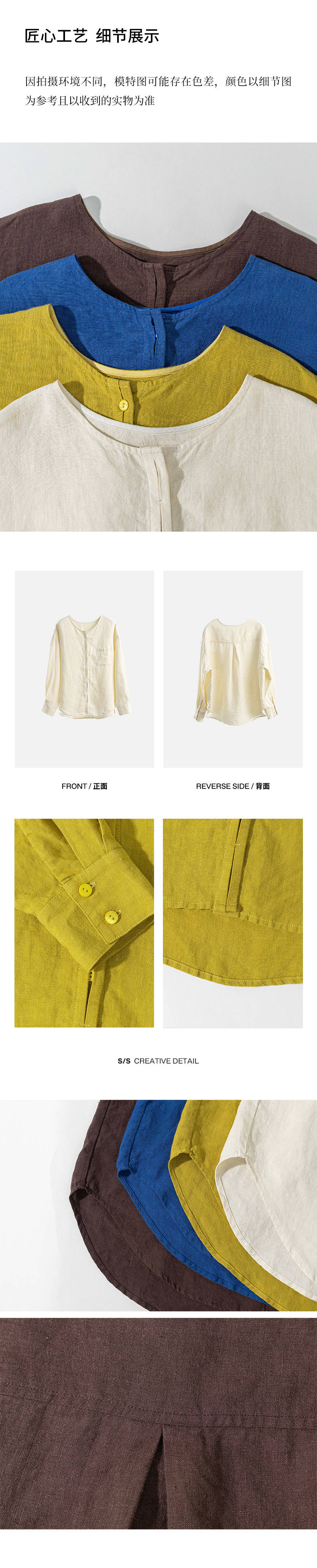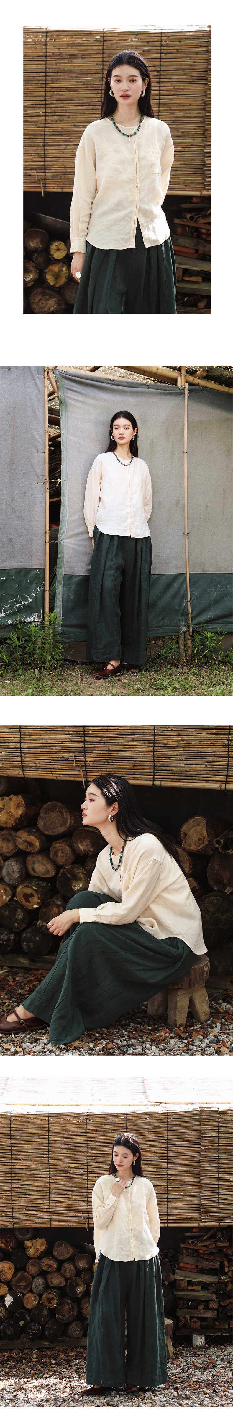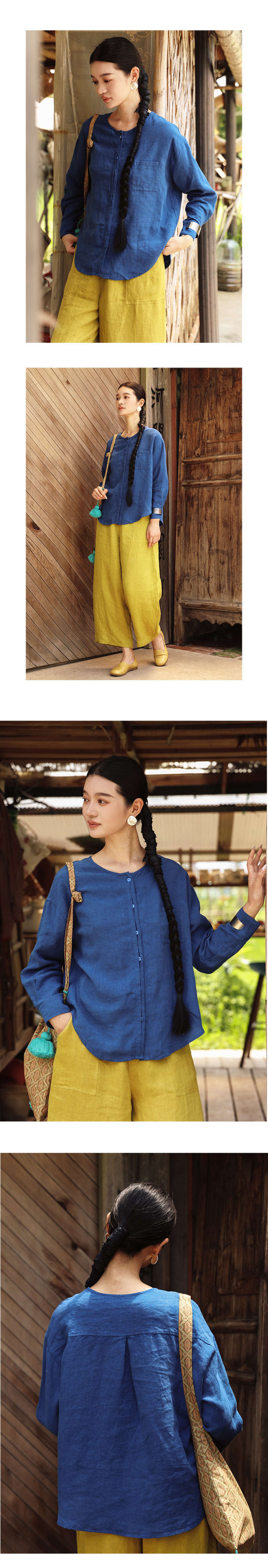 绽放女装507朵/【大山的褶皱】砂洗亚麻圆领开襟落肩长袖口袋衬衫