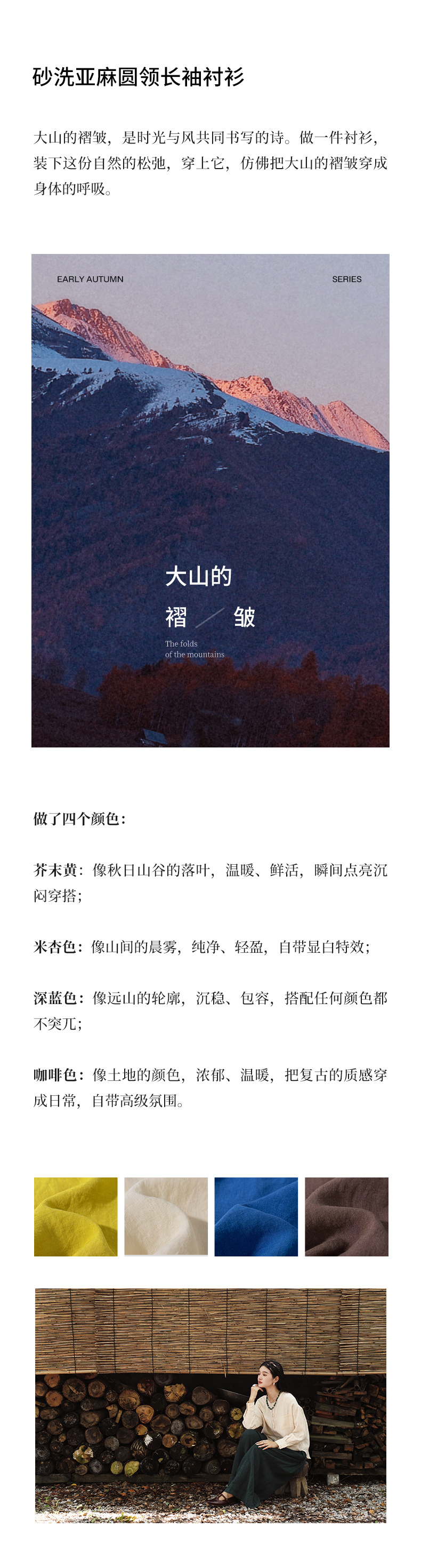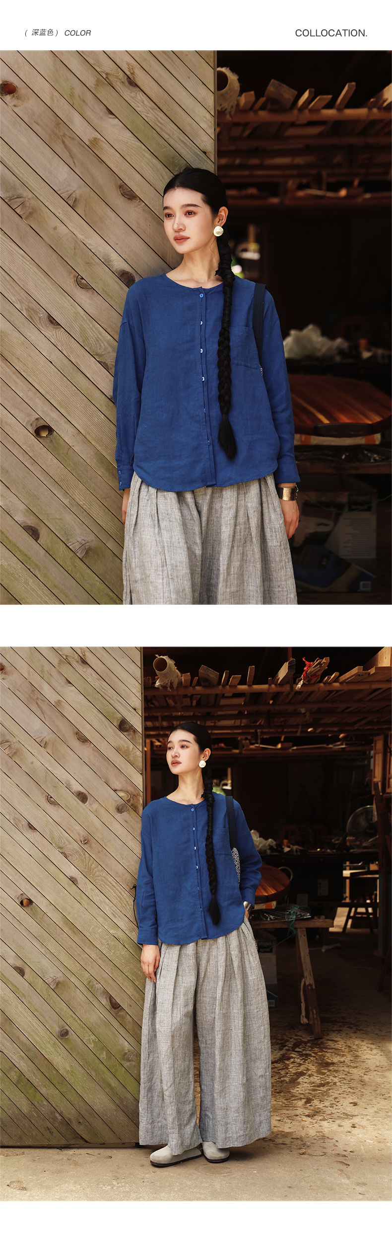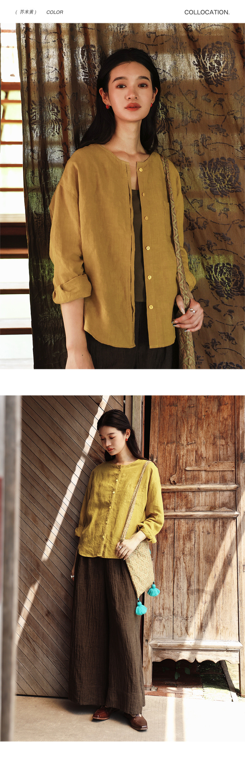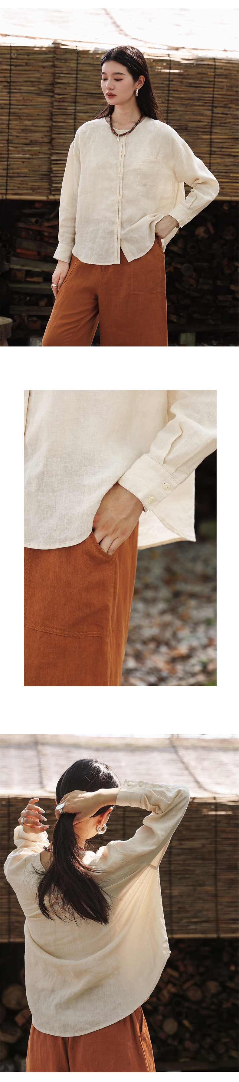 绽放女装507朵/【大山的褶皱】砂洗亚麻圆领开襟落肩长袖口袋衬衫