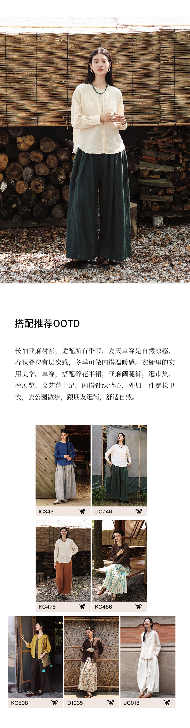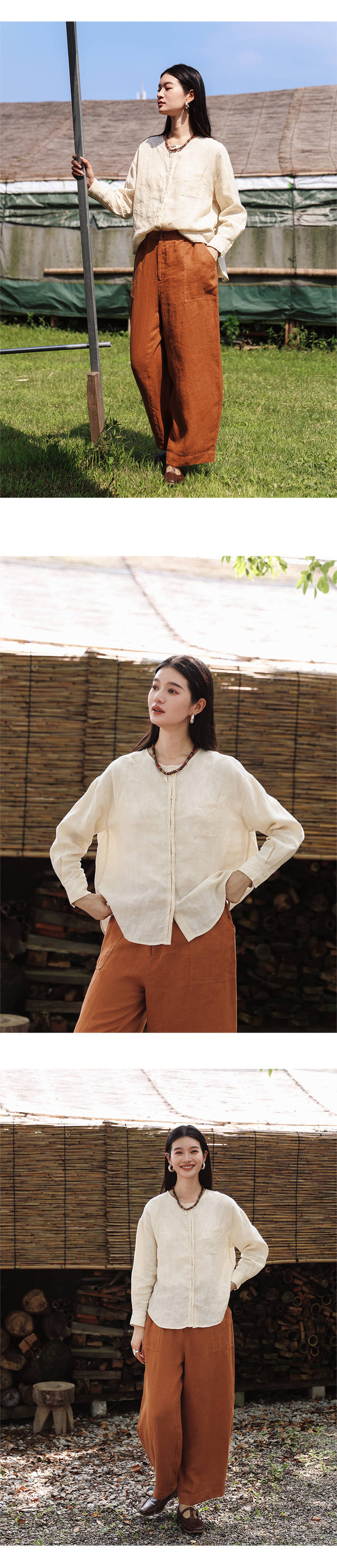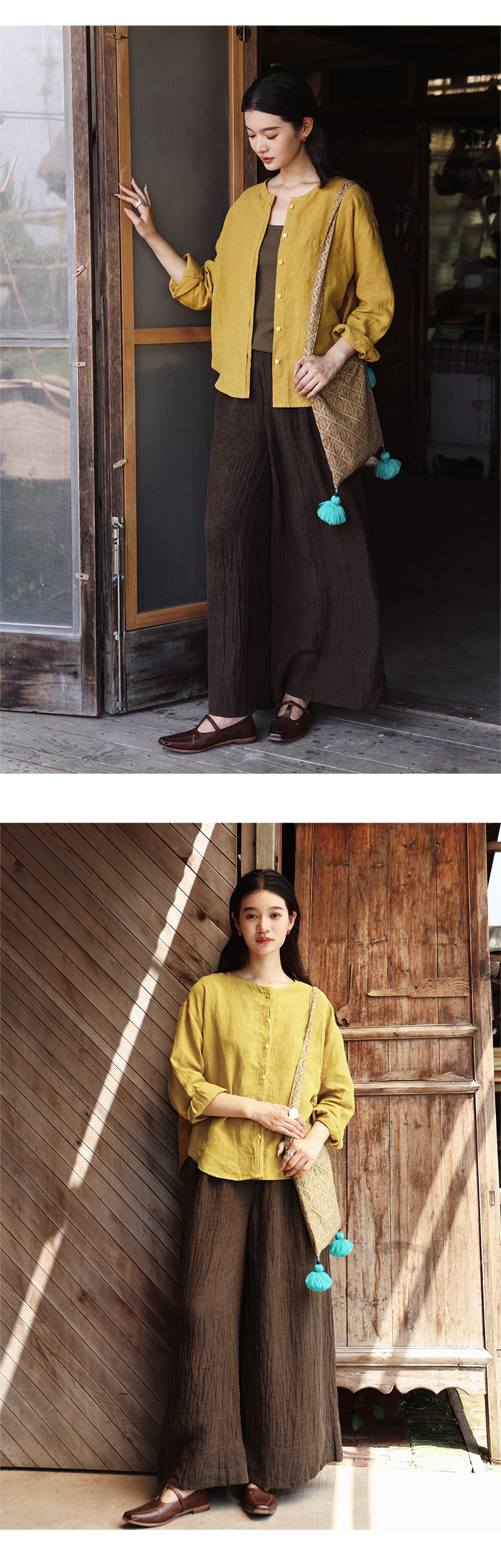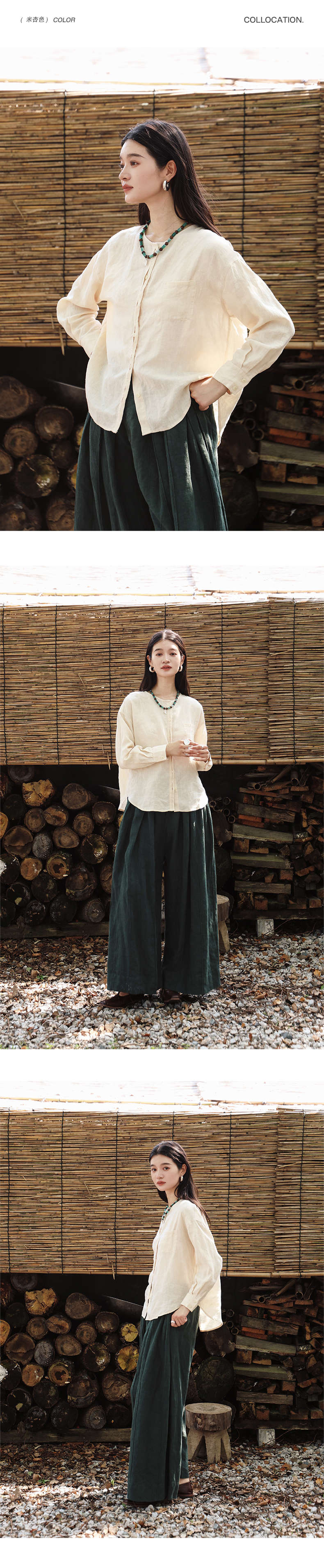 绽放女装507朵/【大山的褶皱】砂洗亚麻圆领开襟落肩长袖口袋衬衫
