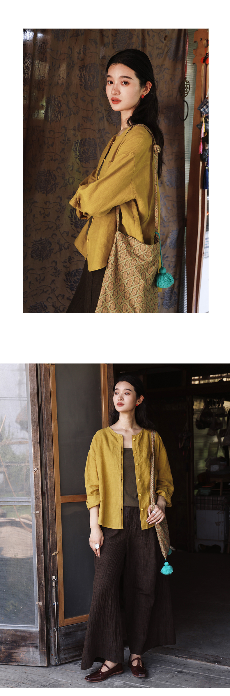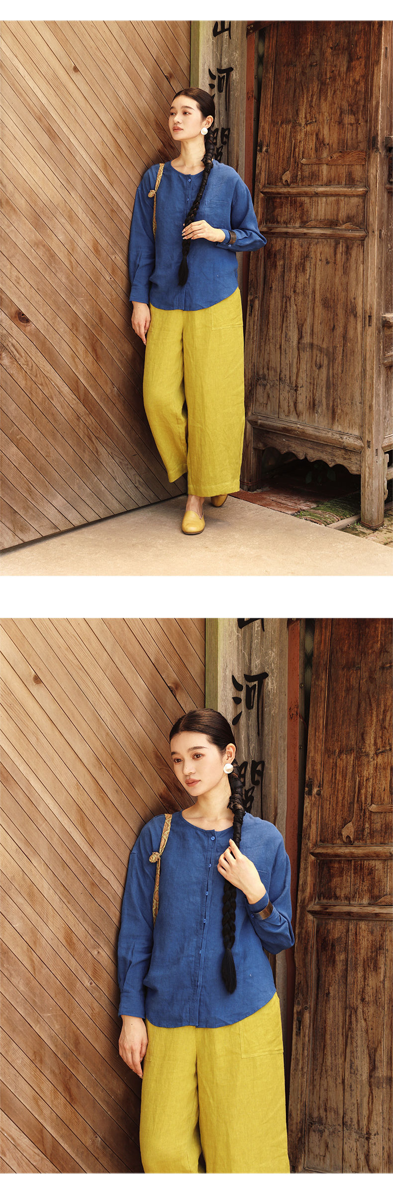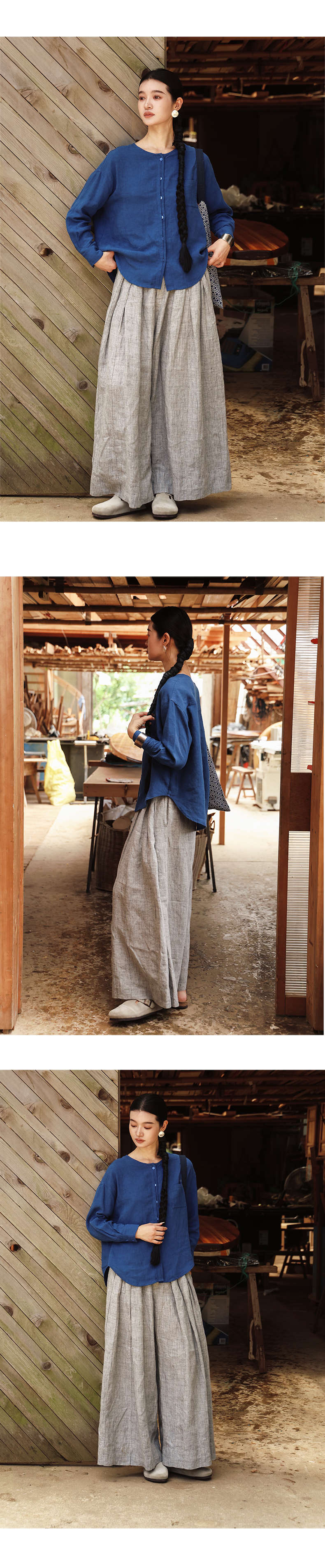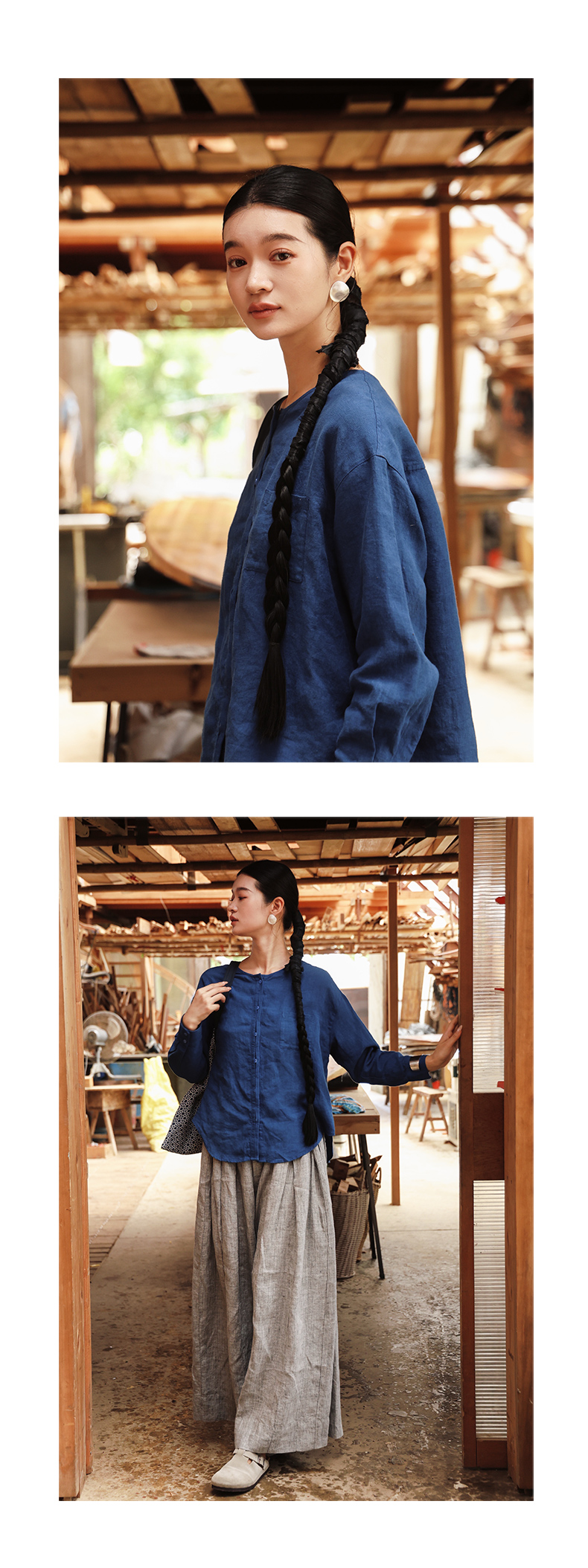 绽放女装507朵/【大山的褶皱】砂洗亚麻圆领开襟落肩长袖口袋衬衫