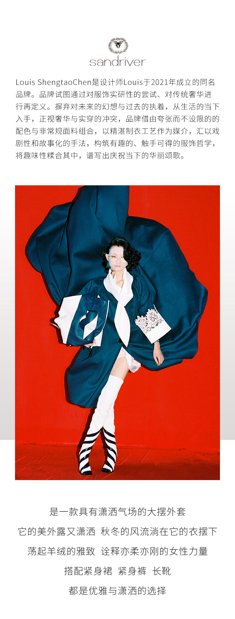 - 历年在巴黎时装周亮相,享誉世界的艺术羊绒品牌[Sandriver 沙涓]由羊绒布道者郭秀玲女士创立。阿拉善自有牧场纯种羔羊绒,日本国宝设计师小筱顺子,上海自有基地精工细作。承载羊绒情怀,坚持匠人品质。