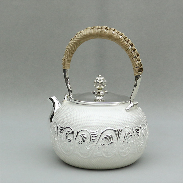 短壶流,莲花钮盖,乳白哑光散打饰壶身,太阳鸟玄翼纹饰环布,壶身并作高抛光处理,将银制特性与原古纹饰完美结合,呈现现代工匠艺术高超手法。提梁作绳编护手,适作茶道高端器具。