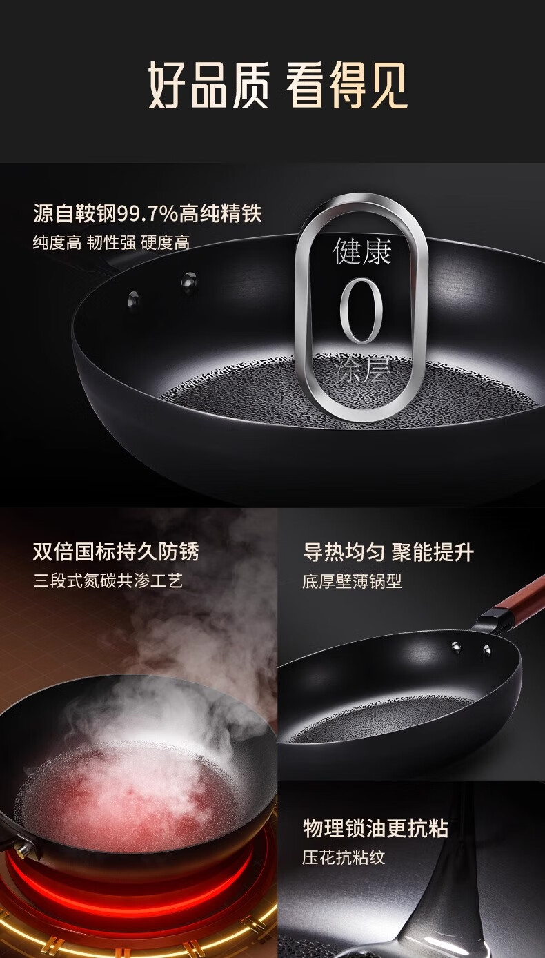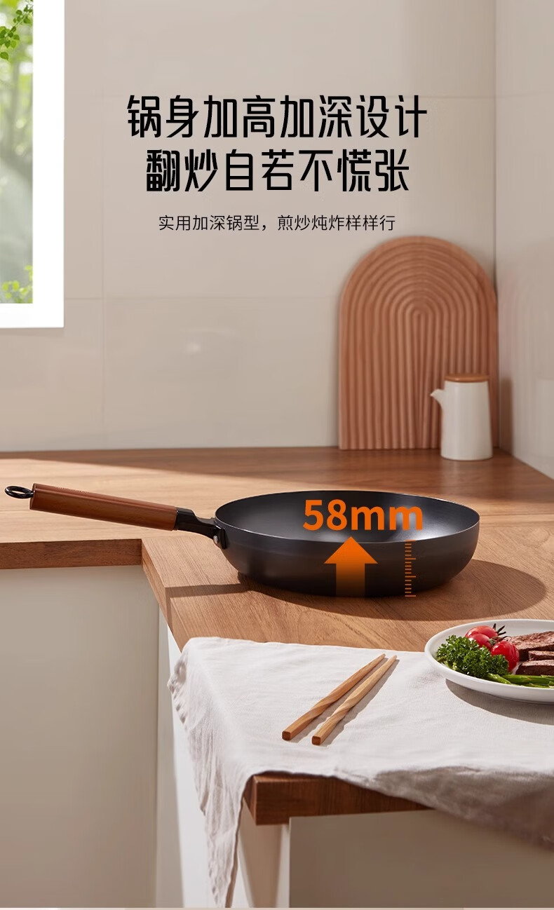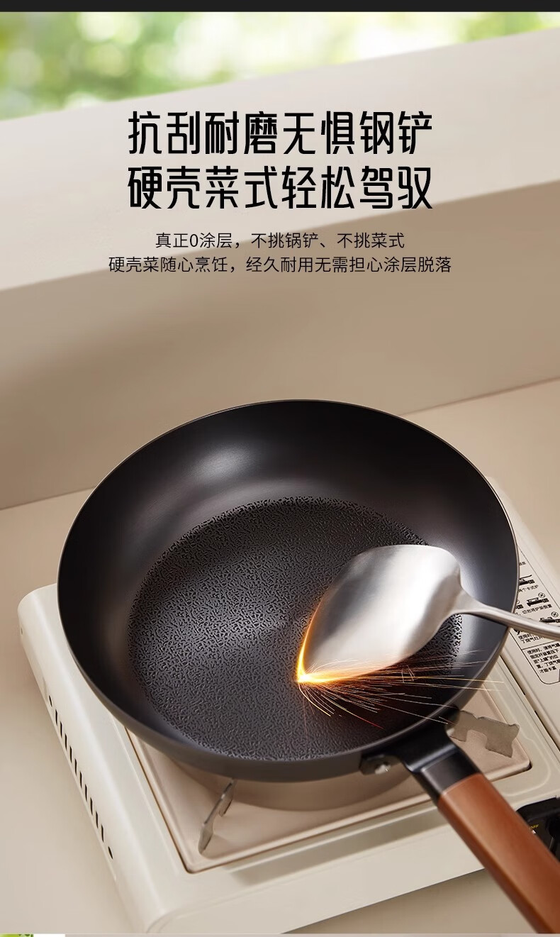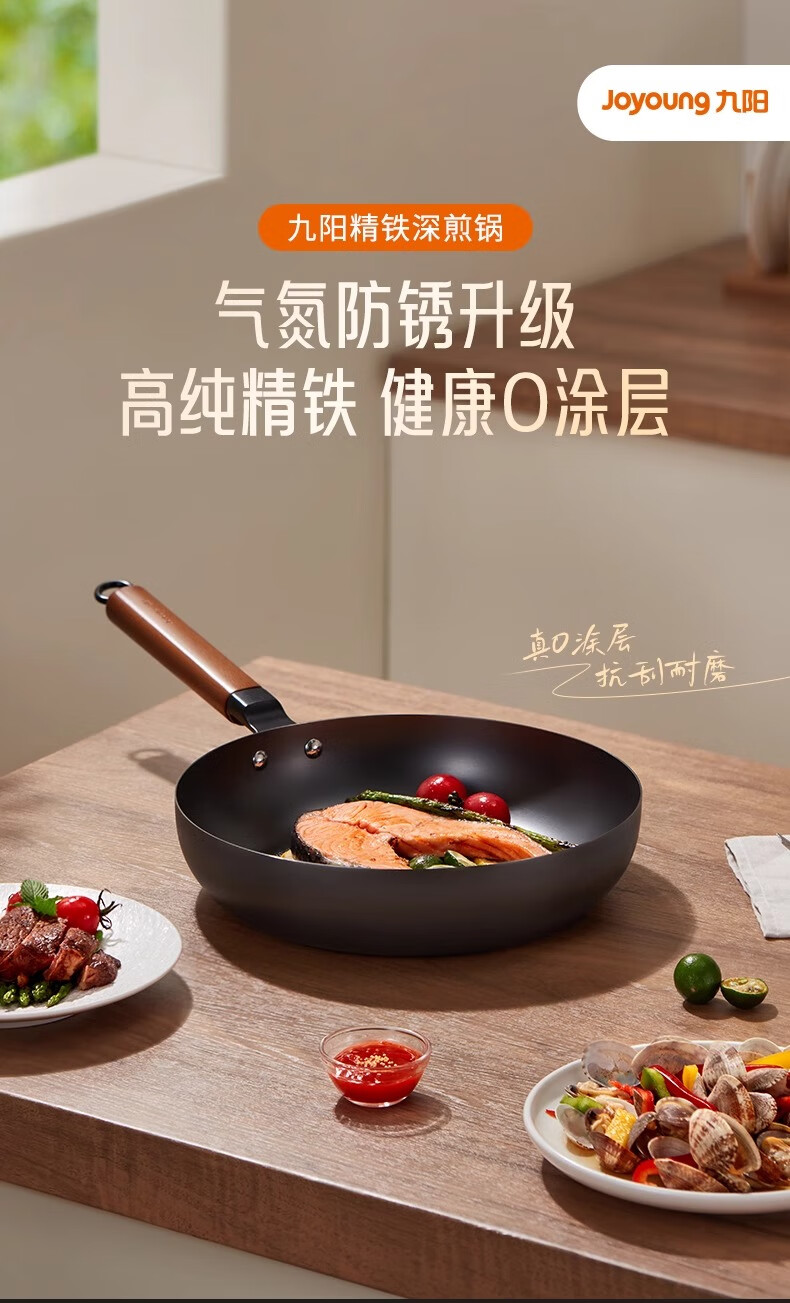 九阳精铁深煎锅0无涂层平底炒菜锅老式家用燃气灶电磁炉通用铁锅