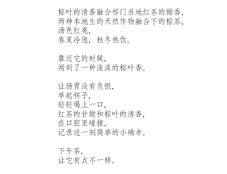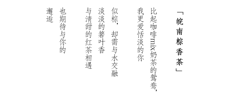 浔隐山皖南粽香茶是以安徽黄山当地两种天然作物融合而成。茶叶是祁门槠叶种茶树鲜叶通过萎凋、揉捻、发酵、干燥等工艺制成初制茶后,再经过三个流程十二道工序制作分级拼配制作的祁门红茶,也是闻名遐迩了!而包裹的“粽叶”则是由箬叶鲜叶经天然晾晒,由拥有几十年包粽匠人手工包制。不同于单一的祁门红茶,粽香茶泡水后,汤色红亮,粽叶与红茶的两种清香相互交融,非常赞!
